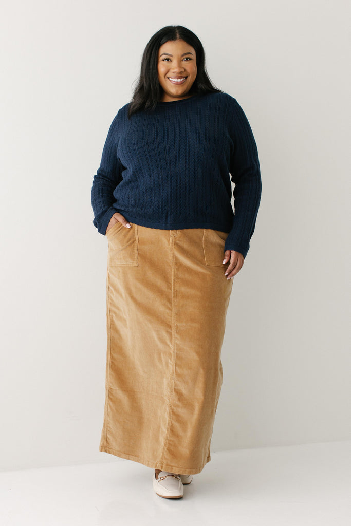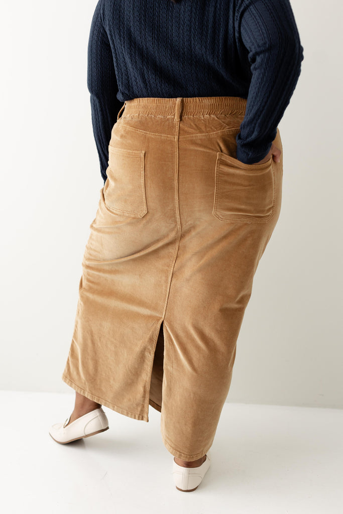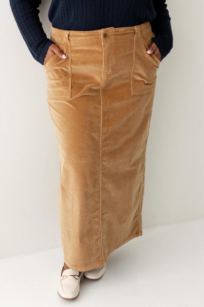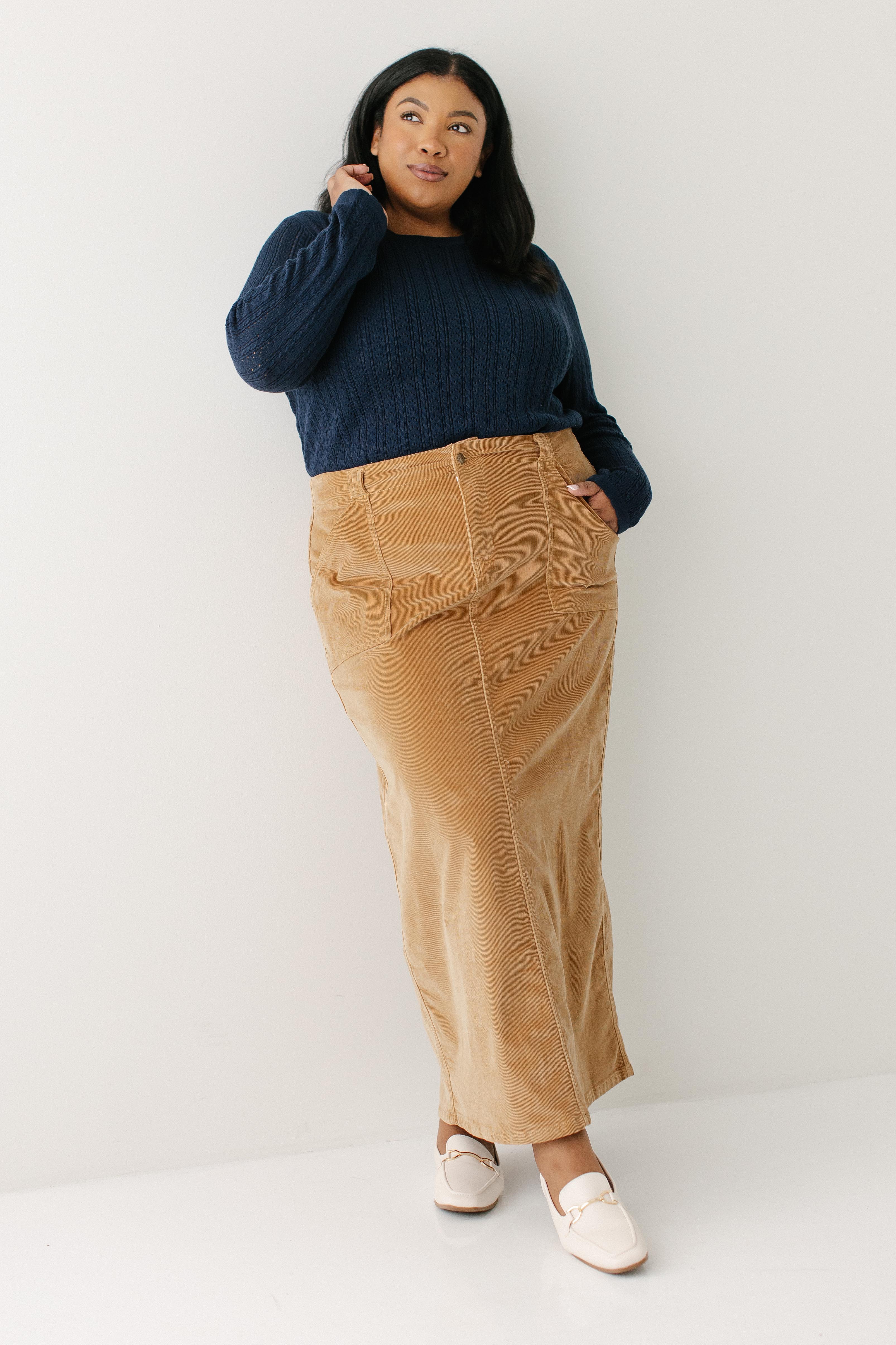 There might not be any item that exudes fall more than a corduroy skirt! The 'Autumn' Corduroy Maxi Length Skirt is sure to become a staple in your wardrobe this season! Made out of the softest ribbed corduroy, the skirt features functional pockets, a stretchy back waistband, back slit for ease of movement, and a classic button + zipper closure in front. Choose from two versatile shades: warm khaki or charcoal gray. You may just need one of each! Pair the 'Autumn' with all of your favorite neutral sweaters and tops for a perfectly cozy fall outfit. Exclusively designed by us with you in mind!
