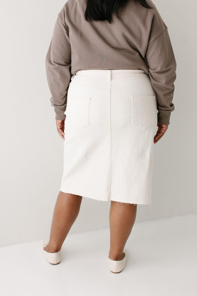 Trends come and go but denim remains a wardrobe staple! What sets the 'Parker' Denim Skirt apart from the rest? Quality, structured denim, below-the-knee length, and a raw hem for the finishing touch! This timeless denim in alabaster creates endless opportunities for your unique style. Designed for everyday wear with functional front and back pockets and a high waist design that will have you feeling put together all day long. The raw hem can easily be cut to make this skirt your desired length! Exclusively designed by us for you!