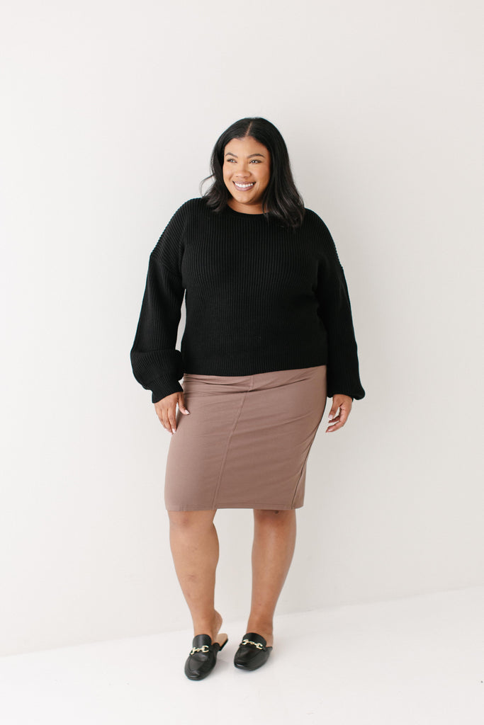 Soft, stretchy, and comfortable, but with the look of real denim, we think this knee-length knit skirt will quickly become one of your favorites!