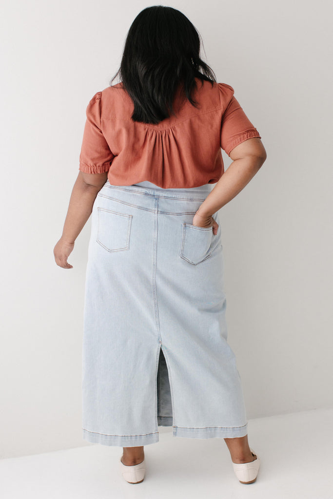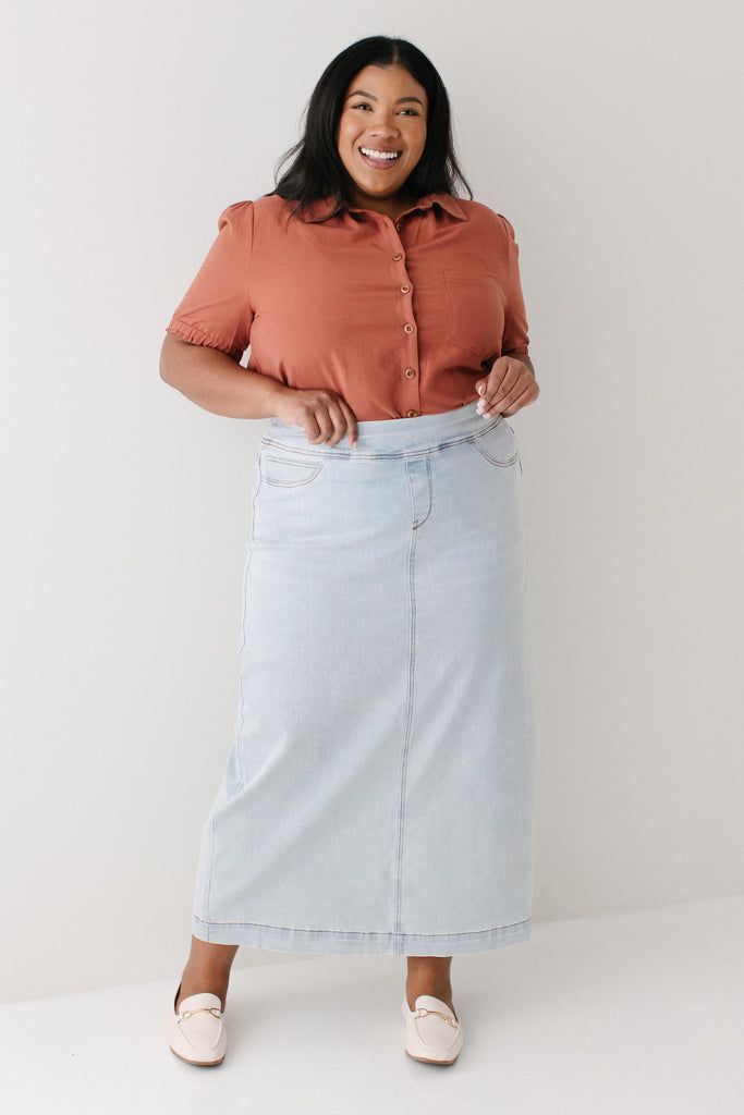 Simple lines, classic and comfortable, the 'Sara' is everything a denim skirt should be. Wide waistband for extra comfort and ease of styling. Exclusively designed by us for you.