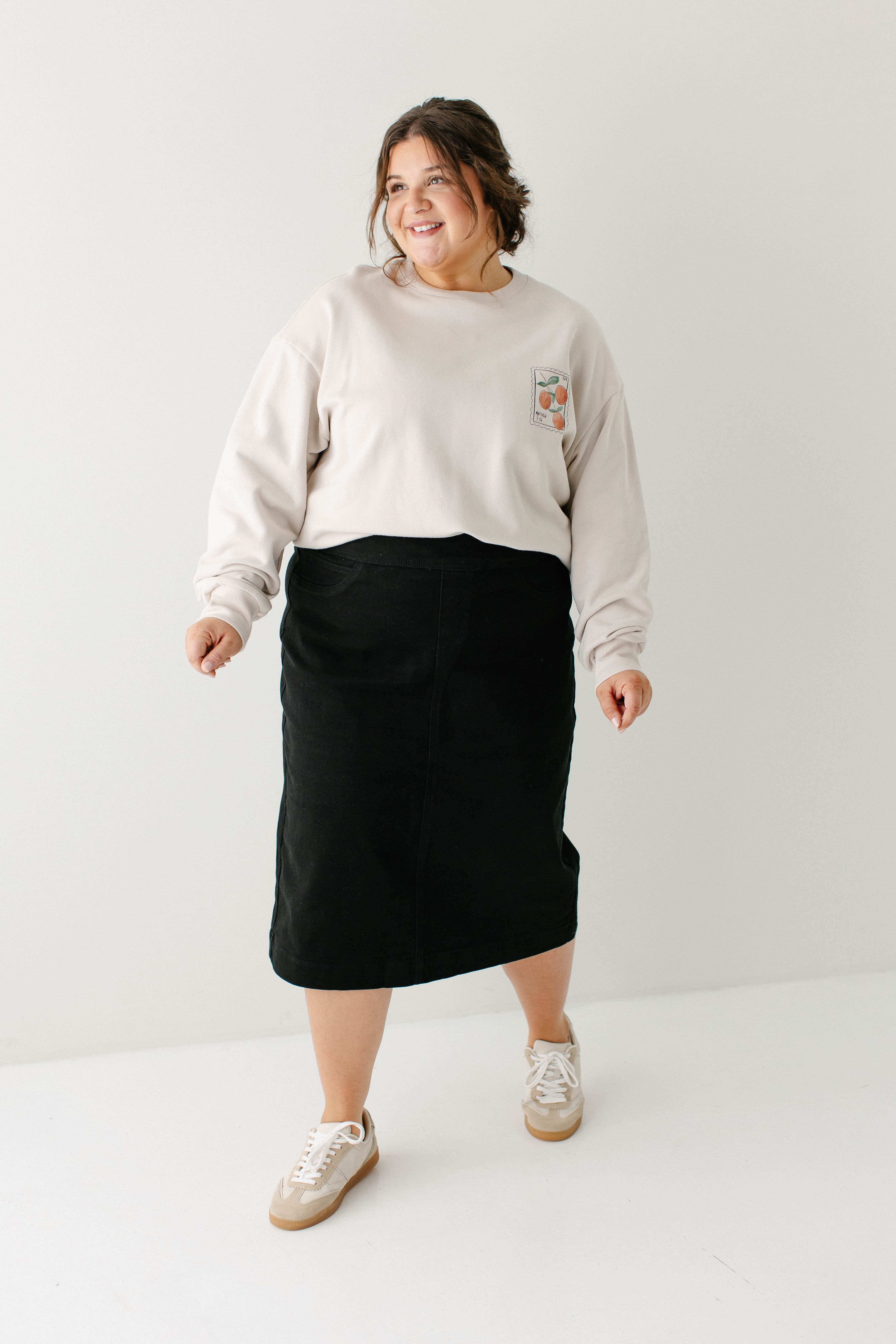 The classic 'Sara' Skirt that you love, now in an updated stretch fabric for ultimate comfort! This easy, pull-on style skirt features a wide waistband, faux-front pockets and modest midi-length making it the perfect pick for running to the grocery store or taking the kiddos to the park. Pair the 'Sara' with a striped tee and white sneakers for an instant, put-together look! Exclusively designed with you in mind.