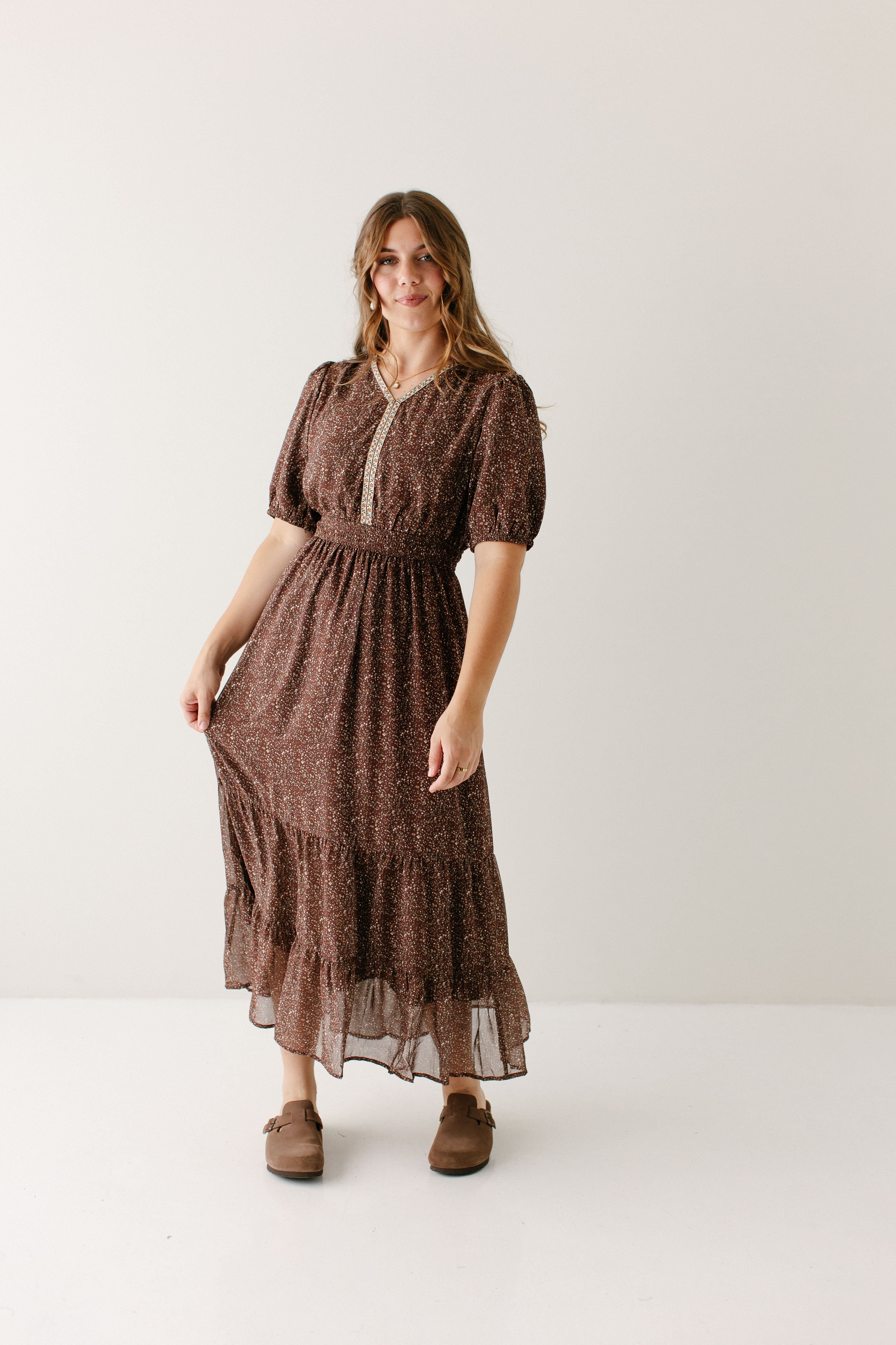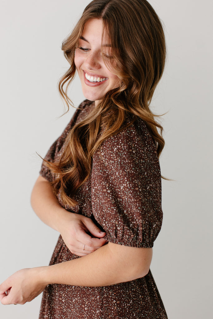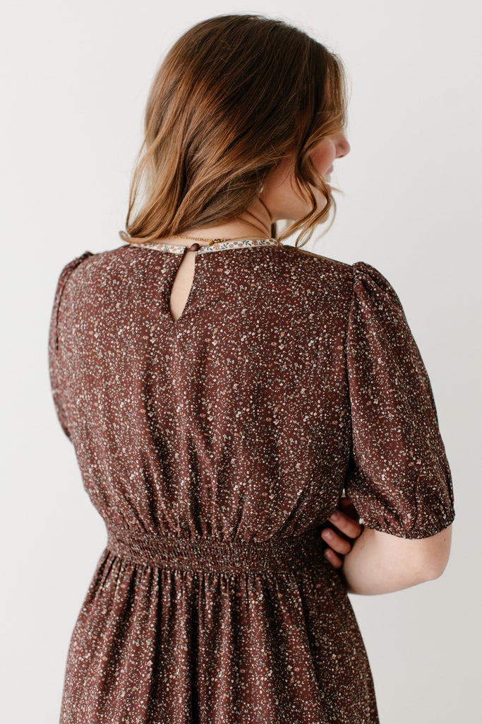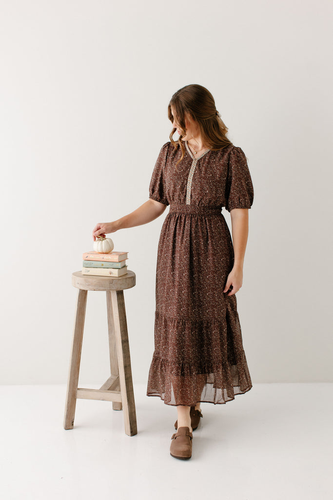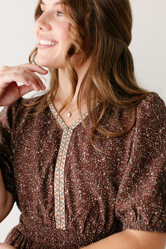 Meet the 'Adamina' Embroidered Trim Ditsy Floral Midi Dress, your next favorite all-occasion dress! Made in a classic brown with pretty embroidered detail and a sweet ditsy floral print and ruffle hem, this dress is full of all the details! Pair the ‘Adamina’ with your favorite neutral cardigan and boots for the cutest church ensemble.