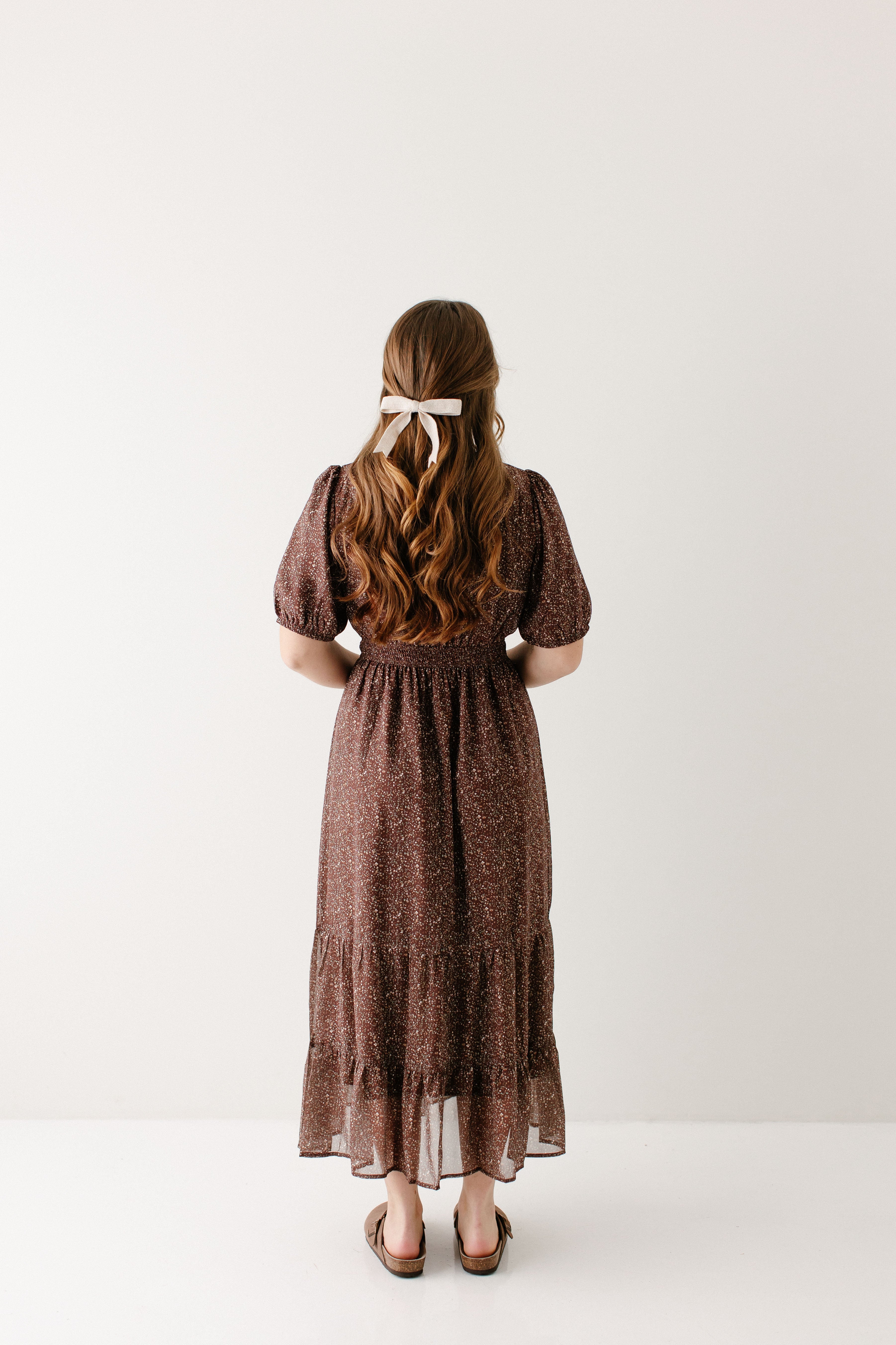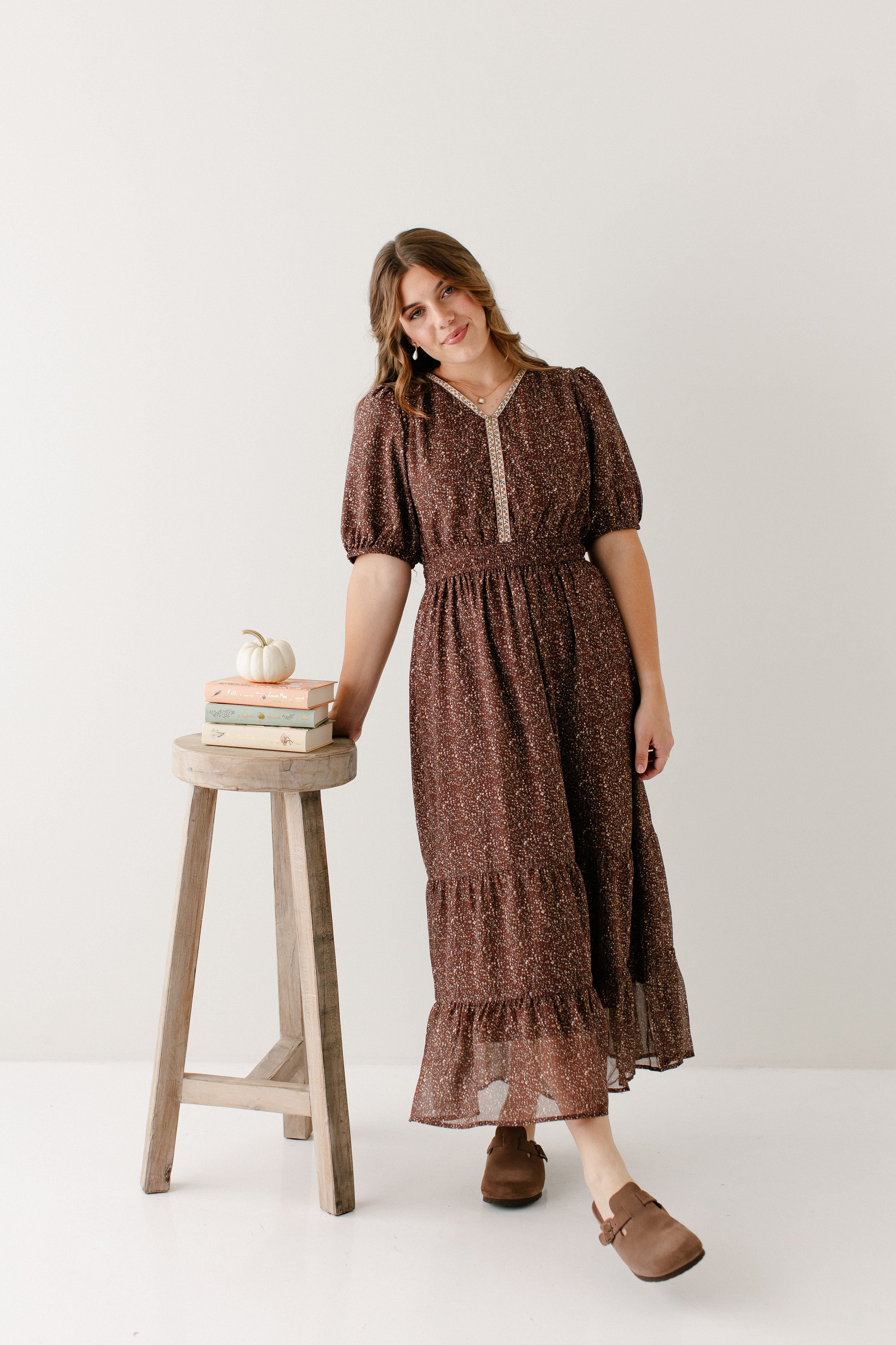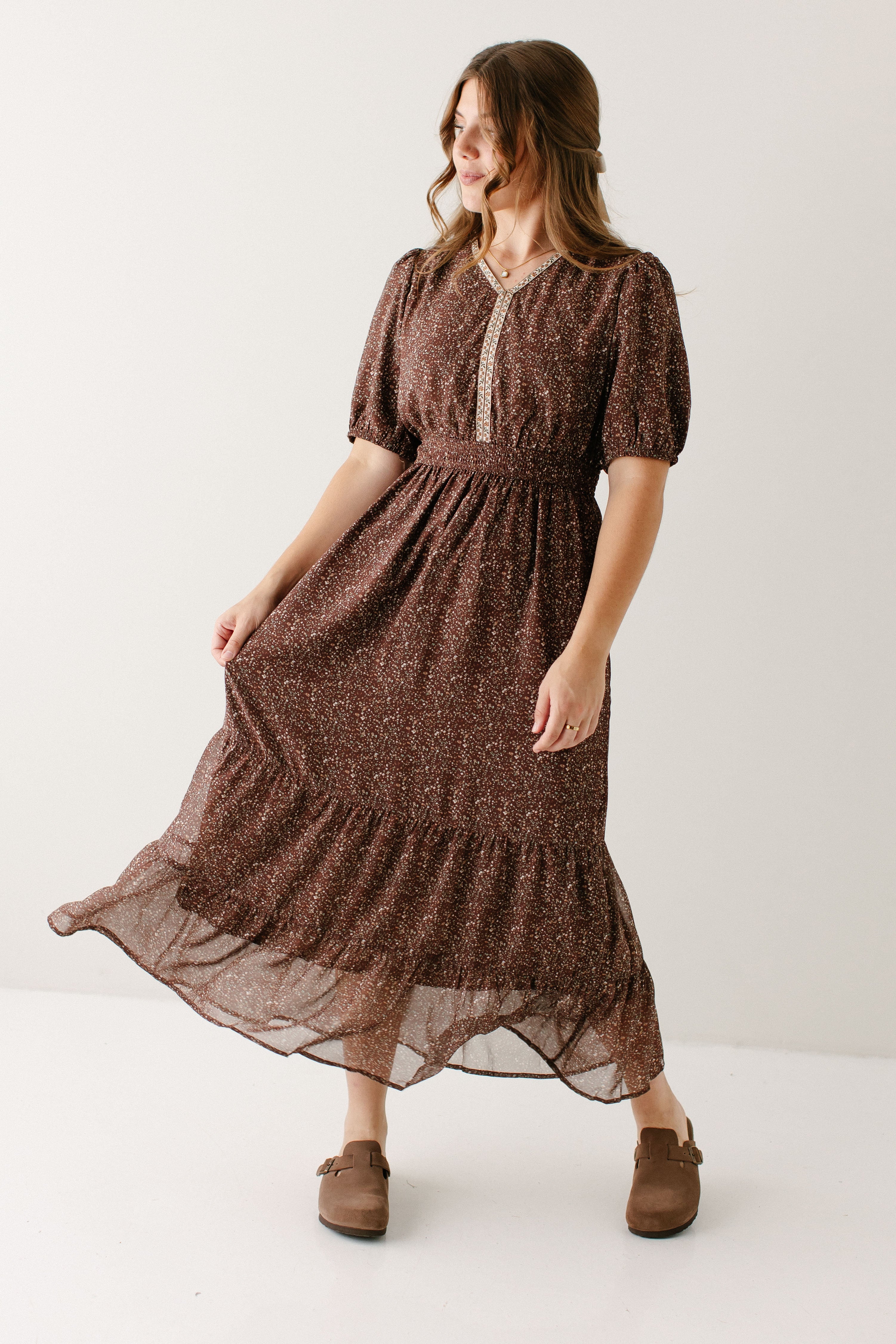 Meet the 'Adamina' Embroidered Trim Ditsy Floral Midi Dress, your next favorite all-occasion dress! Made in a classic brown with pretty embroidered detail and a sweet ditsy floral print and ruffle hem, this dress is full of all the details! Pair the ‘Adamina’ with your favorite neutral cardigan and boots for the cutest church ensemble.