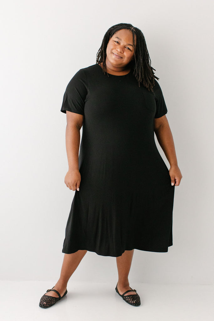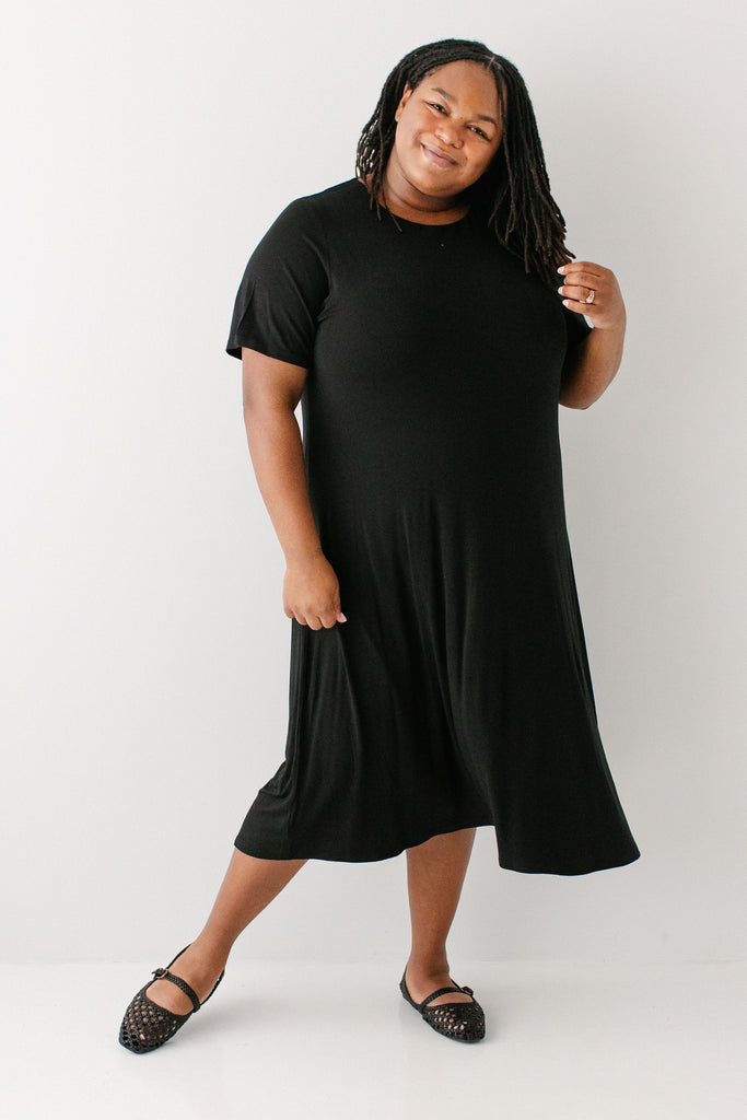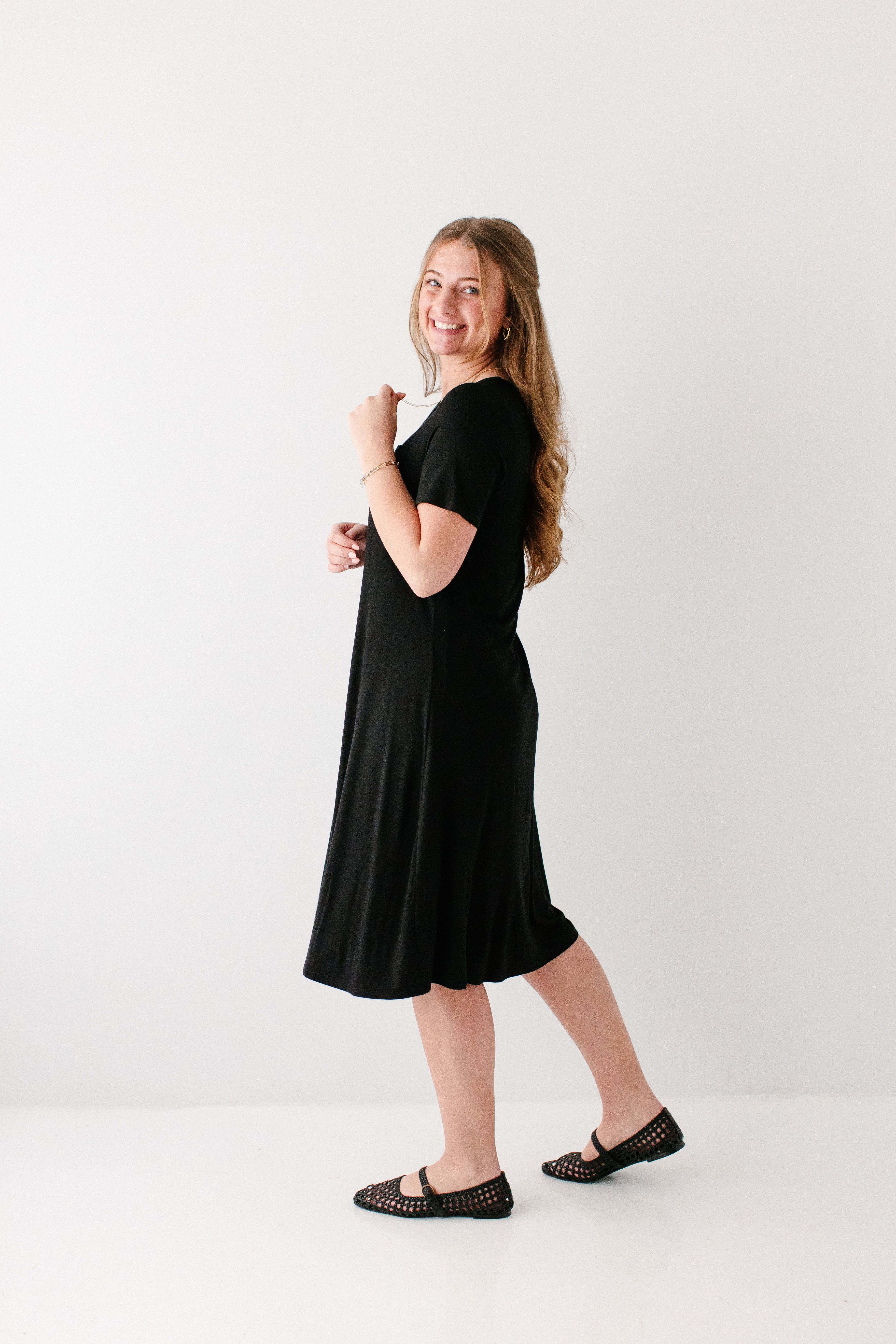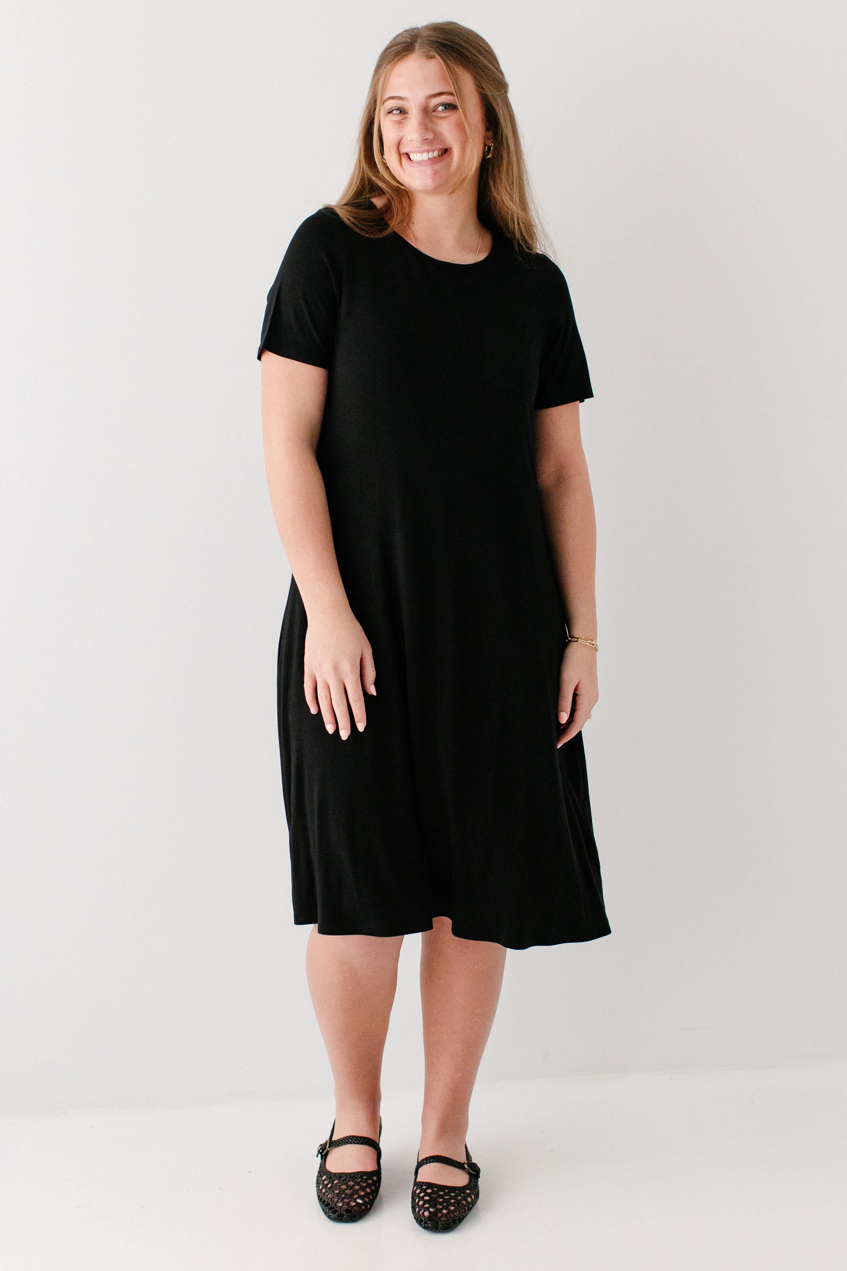 The 'Allison' Swing Dress is back by popular demand! This dress is a modest swing dress made with a high quality fabric blend for maximum comfort, essential for those days when you want to feel like you're in loungewear but still look put together. The ample stretch makes this a popular pick for expecting mamas! Dress this closet staple up with heels or keep it casual with sneakers and your favorite shades! Exclusively designed with you in mind.