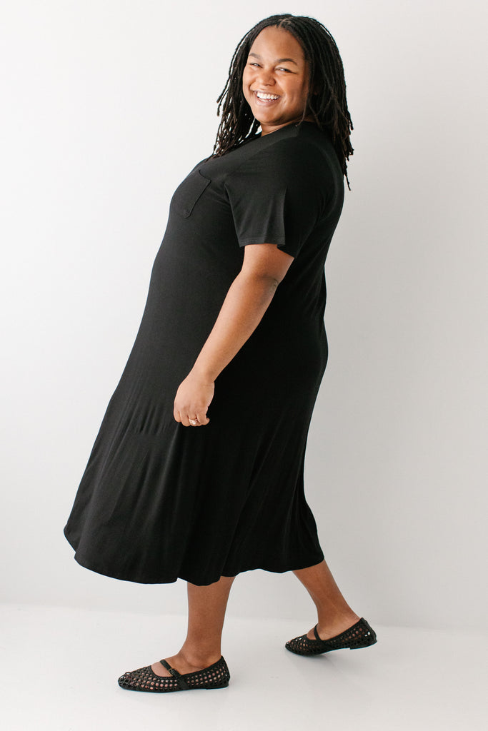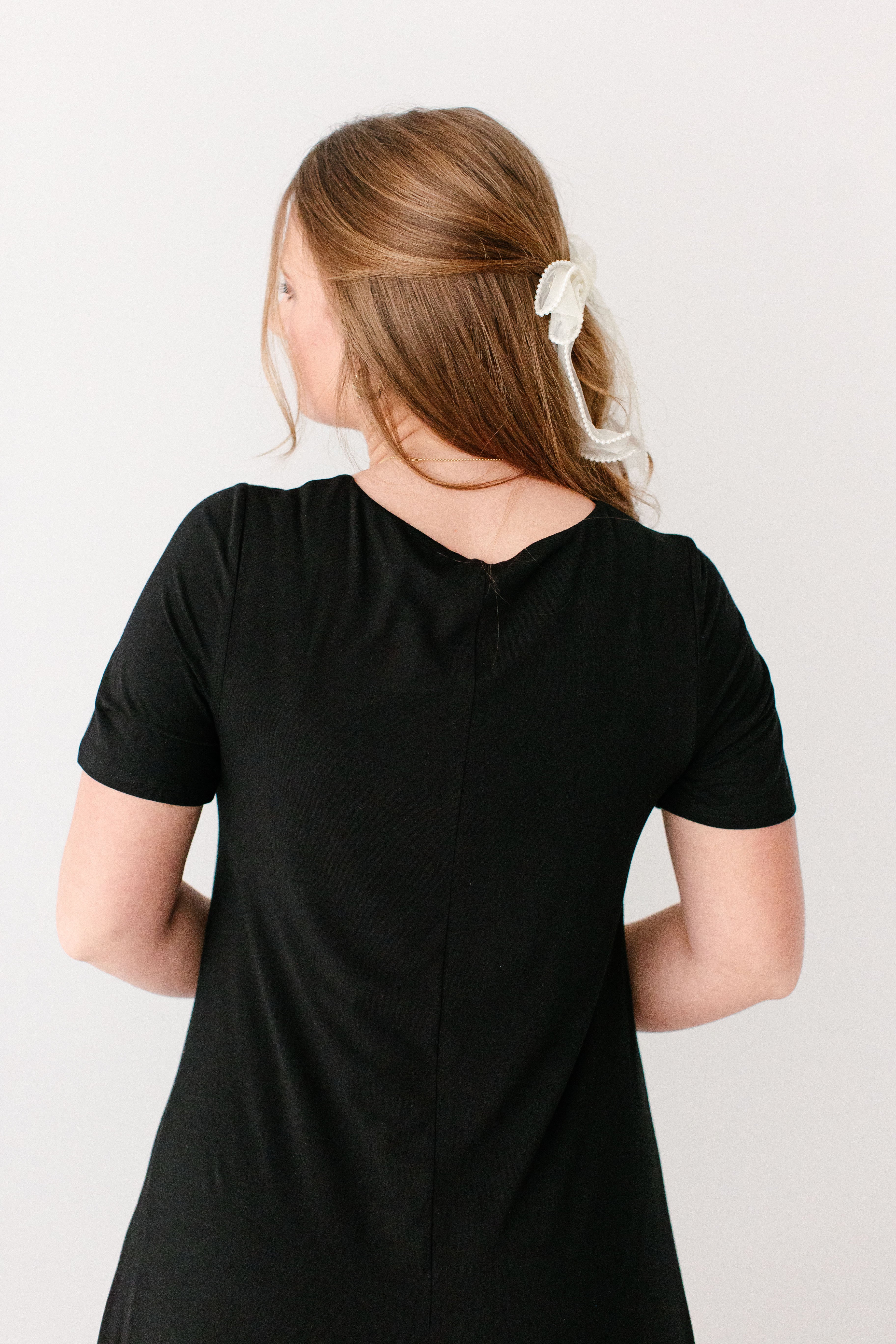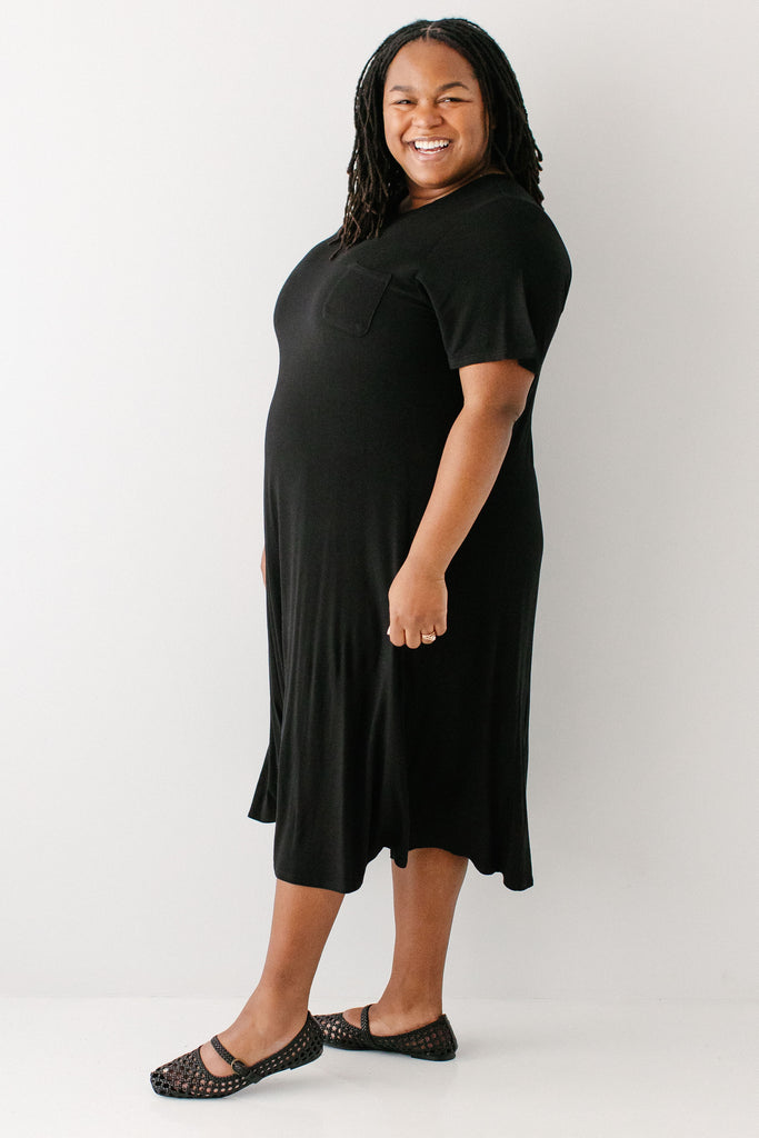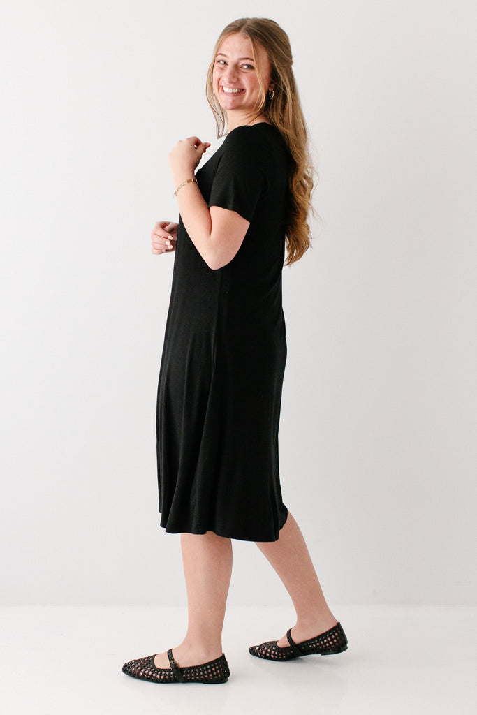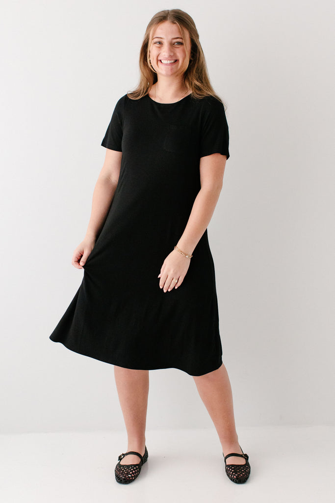 The 'Allison' Swing Dress is back by popular demand! This dress is a modest swing dress made with a high quality fabric blend for maximum comfort, essential for those days when you want to feel like you're in loungewear but still look put together. The ample stretch makes this a popular pick for expecting mamas! Dress this closet staple up with heels or keep it casual with sneakers and your favorite shades! Exclusively designed with you in mind.