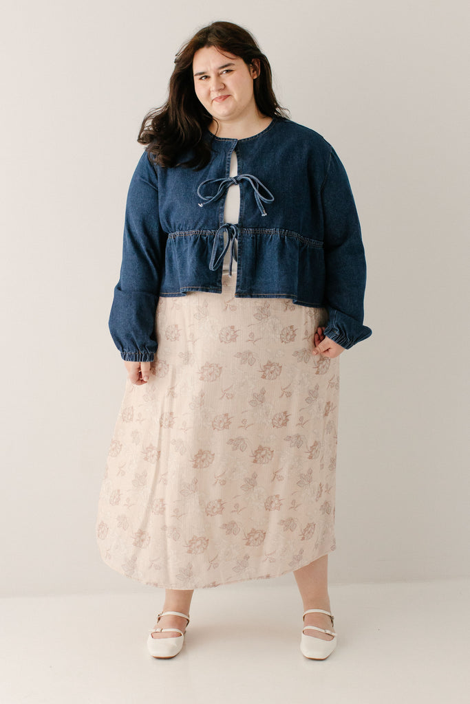 Model wearing the 'Jones' Bow Detail Peplum Denim Jacket with the 'Amour' Rose Print Midi Slip Skirt and a layering tank