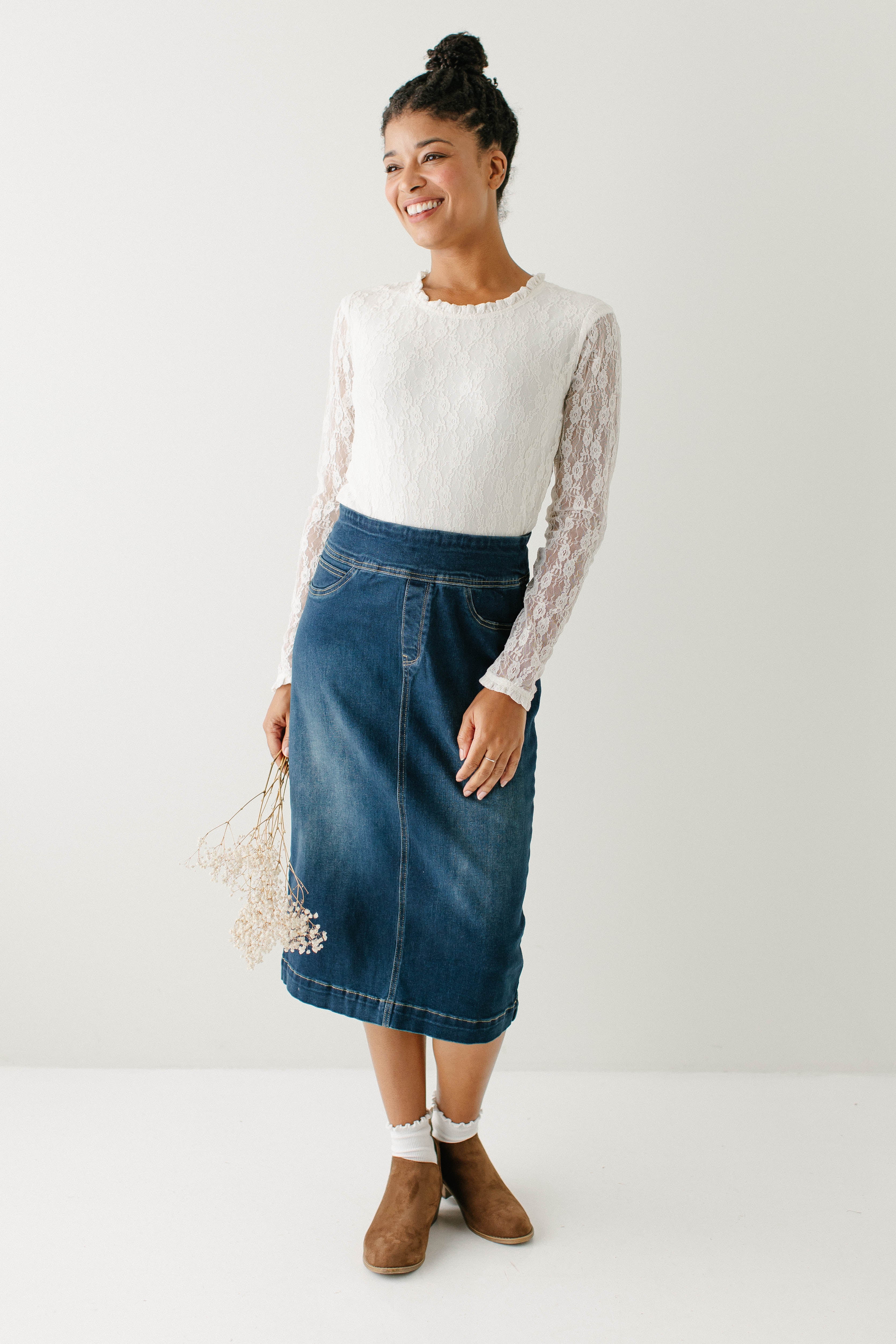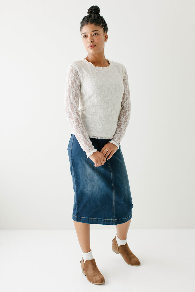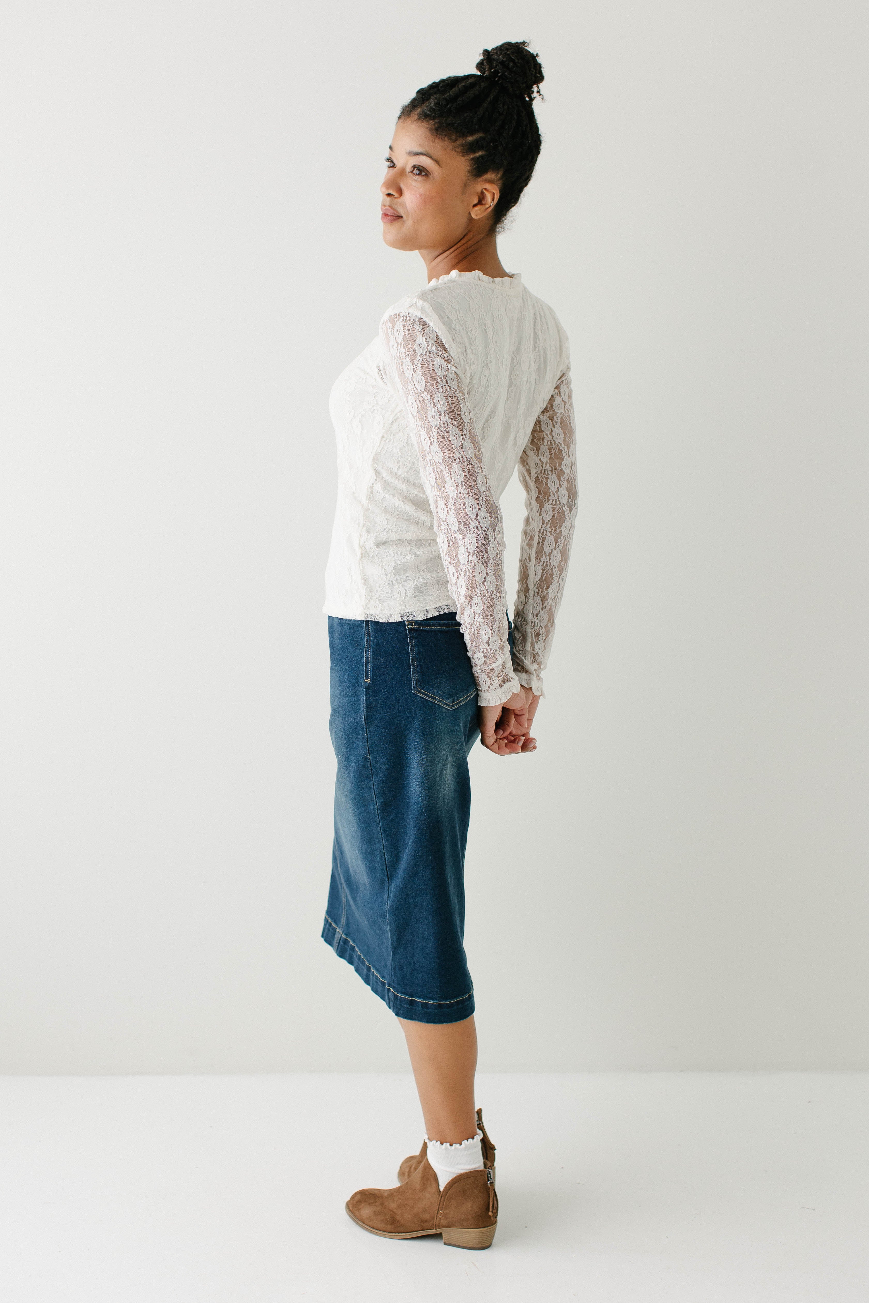 Model wearing the 'Angelica' Lace Layering Top and the 'Sara' Classic Knee Length Dark Denim Skirt in 29”