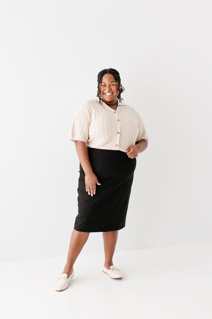 Heavy knit stretch fabric. Pencil fit runs true to size or size up if preferred for a less fitted look.