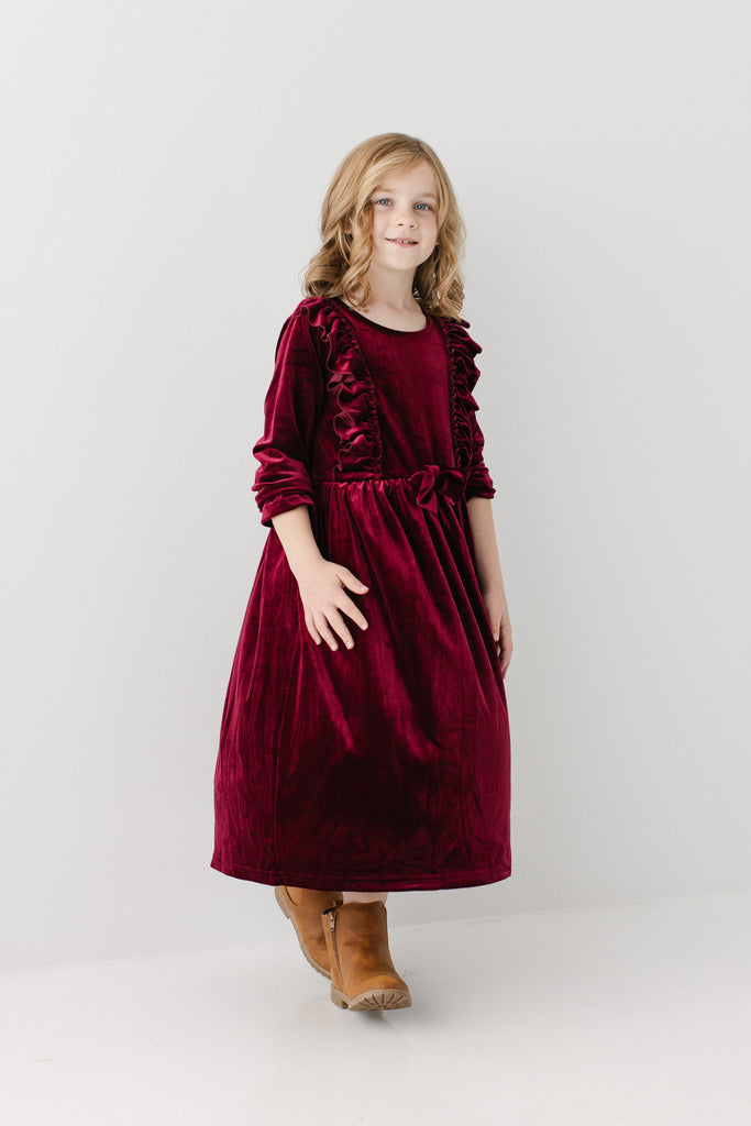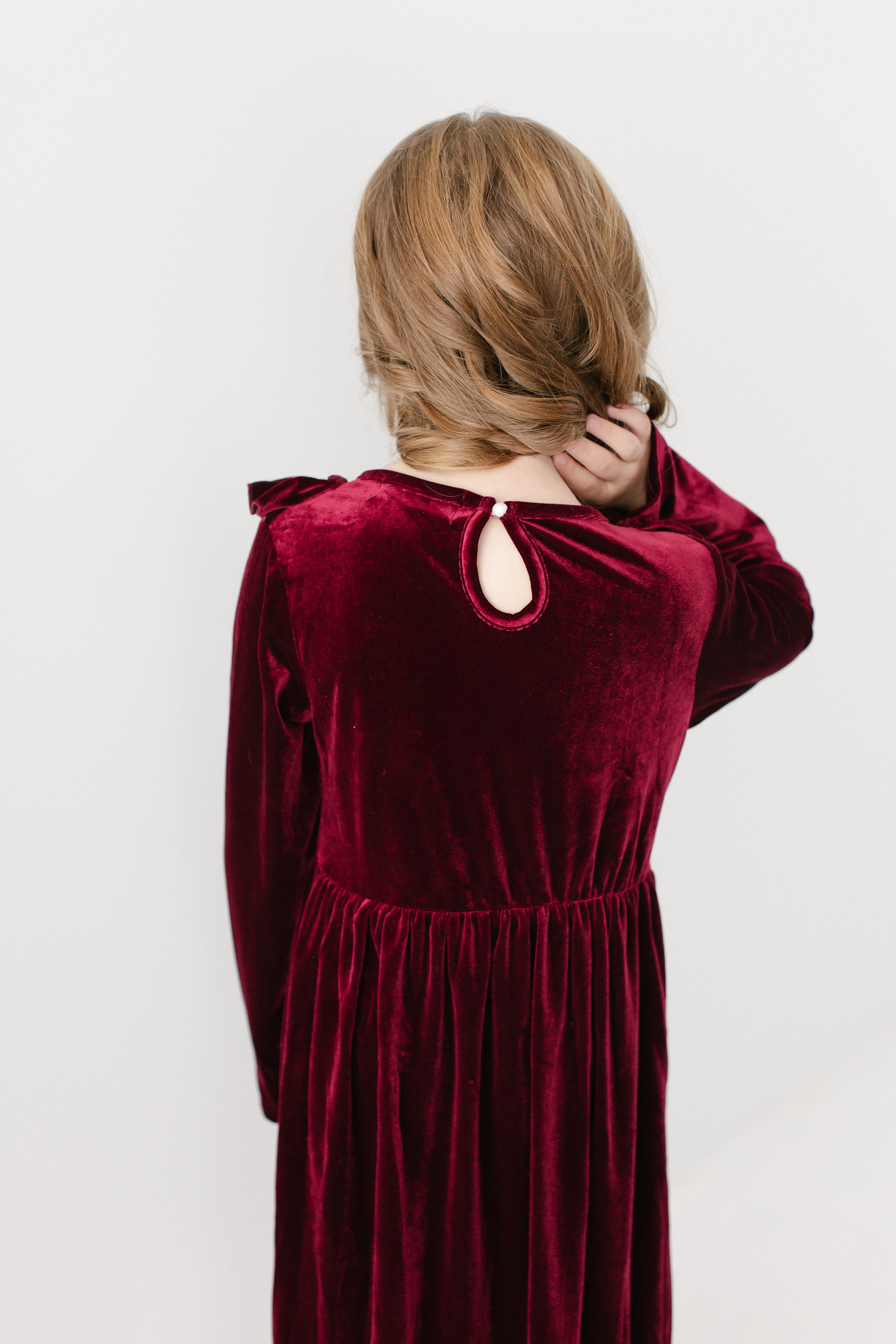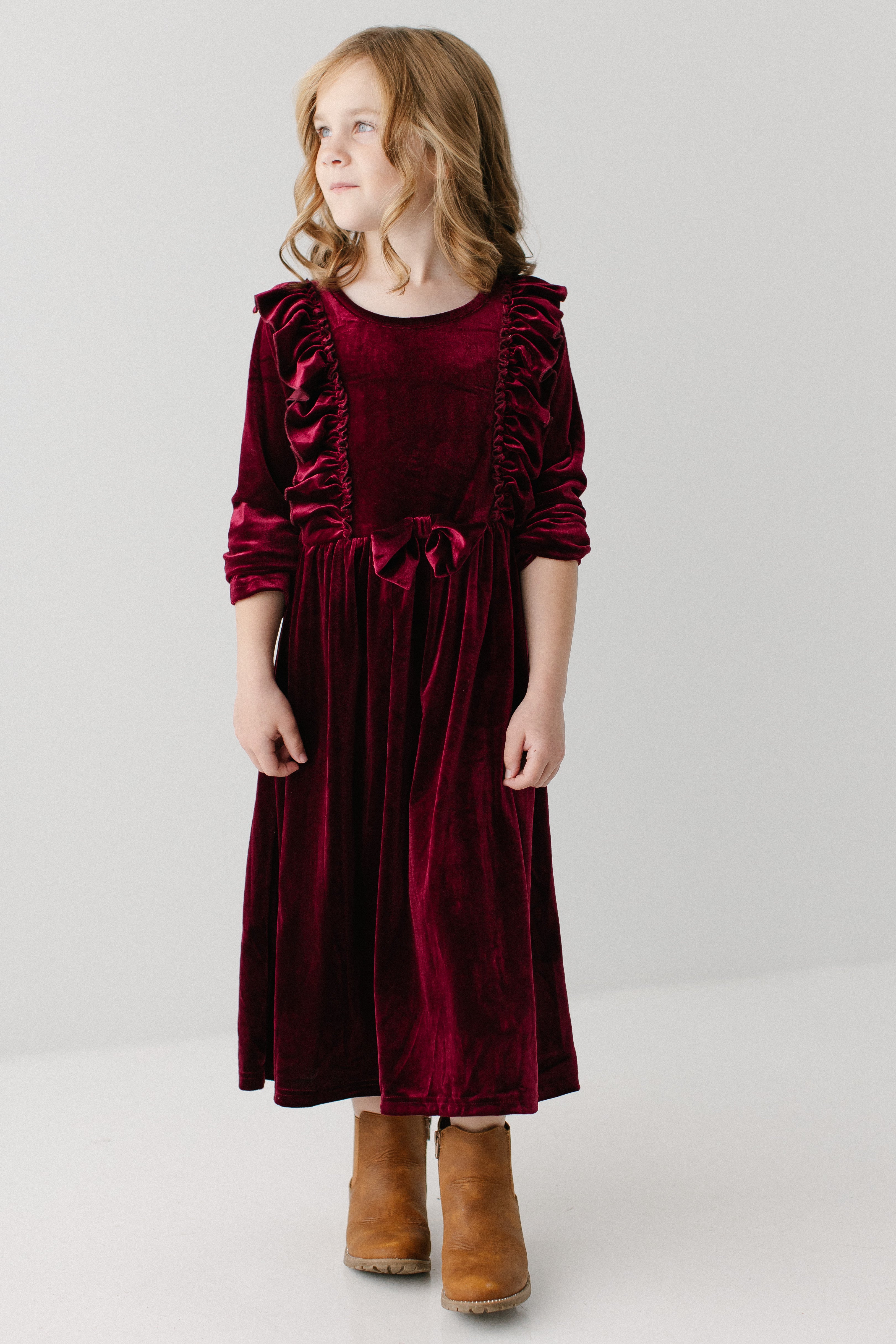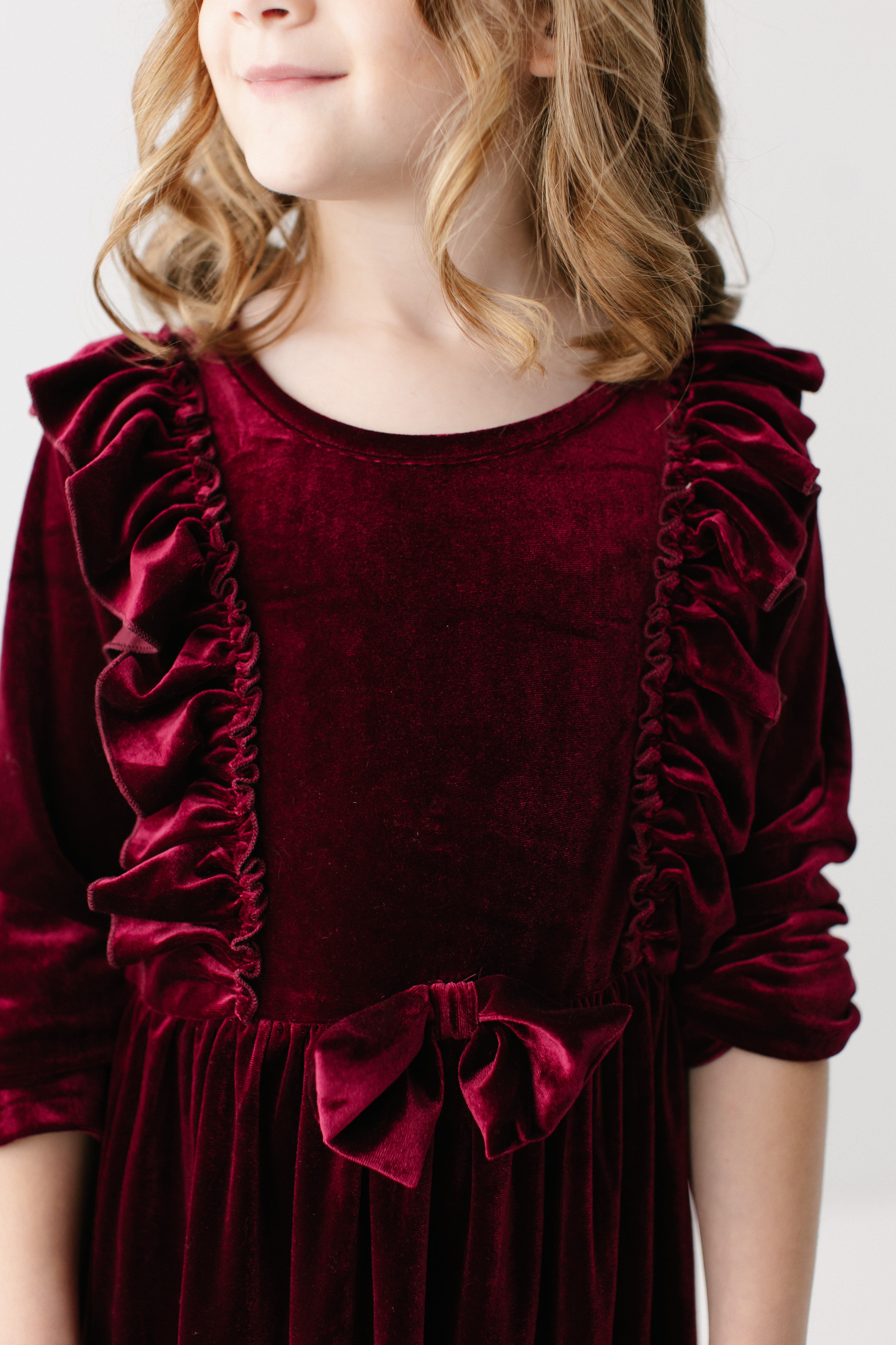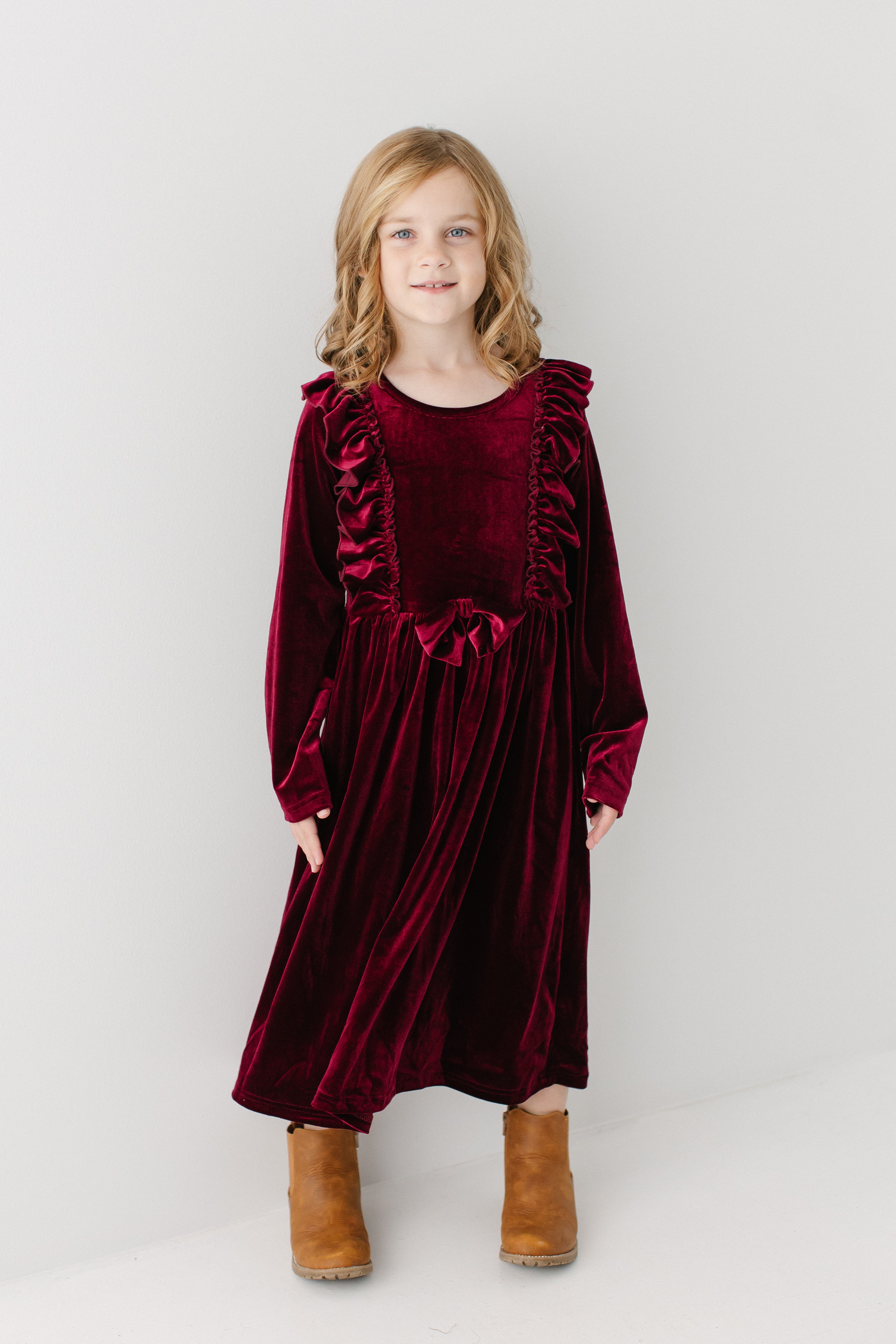 When your little girl needs the perfect dress for the holiday season, reach for the 'Arabella' Girl Ruffle Detail Velvet Dress! Designed in a beautiful wine color perfect for Christmas, fun velvet fabric, and with the cutest ruffle details, this is a piece she will love having in her closet!