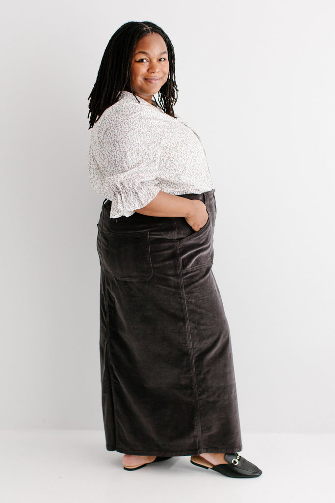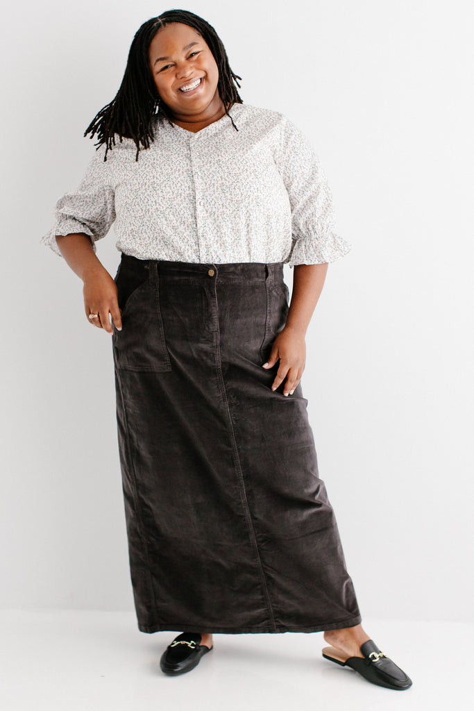 Model wearing the 'Susannah' Floral Print Cotton Peasant Top with the 'Autumn' Corduroy Maxi Length Skirt in Charcoal Grey