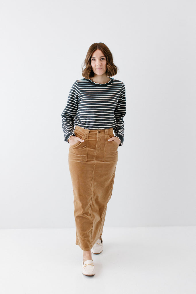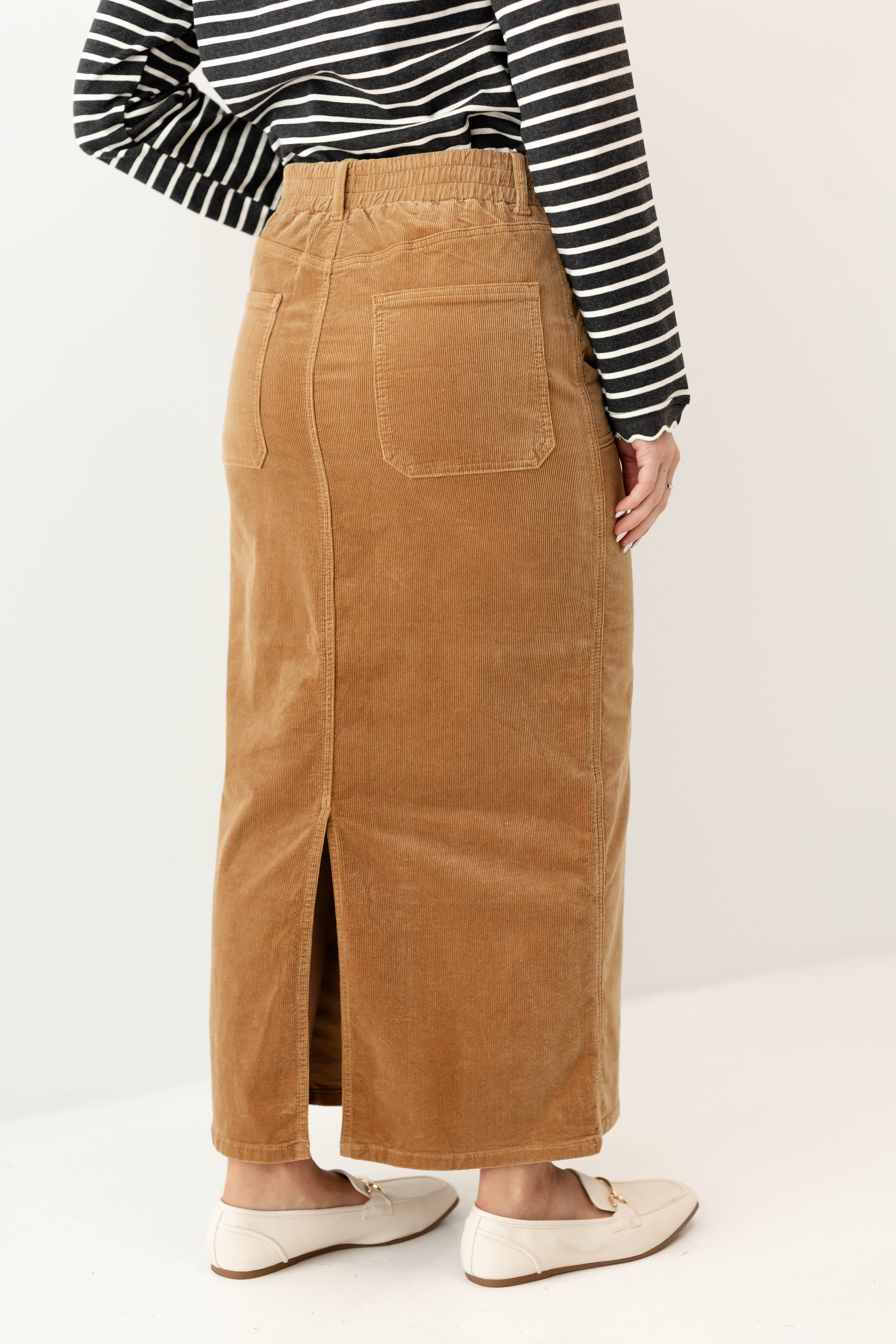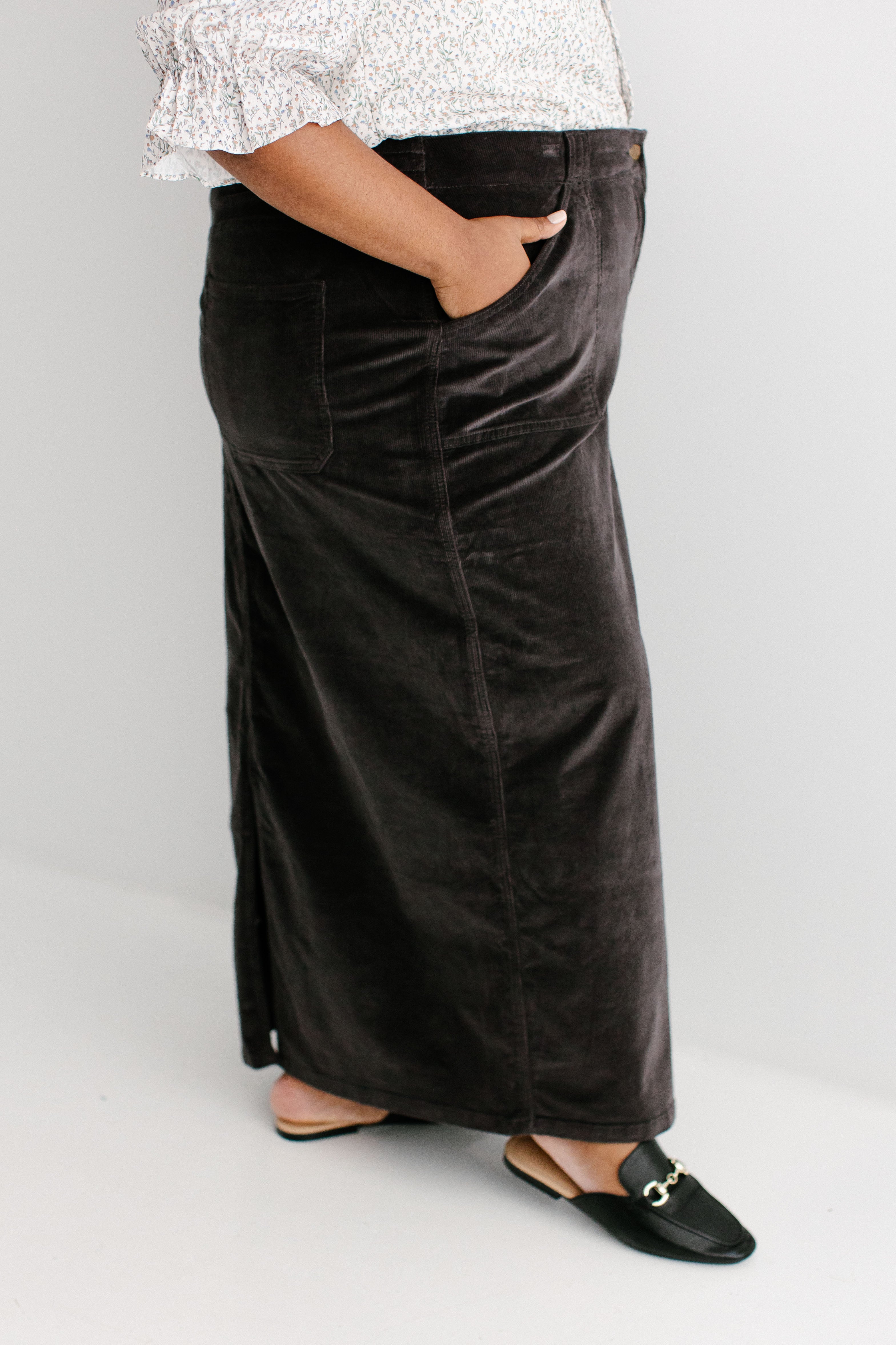 There might not be any item that exudes fall more than a corduroy skirt! The 'Autumn' Corduroy Maxi Length Skirt is sure to become a staple in your wardrobe this season! Made out of the softest ribbed corduroy, the skirt features functional pockets, a stretchy back waistband, back slit for ease of movement, and a classic button + zipper closure in front. Choose from two versatile shades: warm khaki or charcoal gray. You may just need one of each! Pair the 'Autumn' with all of your favorite neutral sweaters and tops for a perfectly cozy fall outfit. Exclusively designed by us with you in mind!