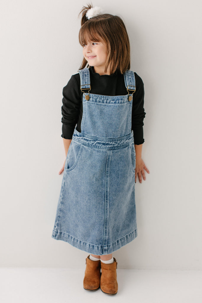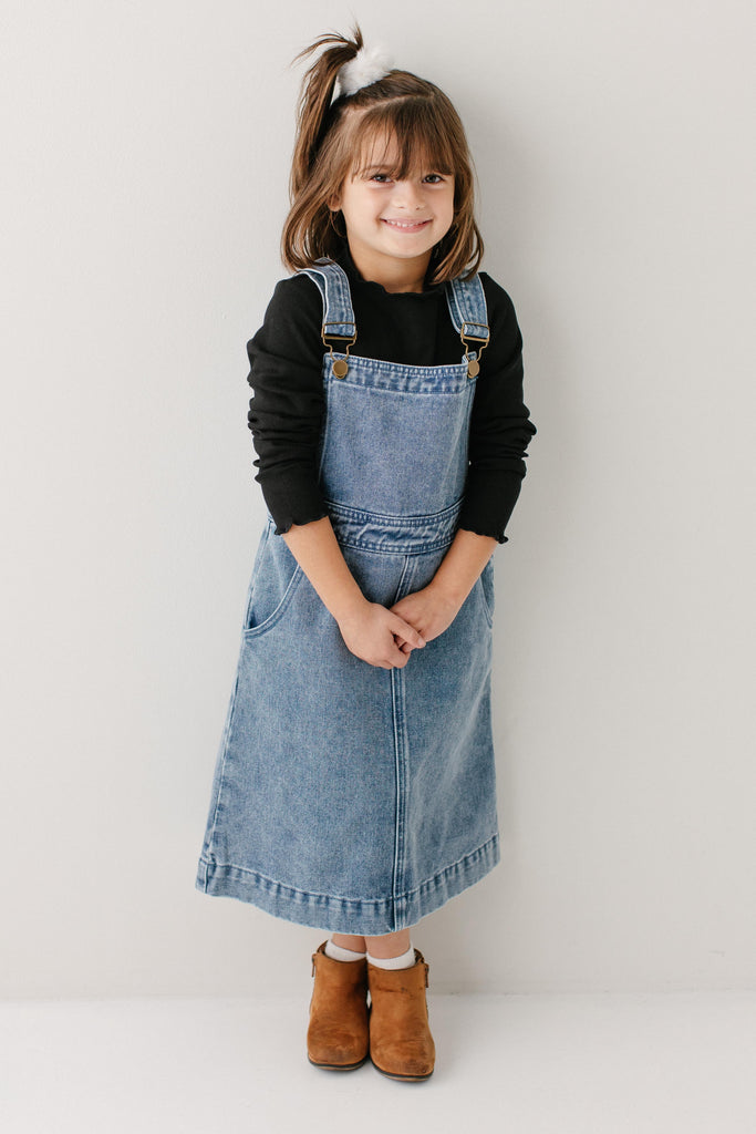 Model wearing the 'Bailey' Girl Denim Overall Dress with the 'Hillary' Girl Lettuce Hem Ribbed Top in Black