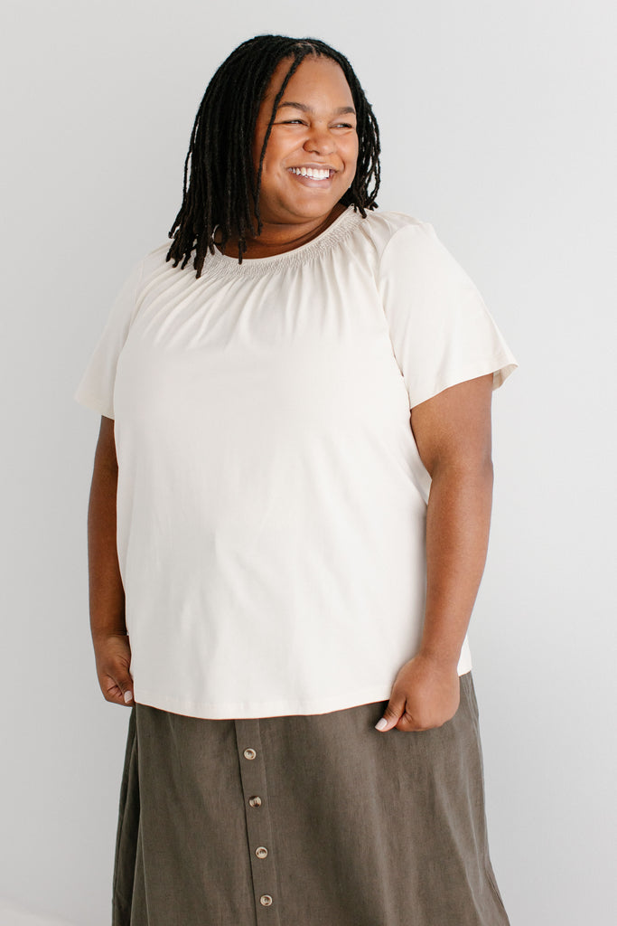 Model wearing the 'Bethany' Smocked Detail Short Sleeve Top with the 'Tirzah' Button Front Maxi Skirt