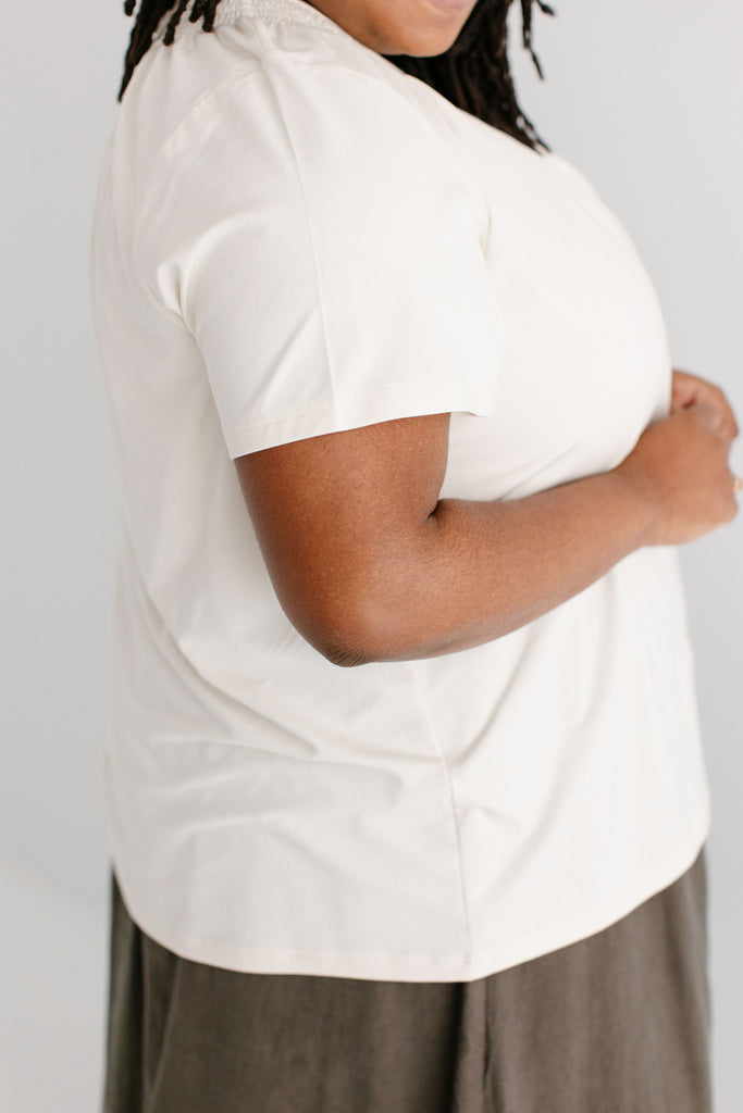 Feminine with pretty little details, the 'Bethany' top is beautiful without being too extravagant. Made out of a quality cotton blend, the 'Bethany' is soft and comfortable, and easy to layer with! The cream shade features the same design as the original 'Bethany' top; however, the sleeves have been changed to a classic short sleeve design. Pair it with a denim skirt for a casual look or tuck it into a skirt and add some heels for an elevated office fit! Exclusively designed by us for you.
