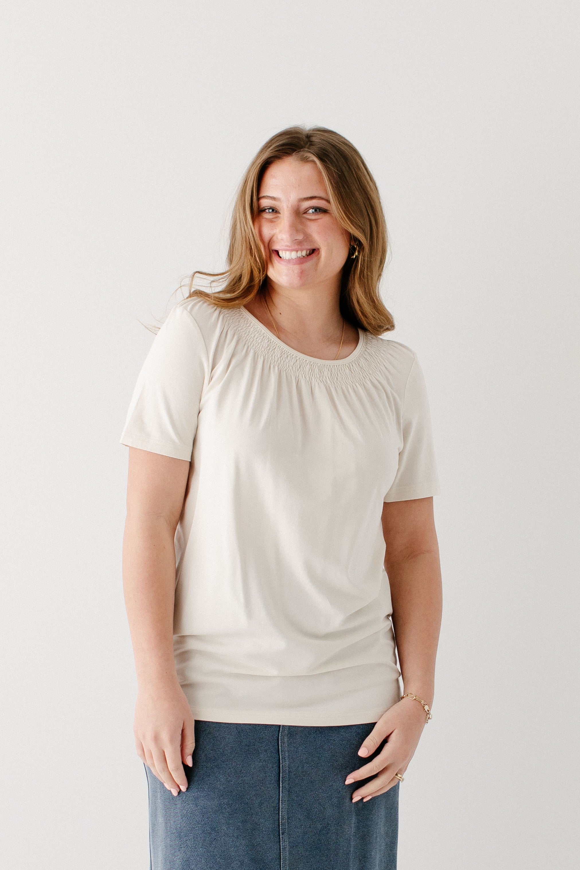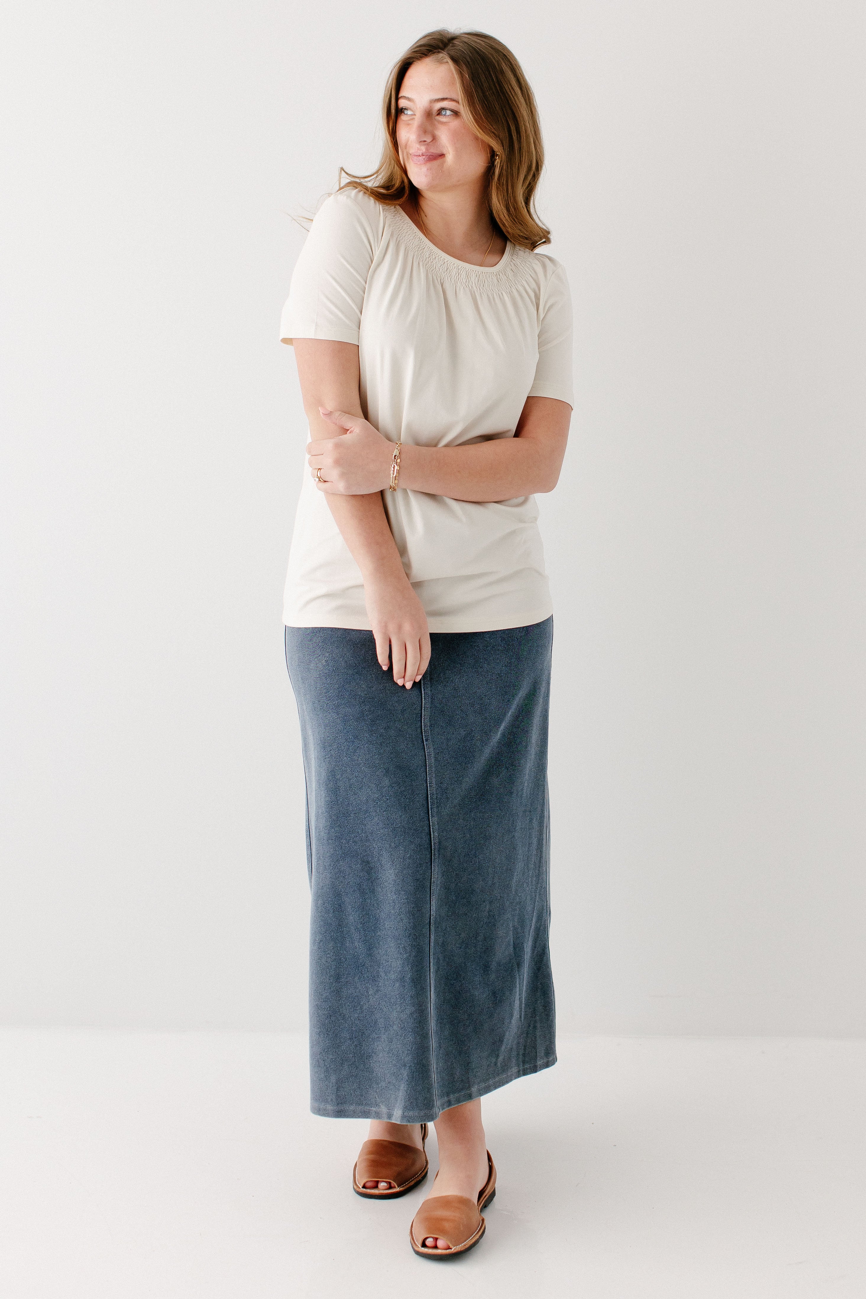 Model wearing the 'Bethany' Smocked Detail Short Sleeve Top with the 'Caroline' Long Knit Denim Skirt in Medium Wash