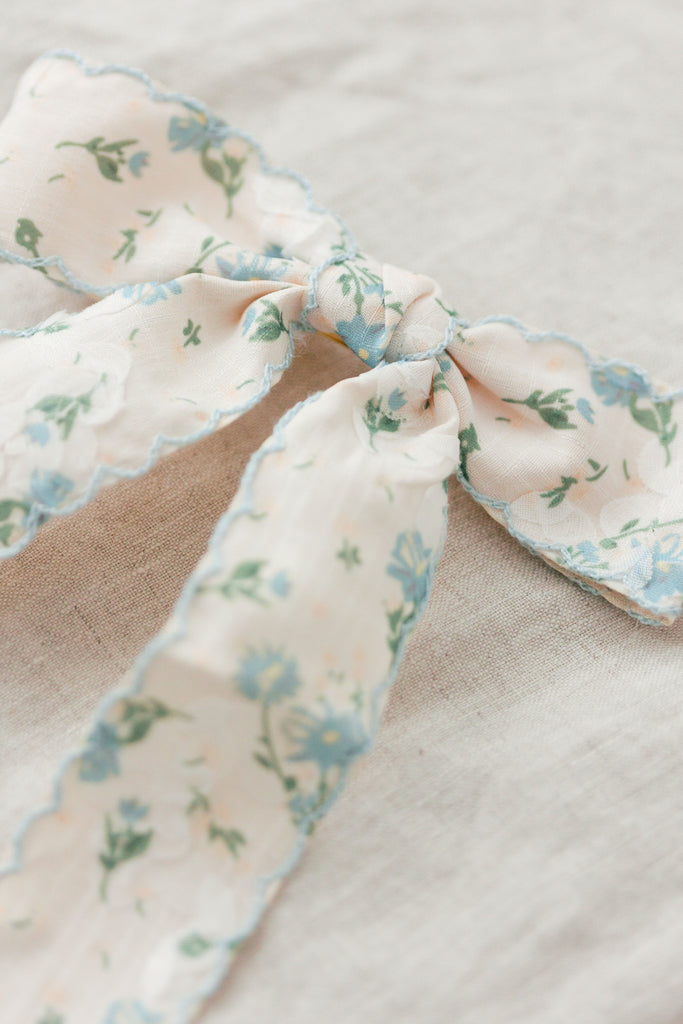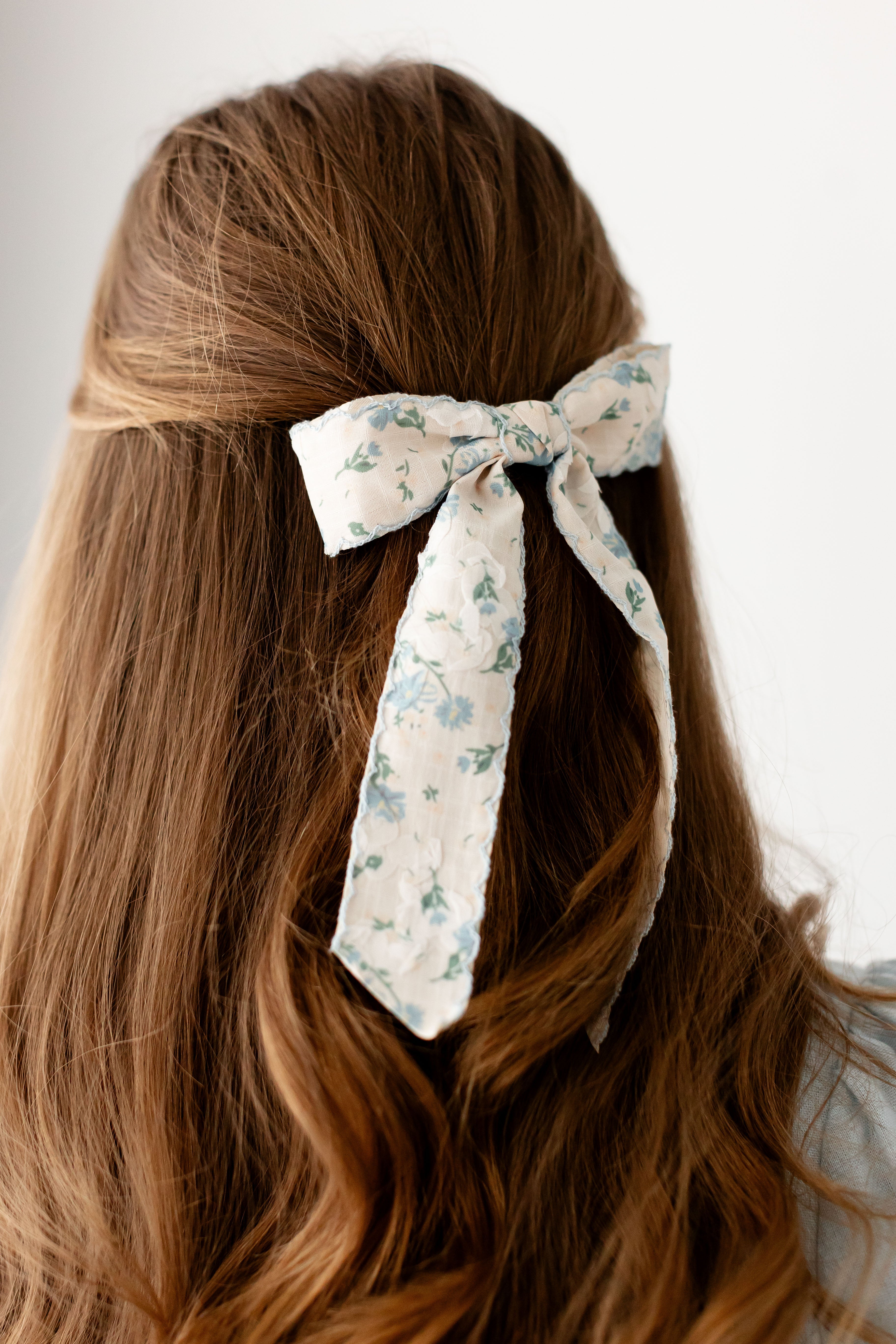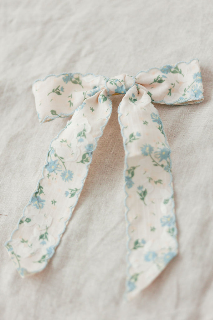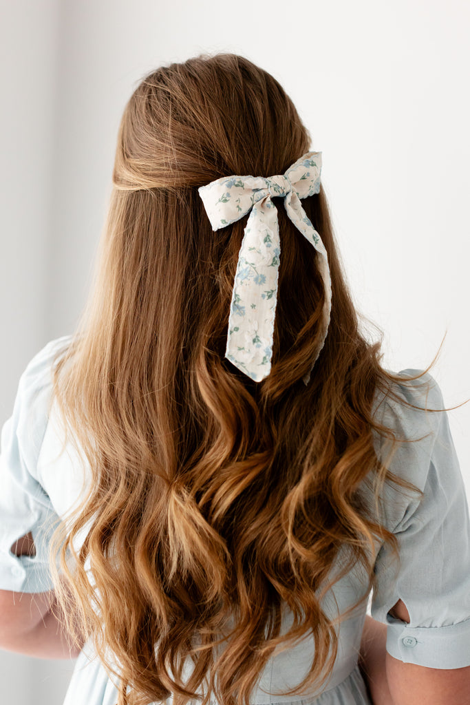 When you want to elevate your hair with a nod to spring, reach for the Blue Floral Bow Barrette! This bow has a dainty blue floral print, scalloped edging, and classic french barrette closure.