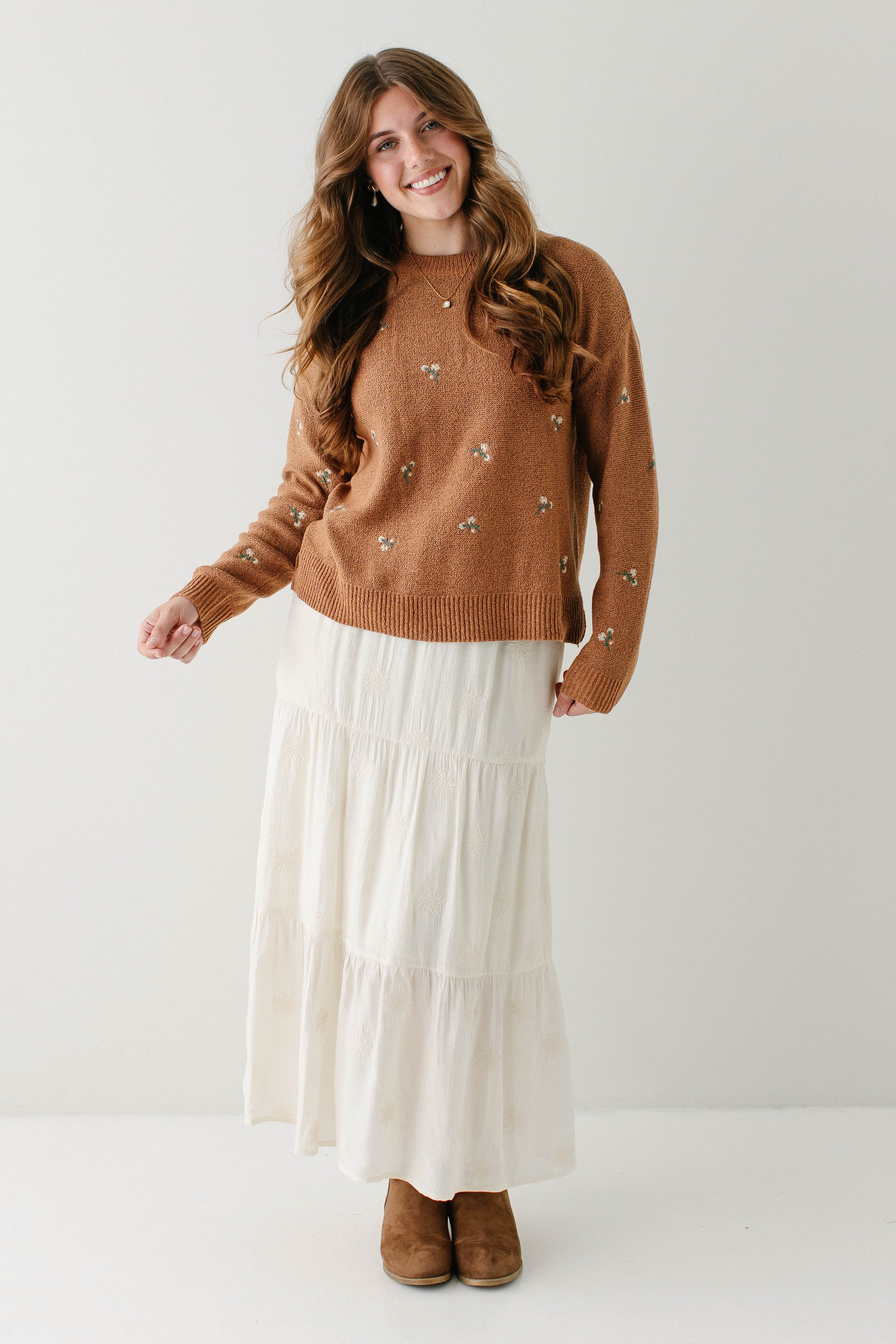 Model wearing the 'Shay' Ribbed Henley Top in Light Sage and the 'Bonita' Floral Embroidered Puff Sleeve Top in Cream with the 'Bonnie' Floral Embroidered Tiered Midi Skirt in Cream