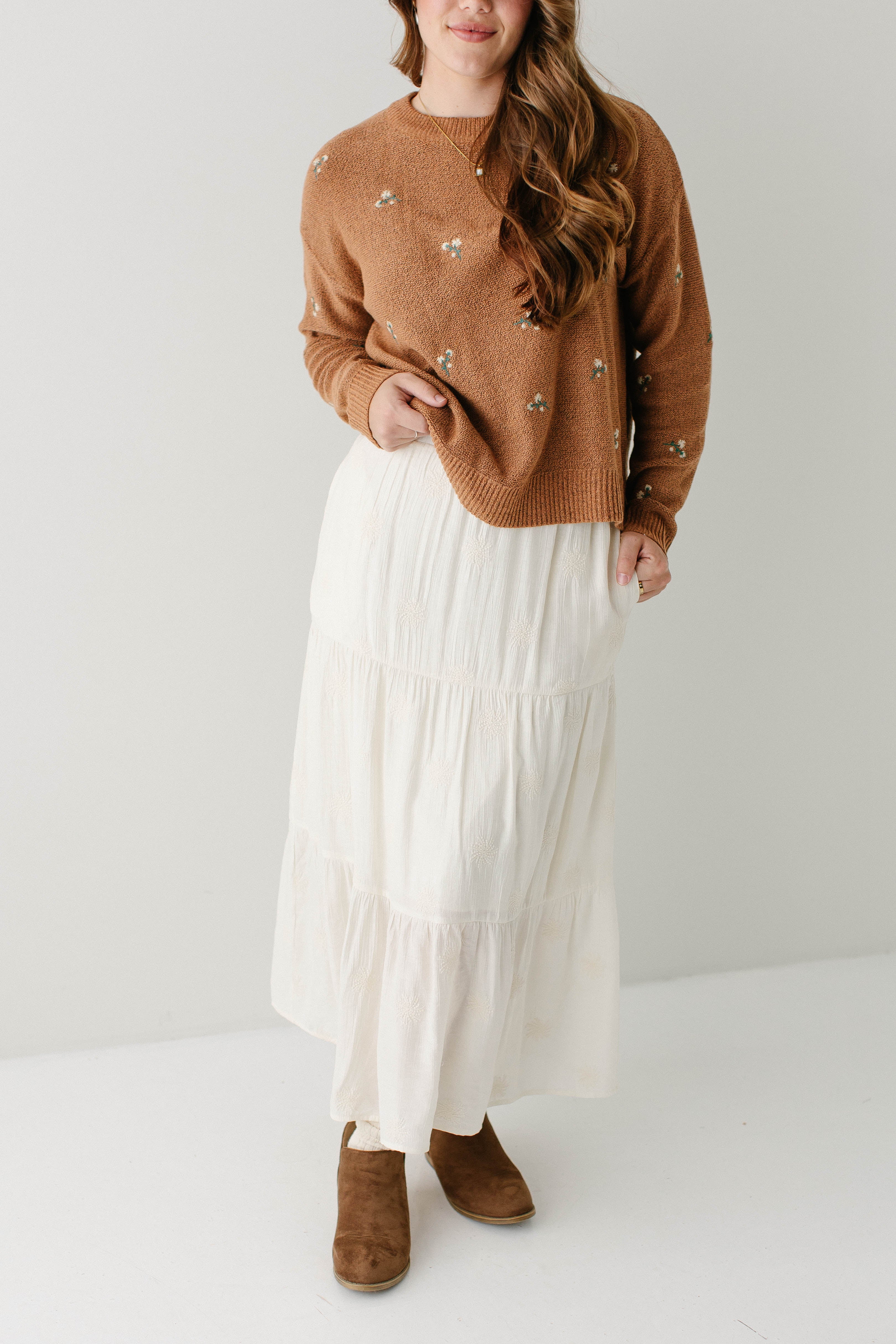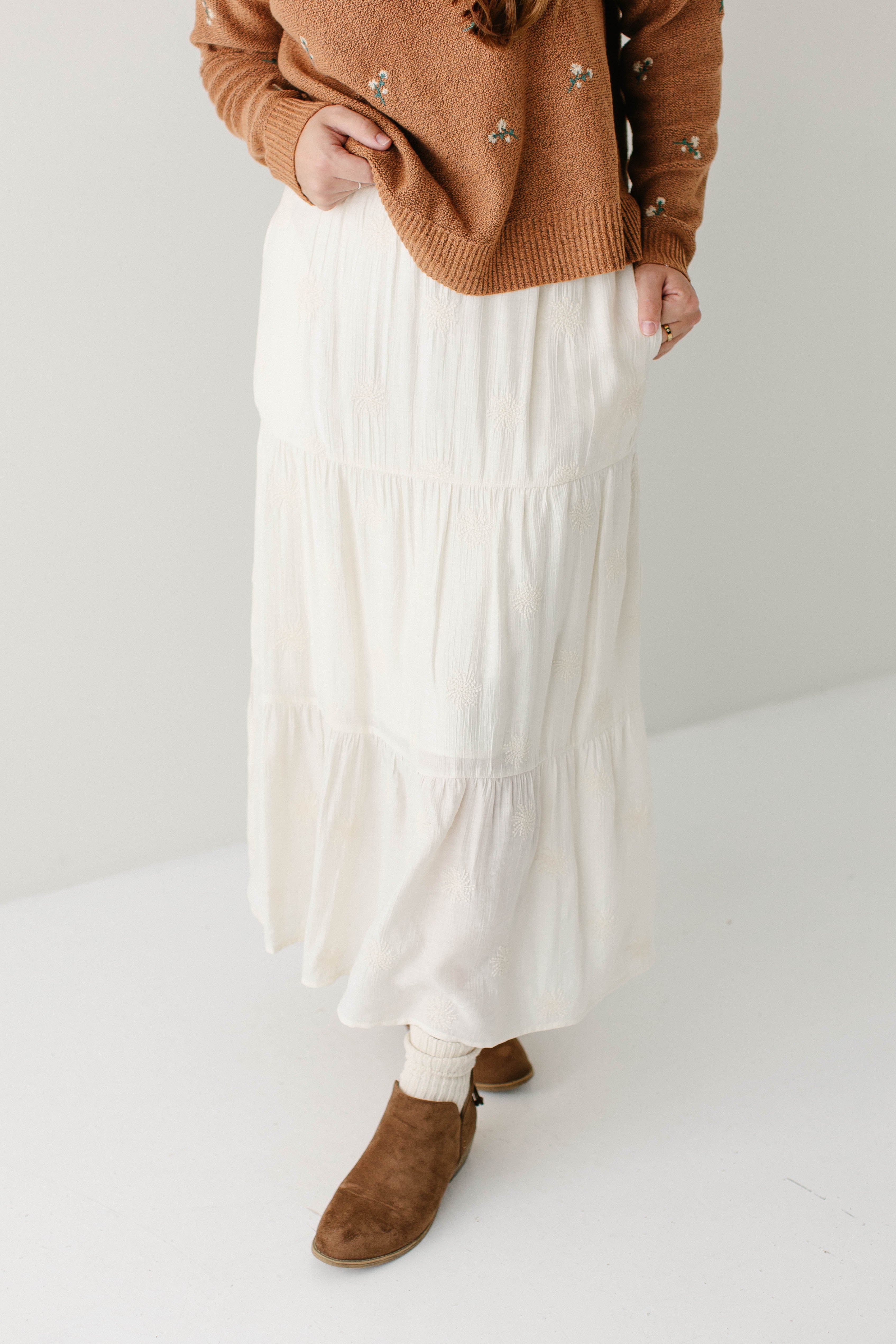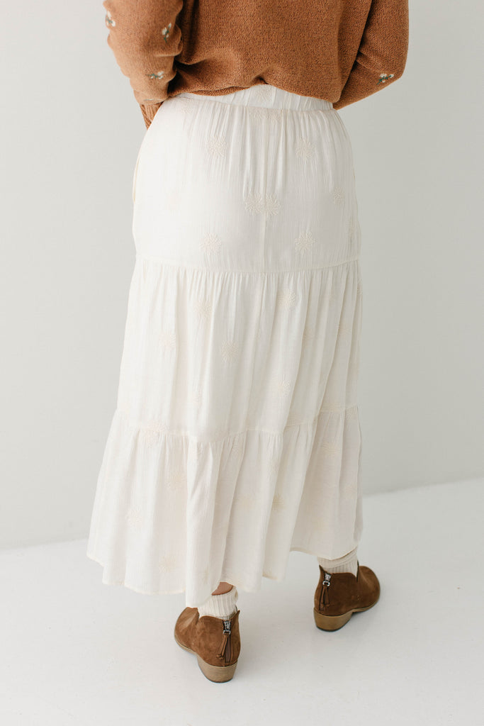 Where classy meets adorable details, the ‘Bonnie’ Floral Embroidered Tiered Midi Skirt is there! With a flattering tiered design and monochromatic floral embroidery, this skirt is simple and beautiful. Pair the ‘Bonnie’ with your favorite solid color top and sandals for your next favorite beach outfit.