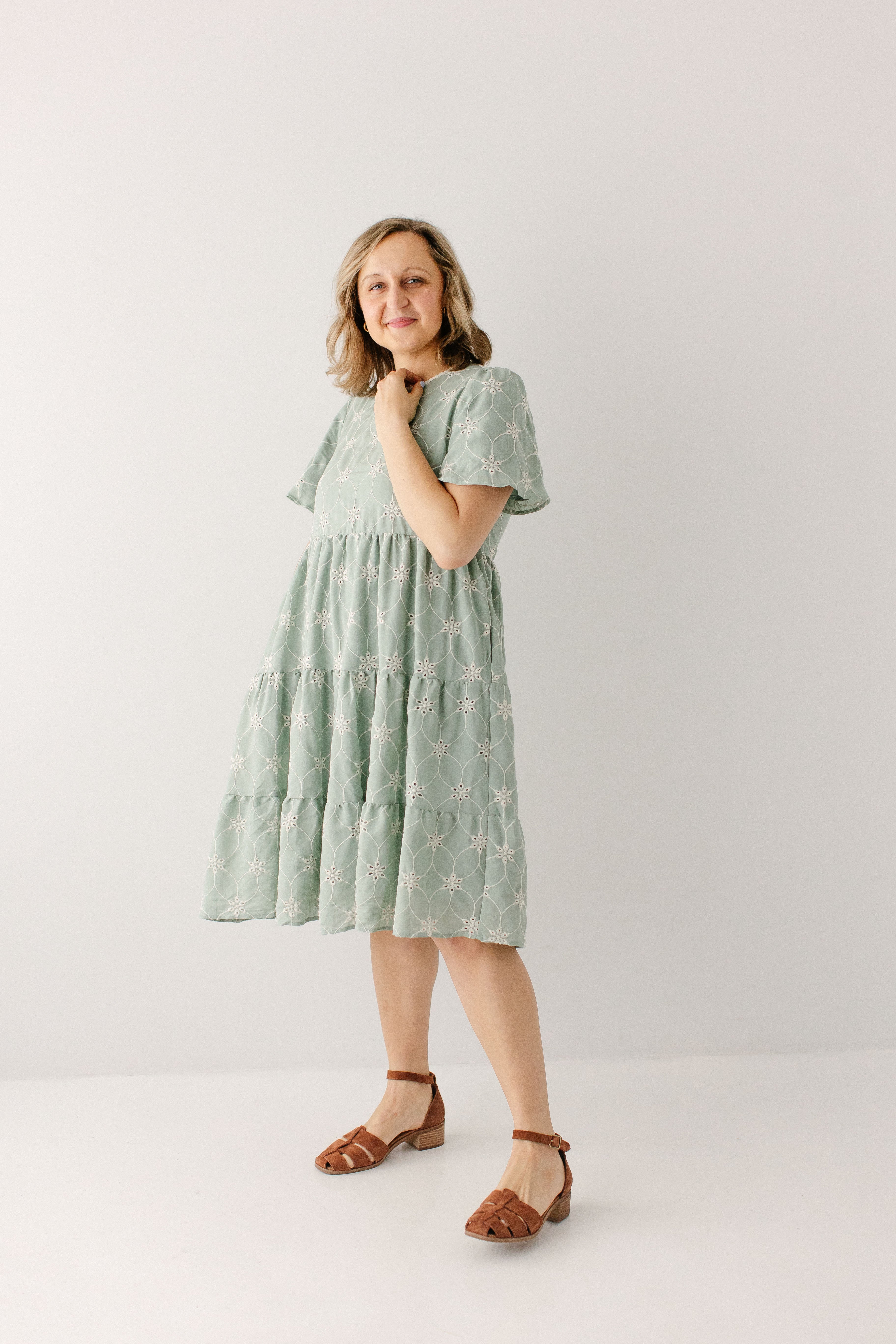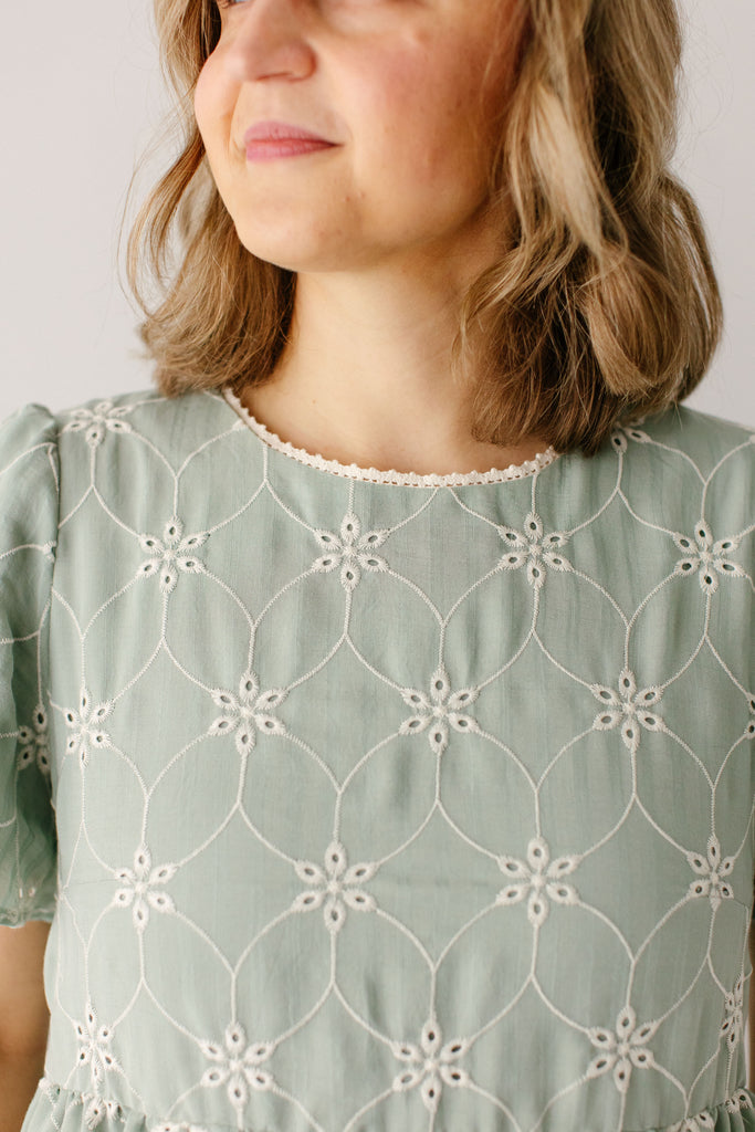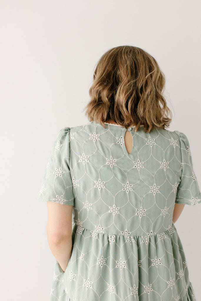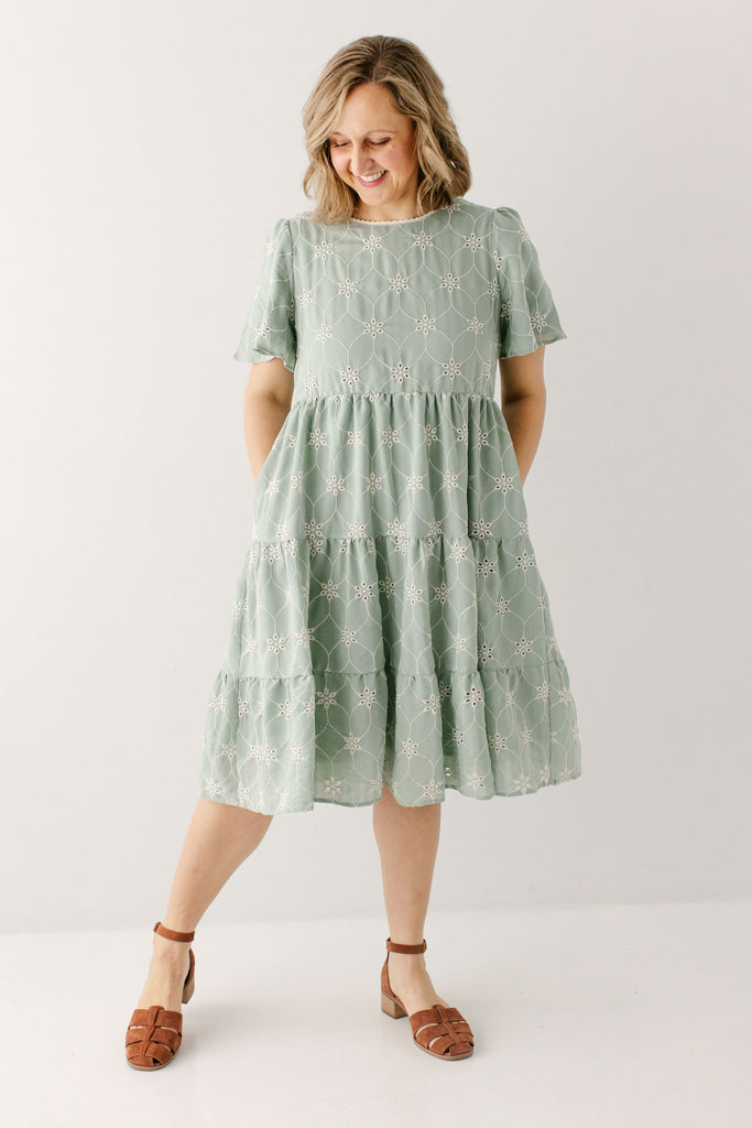 The best dresses are the perfectly effortless ones! The 'Brisa' Eyelet Tiered Midi Dress features embroidered eyelet detailing, flutter sleeves, modest high neckline with pretty lace detailing, tiered skirt, and full lining from sleeves to skirt. Dress the ‘Brisa’ up or down!
