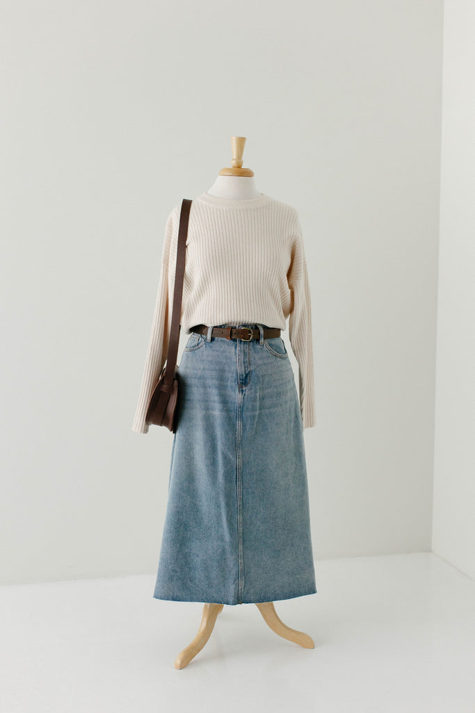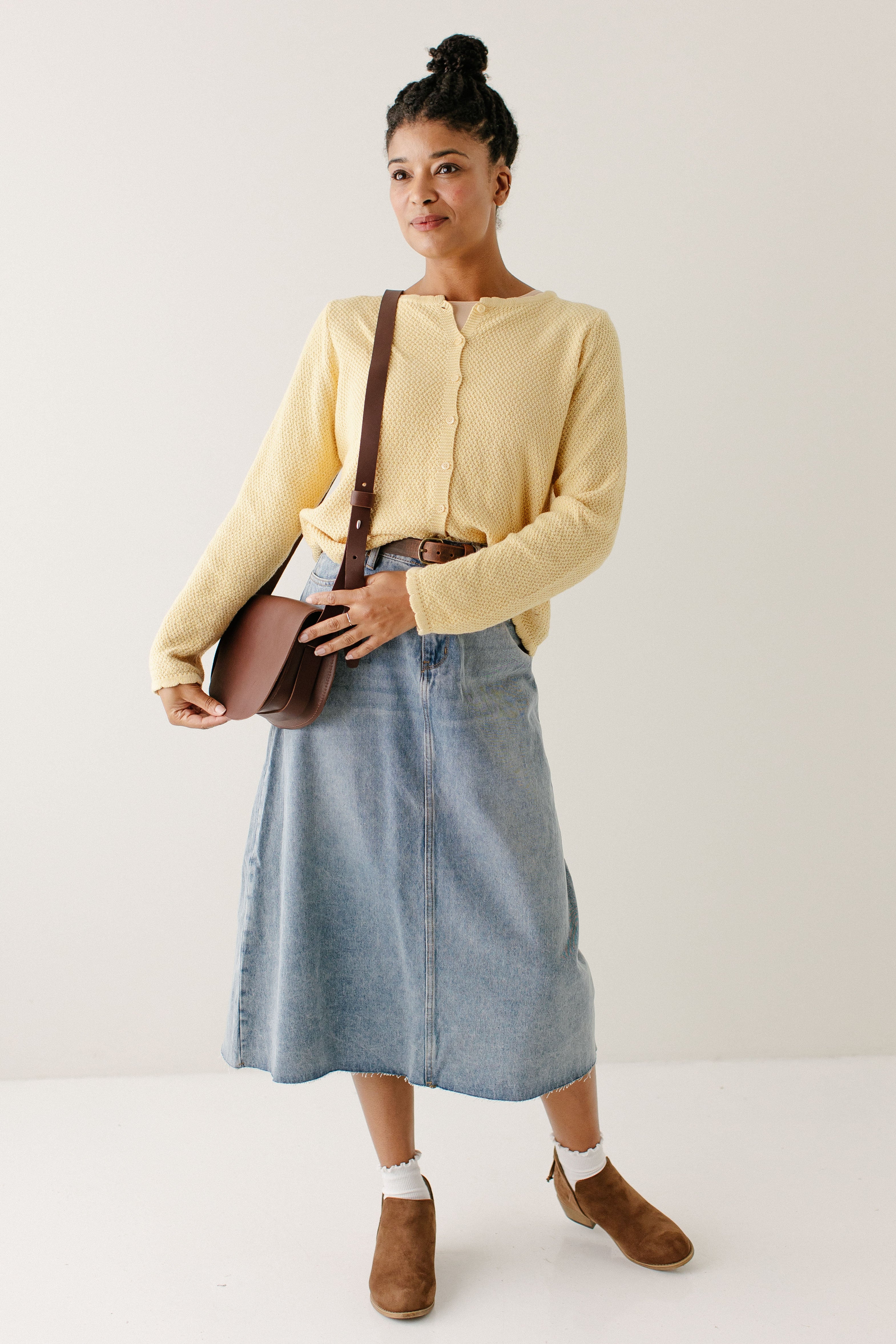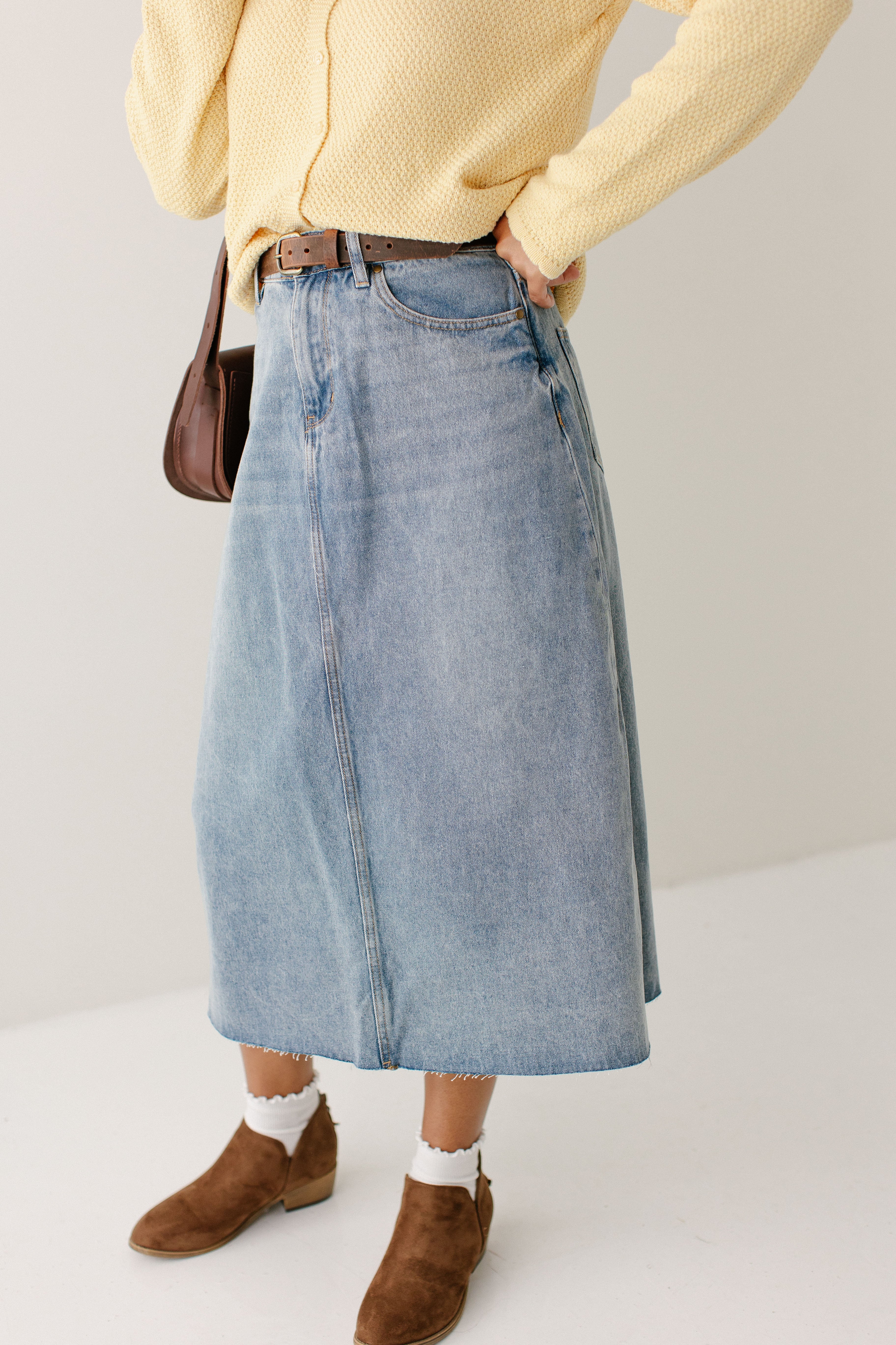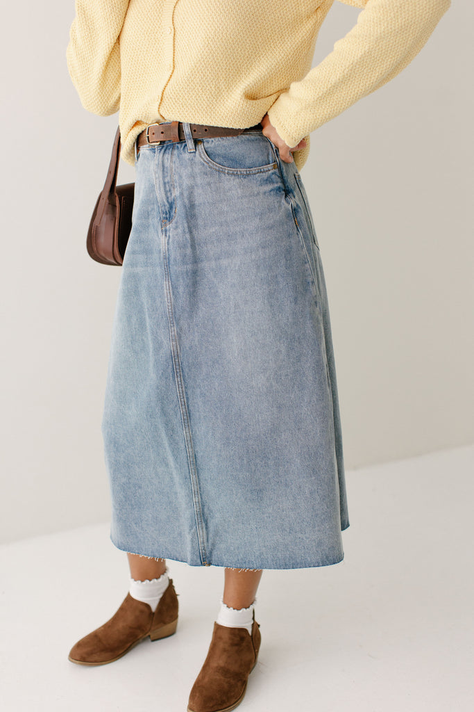 With a high waist, classic light wash, and a raw edge hem, the 'Brooke' A-Line Denim Skirt is bound to become a favorite in your denim collection! It is a true high waisted skirt designed to be worn high at the smallest part of the waist while the hem flares out for a flattering fit. We love the lived in look of this no-stretch midi denim skirt!The raw hem can easily be cut to make this skirt your desired length. Wear it casual with white sneakers and a tee or pair it with a classic button down for a chic vintage-inspired style!