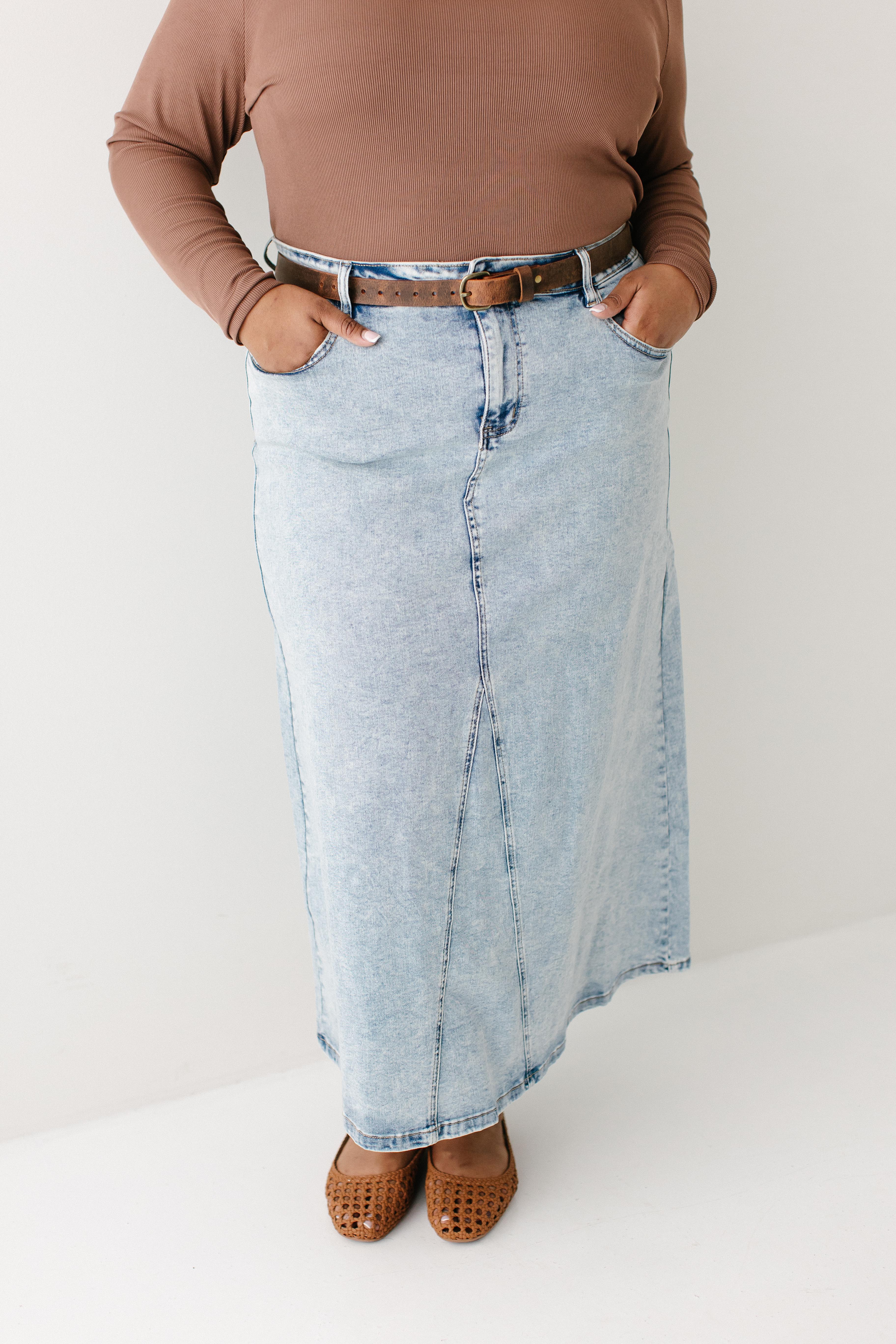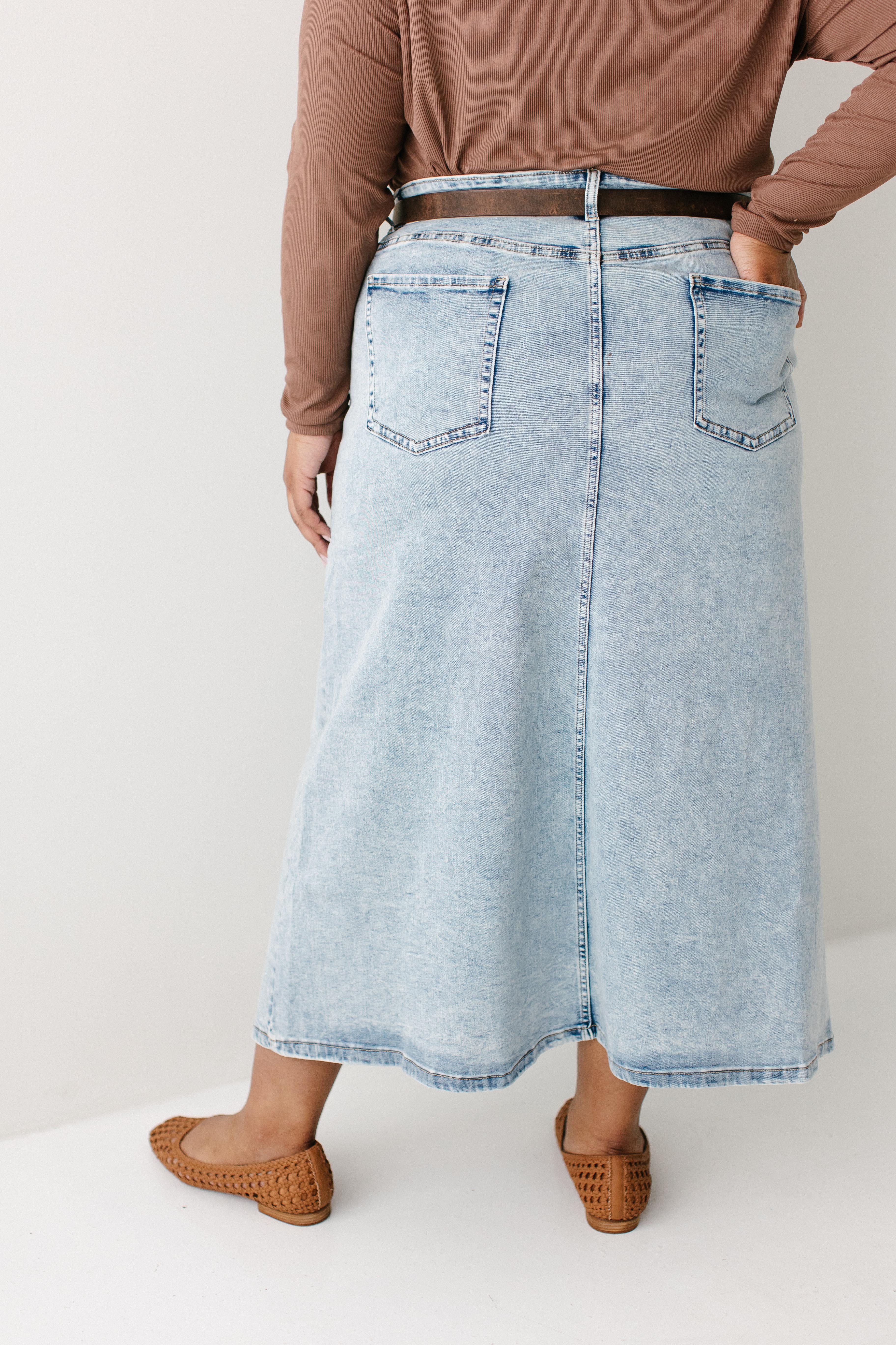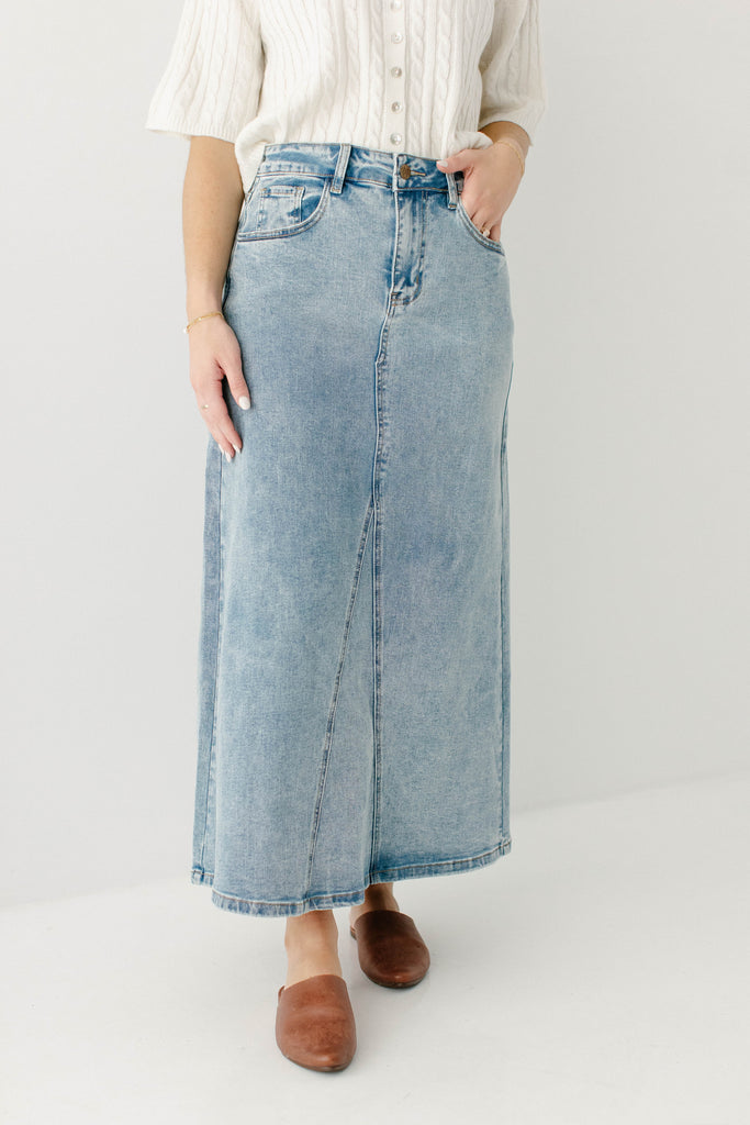 A new favorite, the 'Brooklyn' denim maxi skirt is an essential for your closet. This denim maxi skirt features a stunning vintage wash and comfortable silhouette, so you can be stylish on the go. Pair with a fitted blouse and a tote bag for the perfect look for the farmer's market or a brunch with friends! Exclusively designed by us with you in mind.
