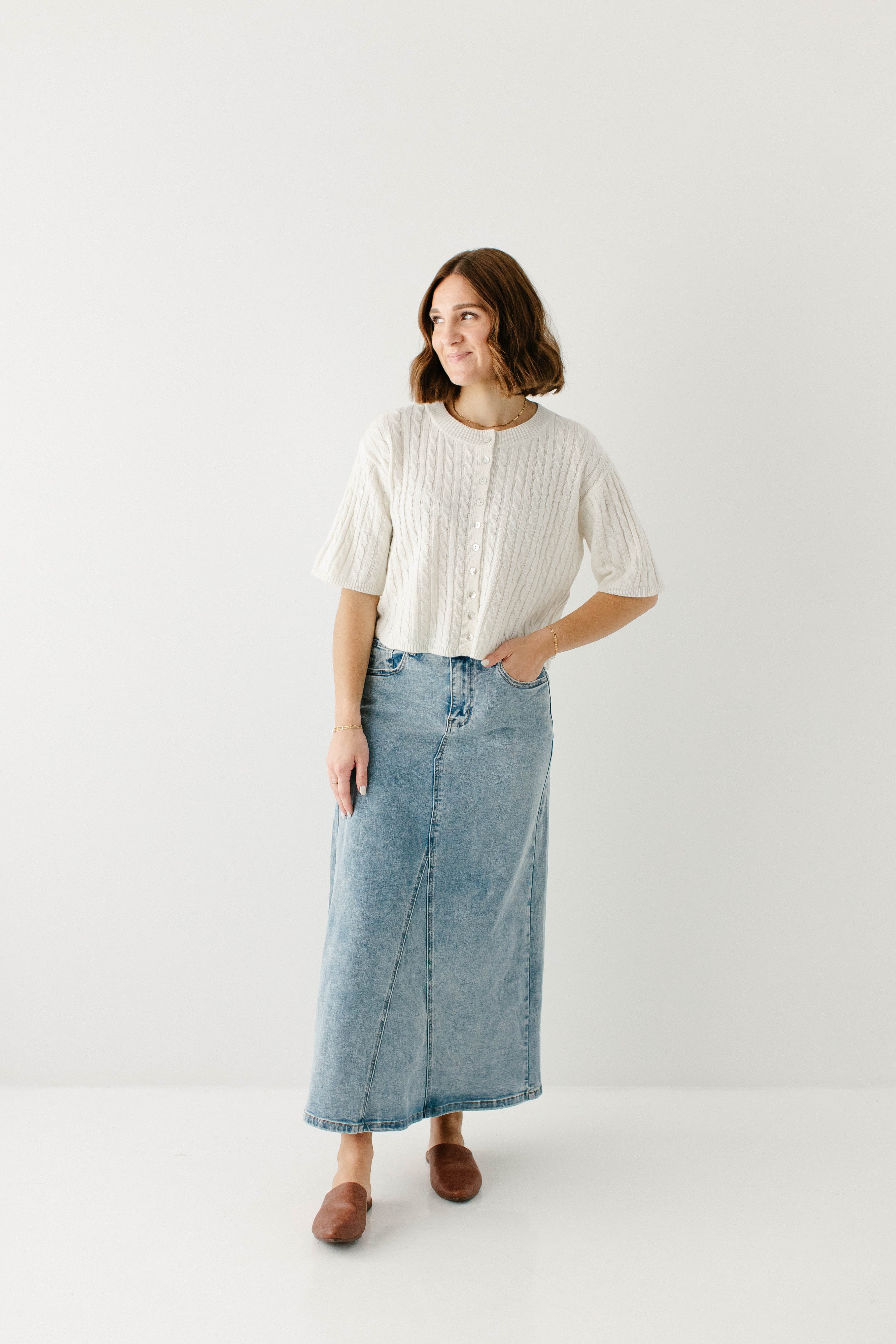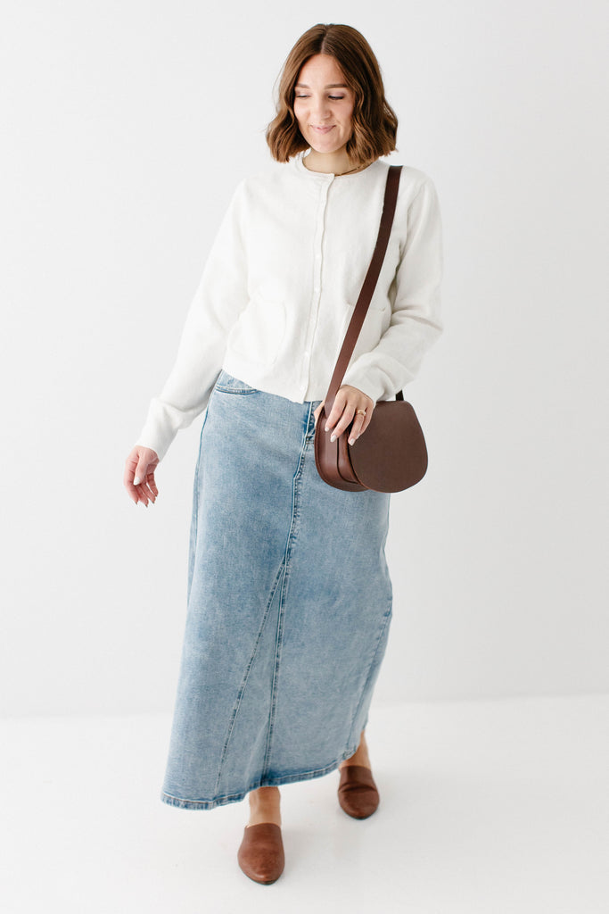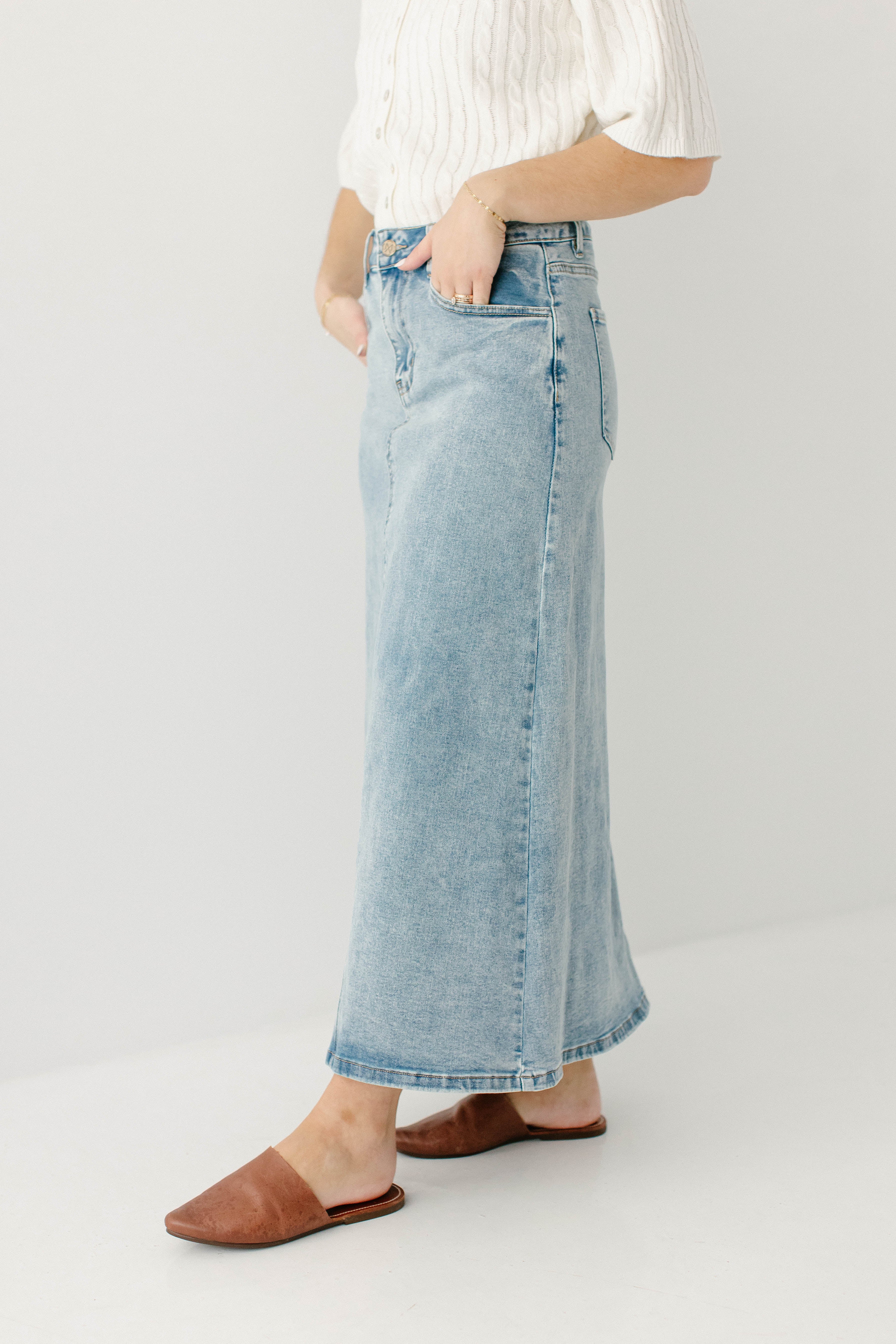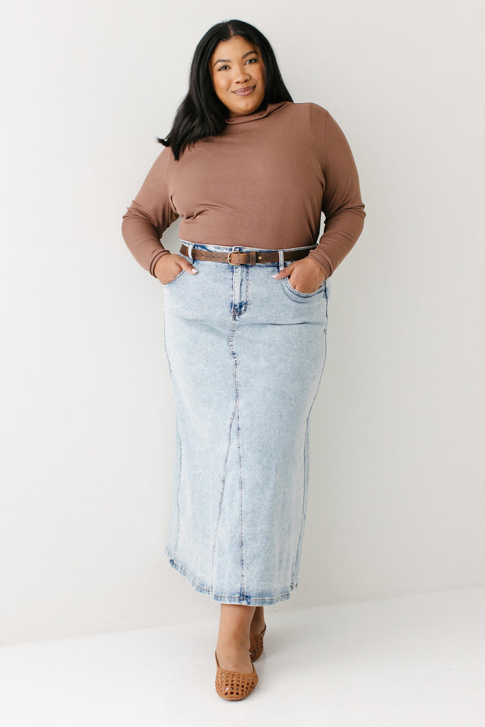 A new favorite, the 'Brooklyn' denim maxi skirt is an essential for your closet. This denim maxi skirt features a stunning vintage wash and comfortable silhouette, so you can be stylish on the go. Pair with a fitted blouse and a tote bag for the perfect look for the farmer's market or a brunch with friends! Exclusively designed by us with you in mind.