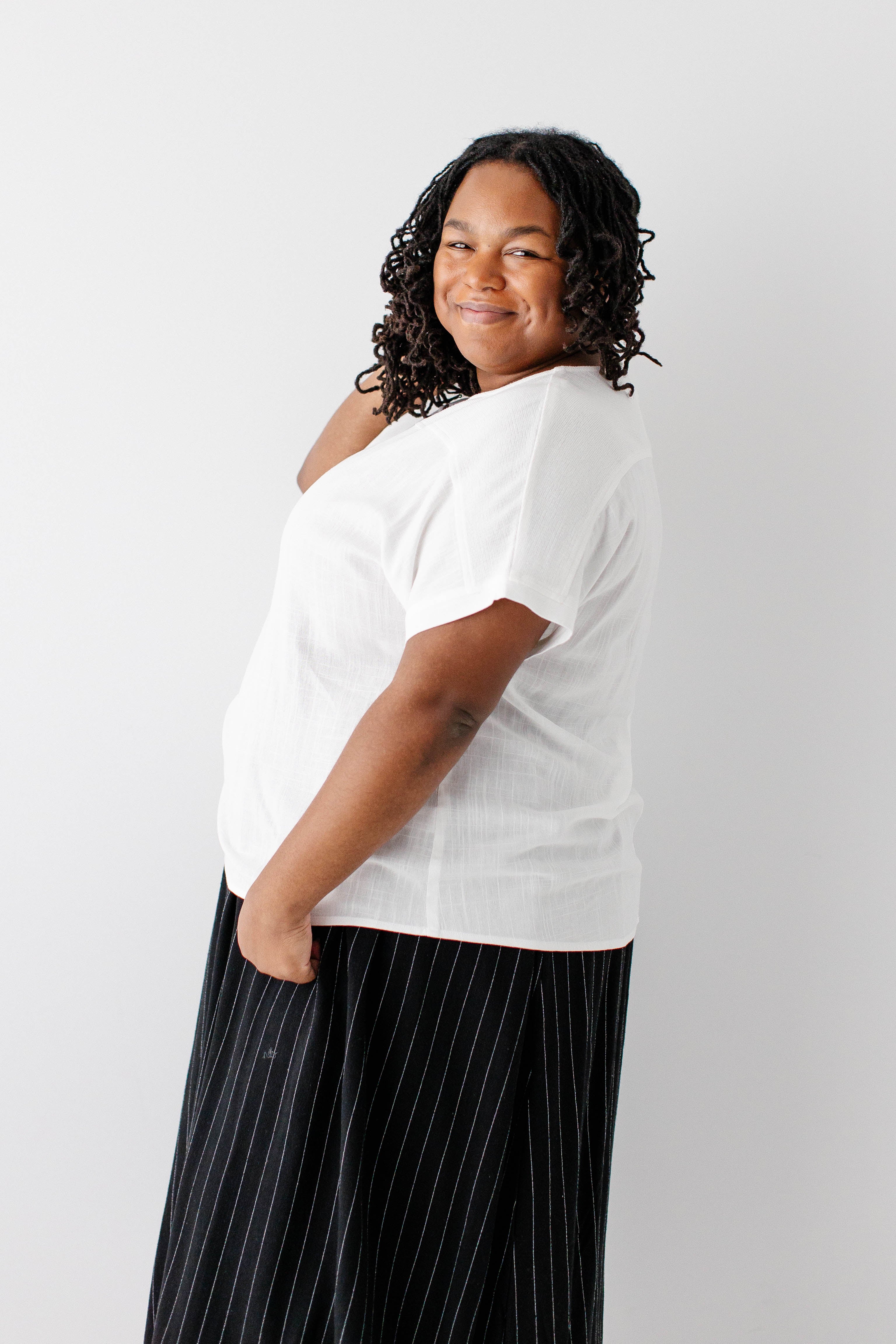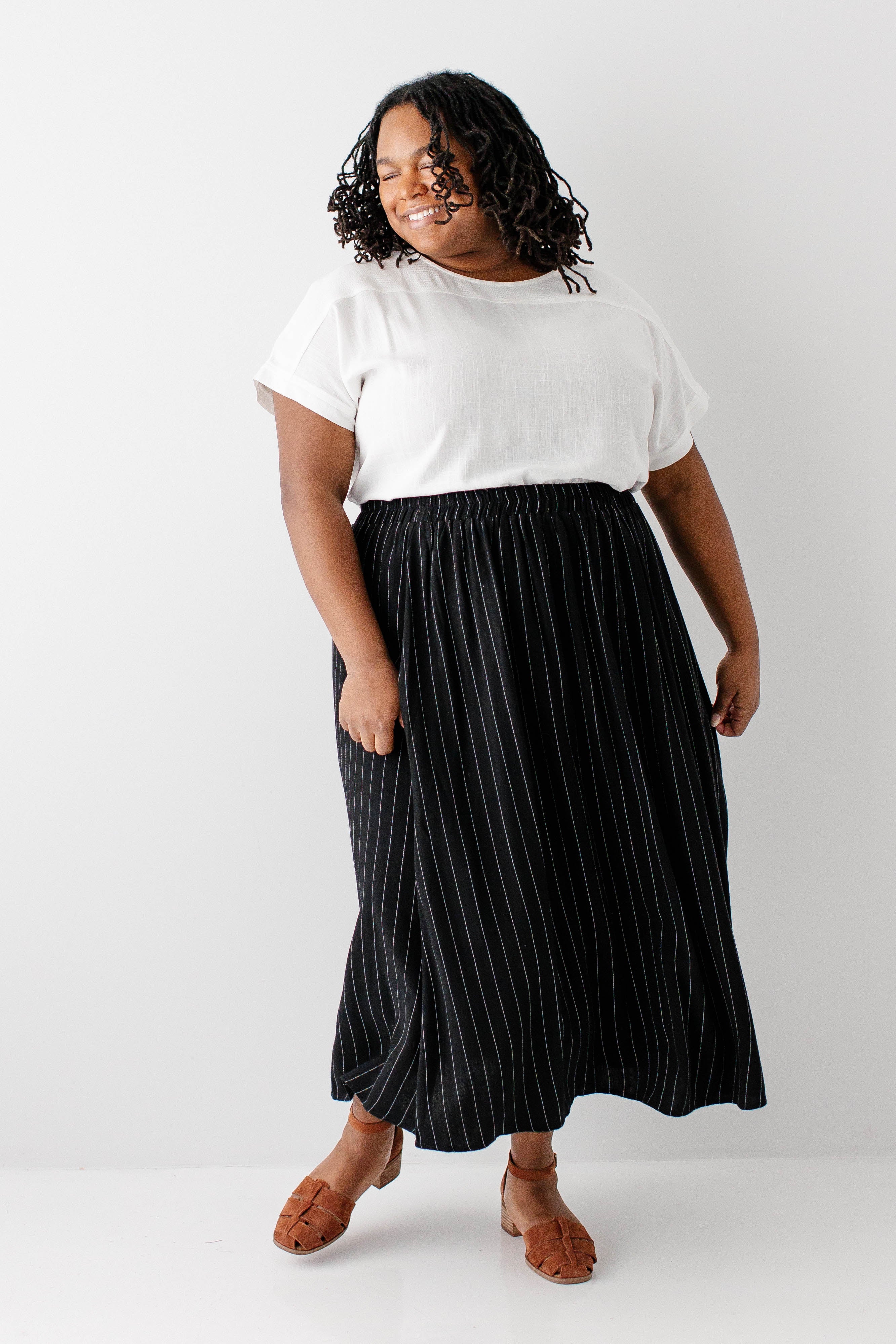 Model wearing the 'Callie' Textured Dolman Sleeve Top with the Plus 'Dion' Pinstripe A-Line Midi Skirt and the