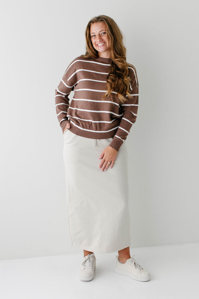 A classic piece that is perfect for seasonal transition, the 'Camden' stripe cotton sweater is an absolute must-have. Cozy up next to a fire, elevate your office wardrobe, or wear out to coffee with a friend – this sweater is an essential piece for any wardrobe. Pair with your favorite denim skirt and white sneakers for a casual and sophisticated ensemble! Exclusively designed by us with you in mind.