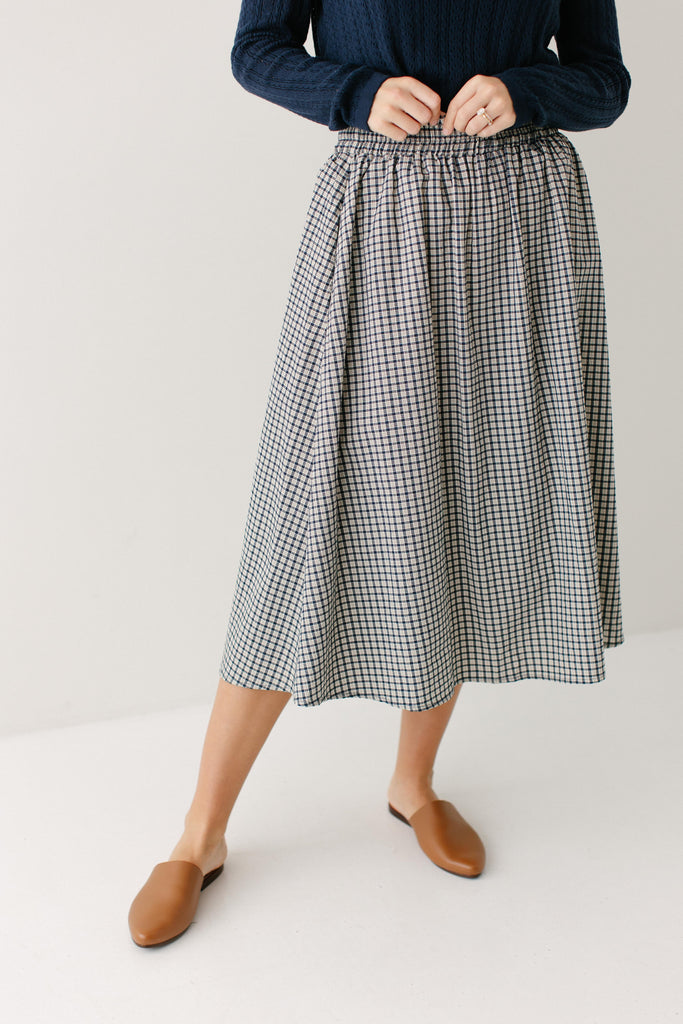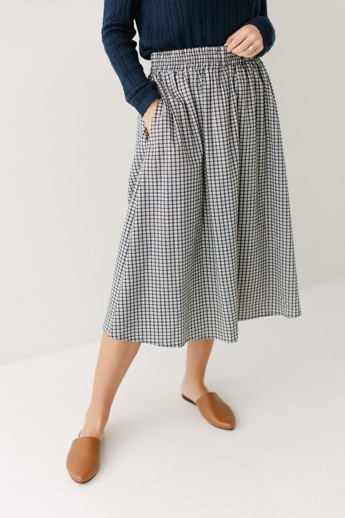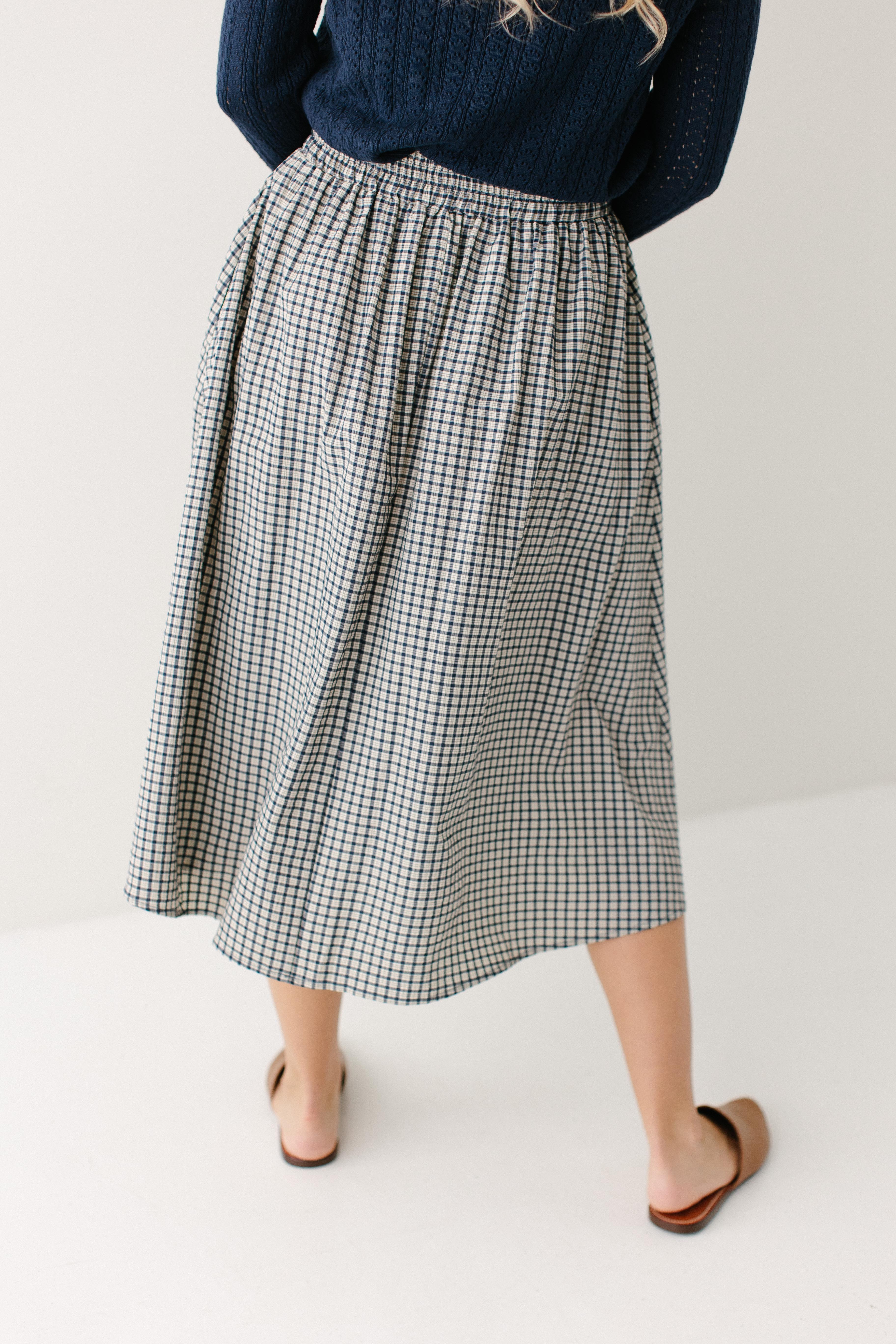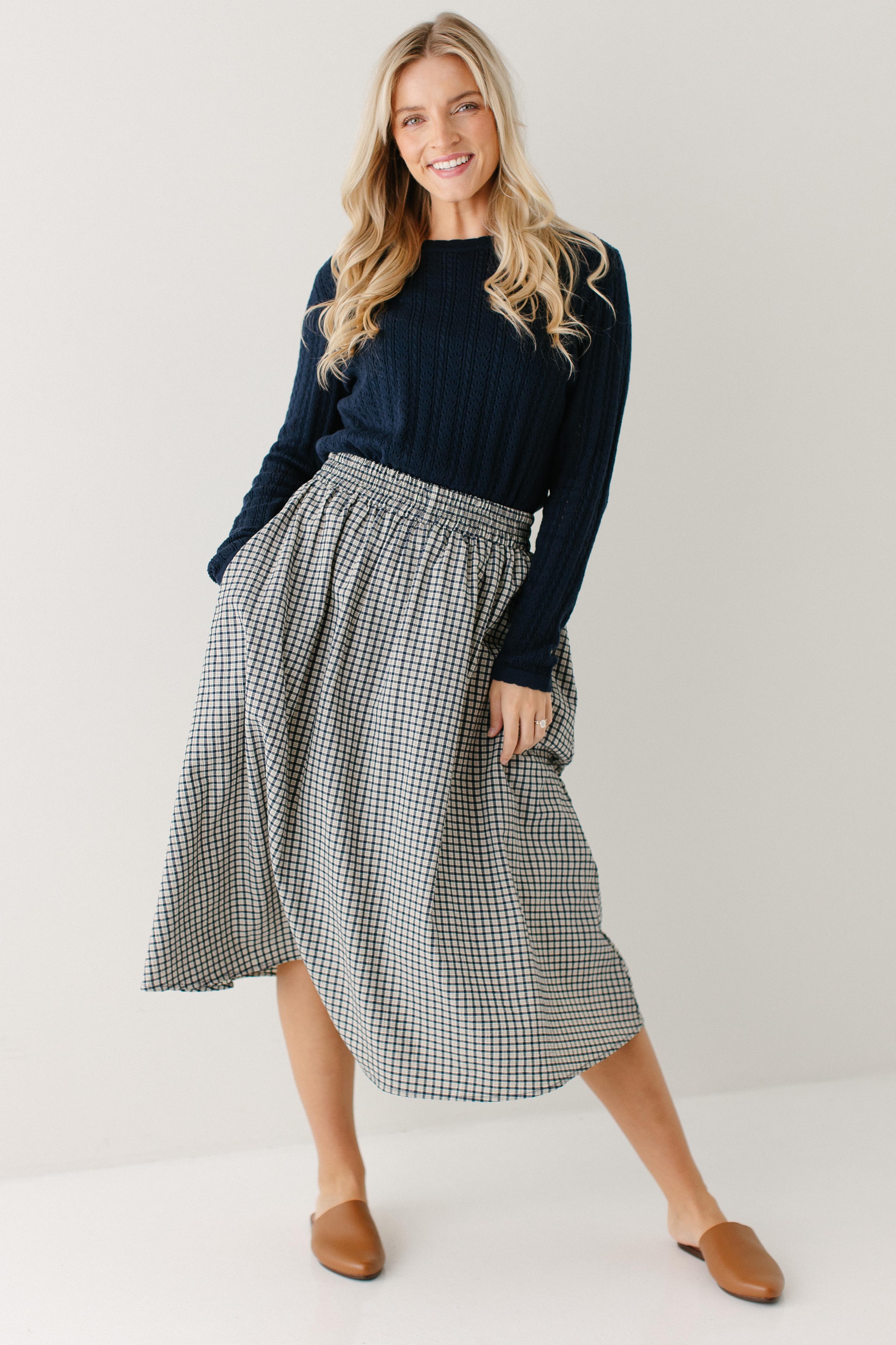 Meet the 'Candace' Navy Plaid A-Line Midi Skirt, made with a cotton blend fabric and navy plaid print on a cream background - perfect for all your fall and winter activities! Pair the ‘Candace’ with your favorite solid sweater and sneakers for a casual look, or dress up with boots.
