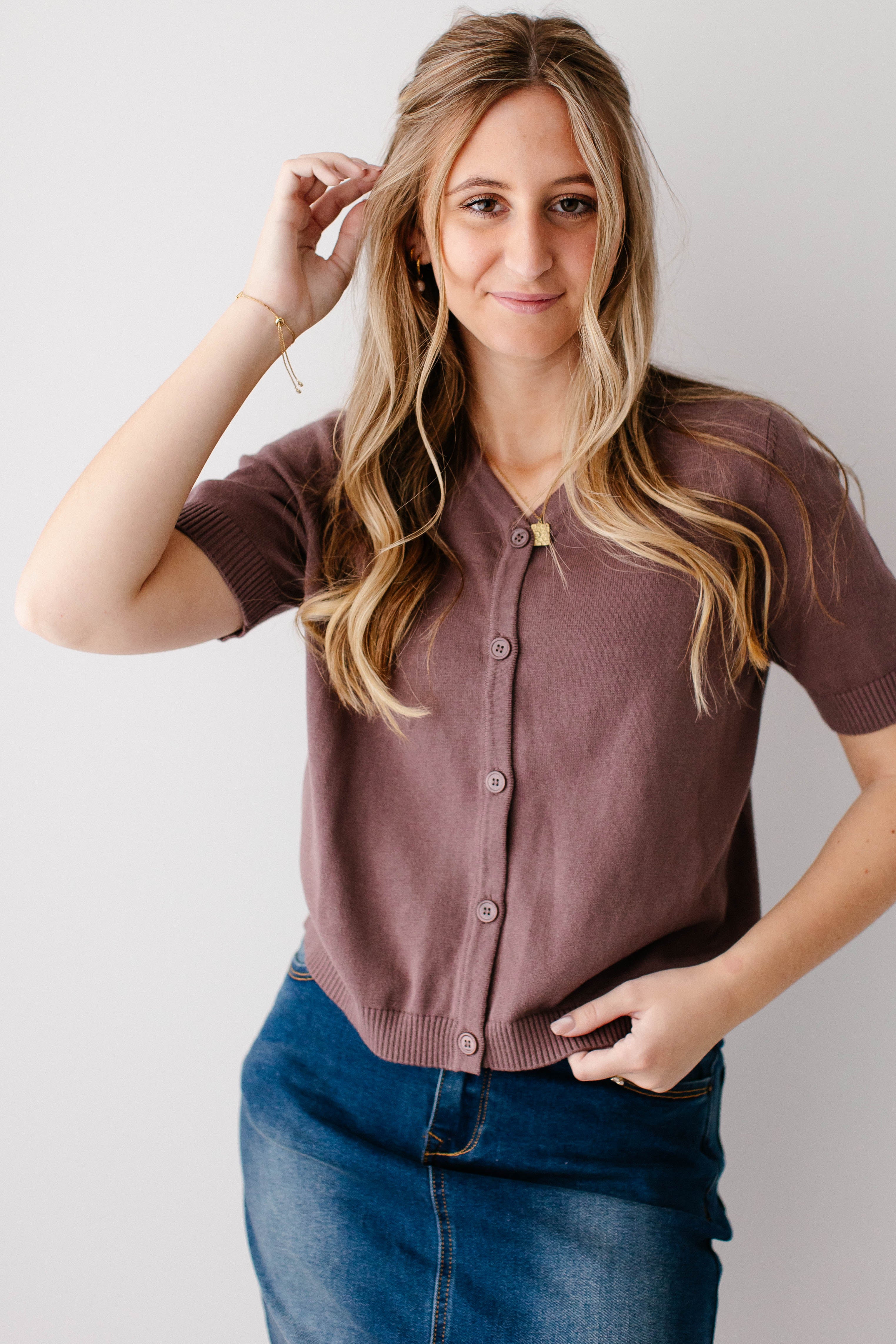 Your next favorite staple piece, the 'Catherine' Short Sleeve Cotton Cardigan! Made from 100% cotton in a beautiful deep mauve color with functional, nursing friendly buttons, it is the perfect amount of fun and practicality all in one. Just pair with your favorite denim or neutral skirt for a cute and comfortable outfit for a day in the town. Exclusively designed by us with you in mind.