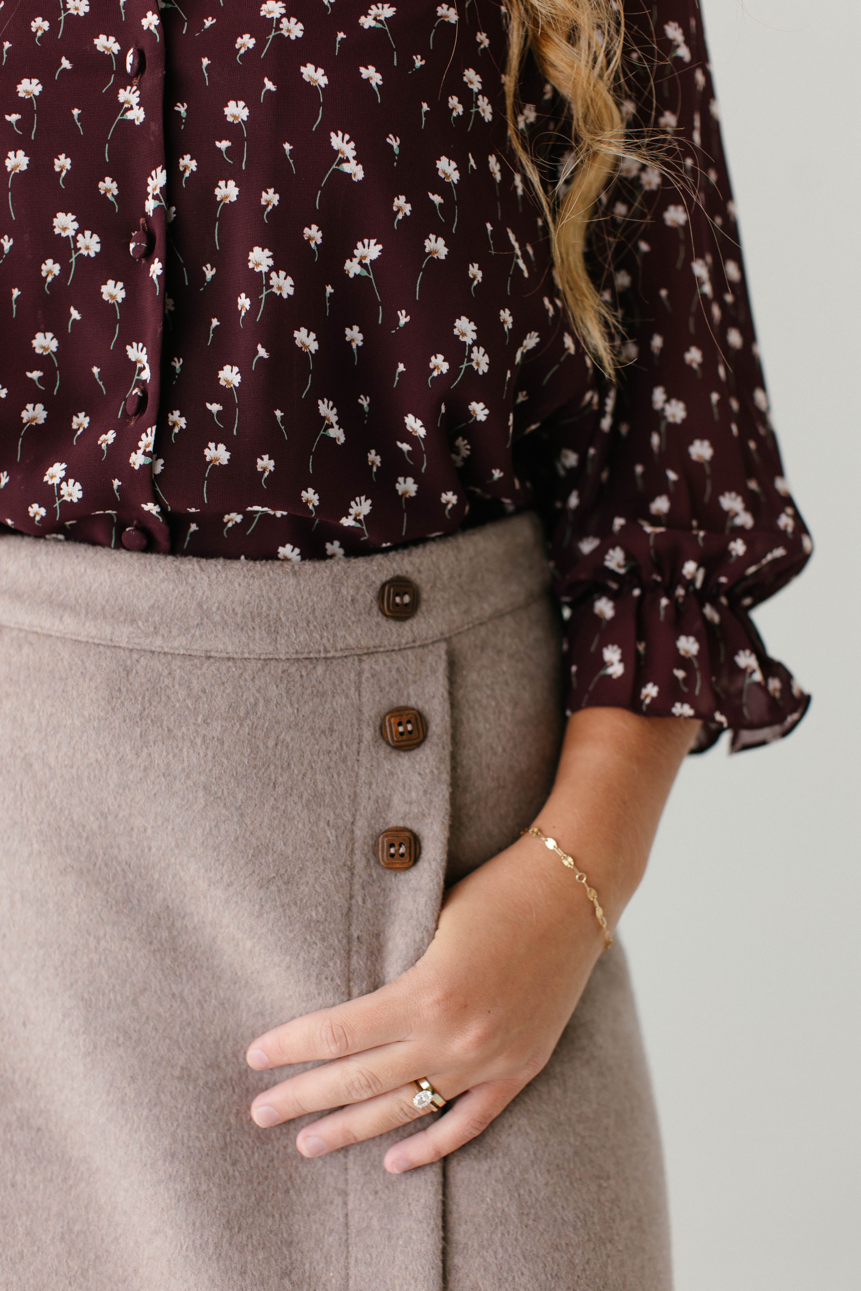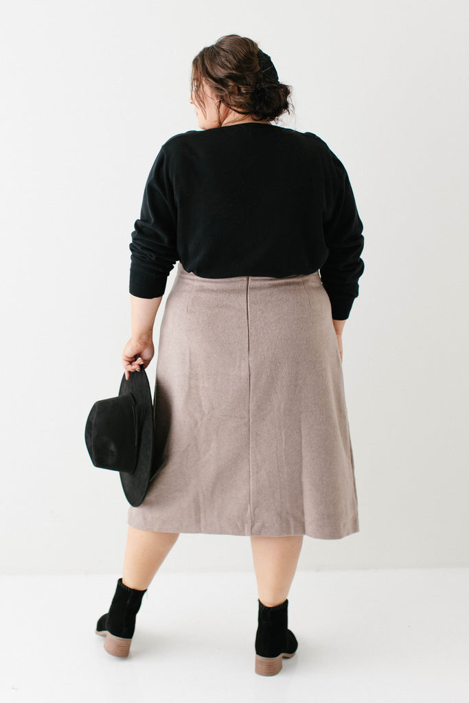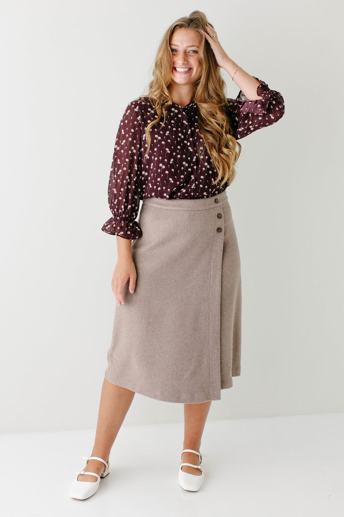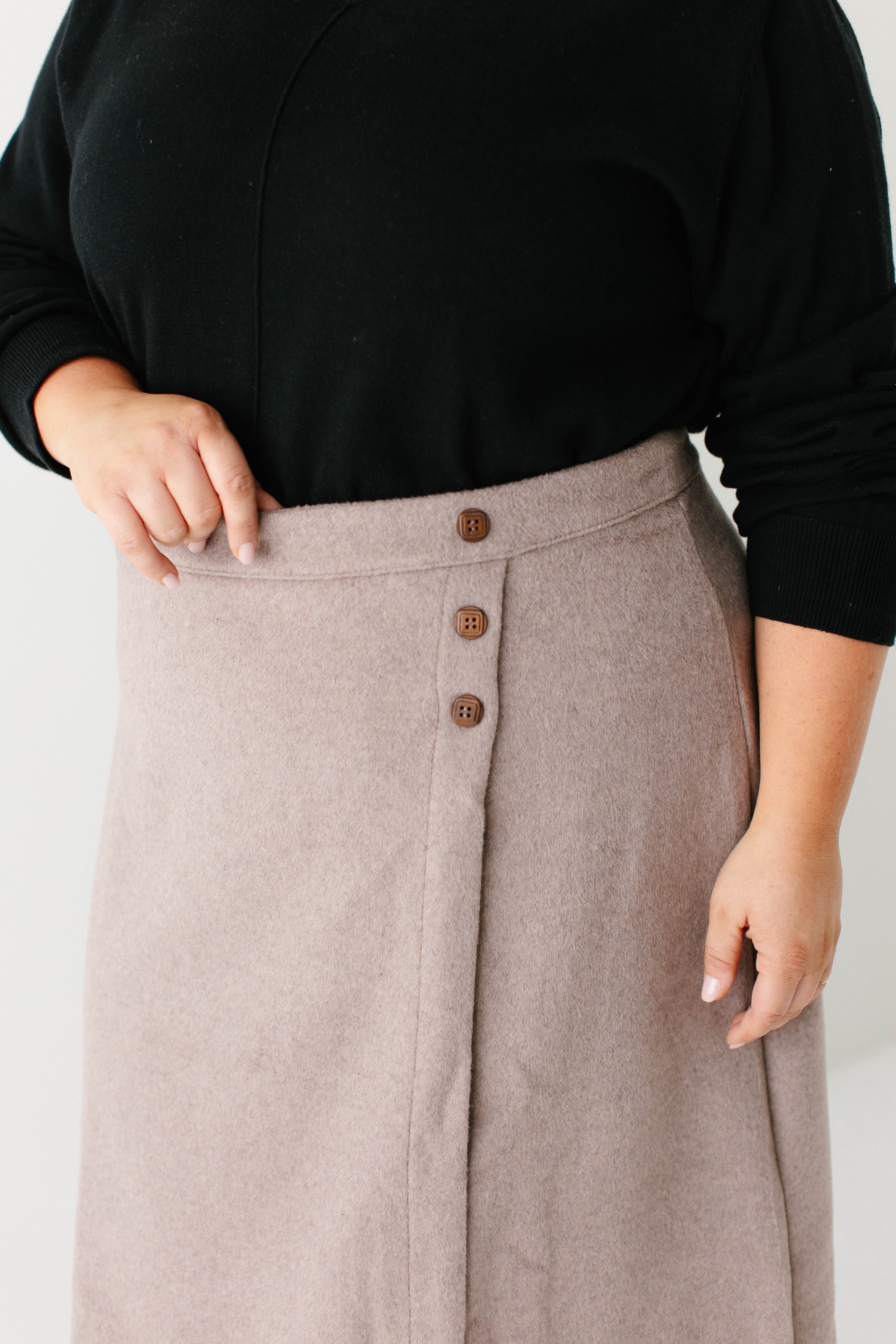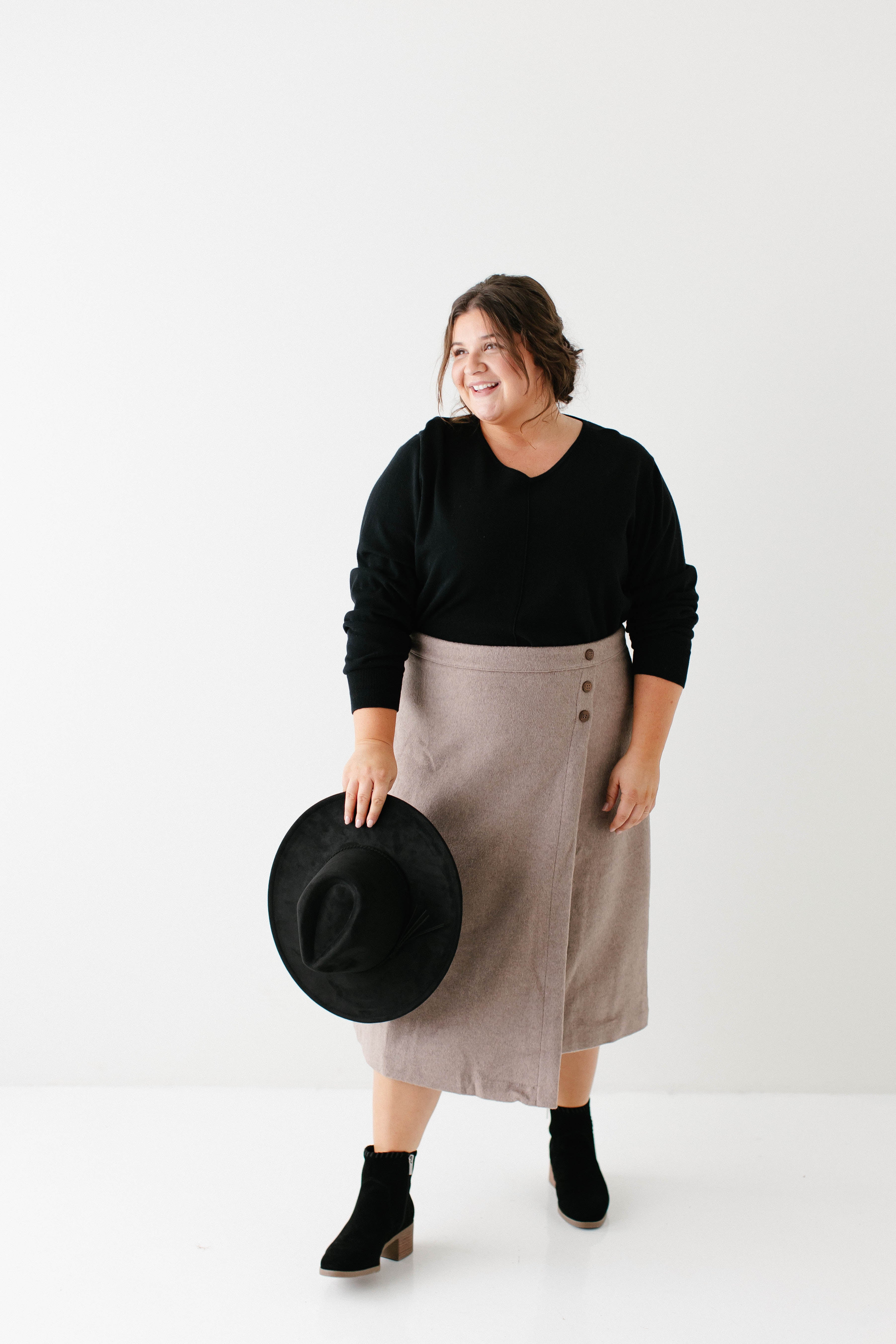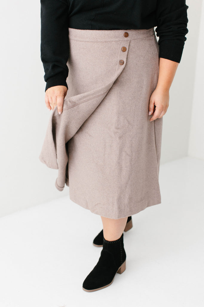 A wool skirt that will stay with you all season! The 'Charlotte' Wool Blend A-line Skirt is made out of a warm wool blend that will keep you cozy through the winter months! Made in a classy faux wrap design with wooden button detail, and a modest midi length you are sure to love. Pair with any neutral turtleneck for your perfect dark academia look. Exclusively designed by us with you in mind.