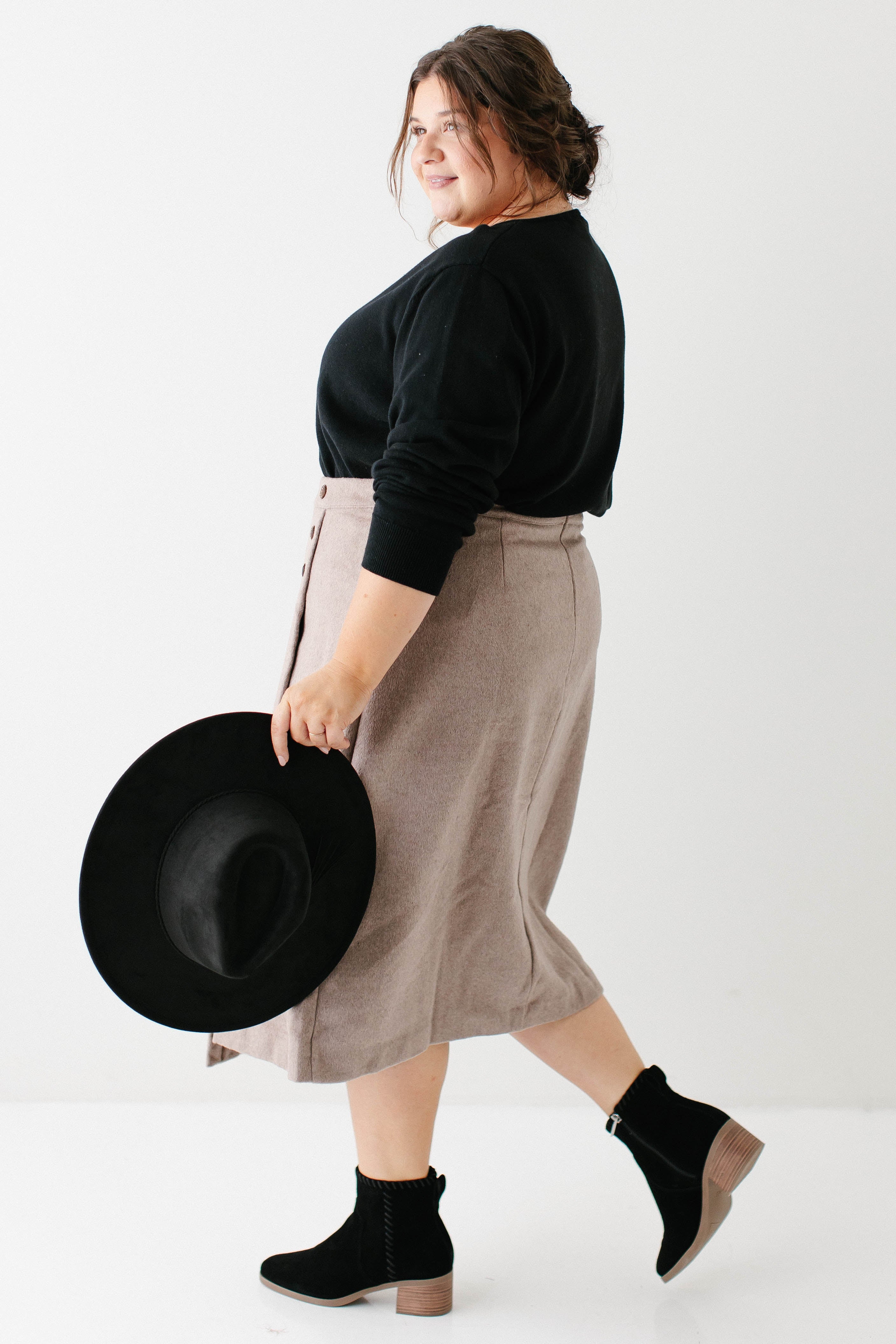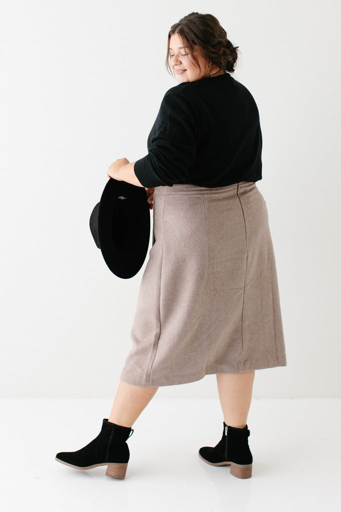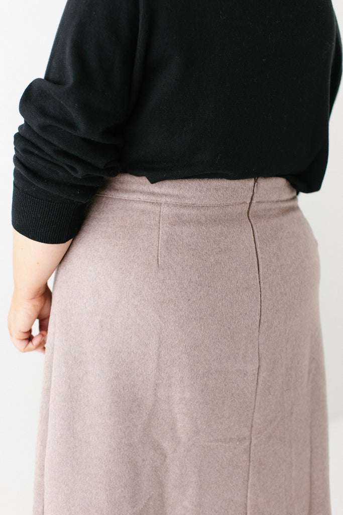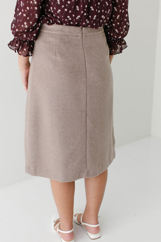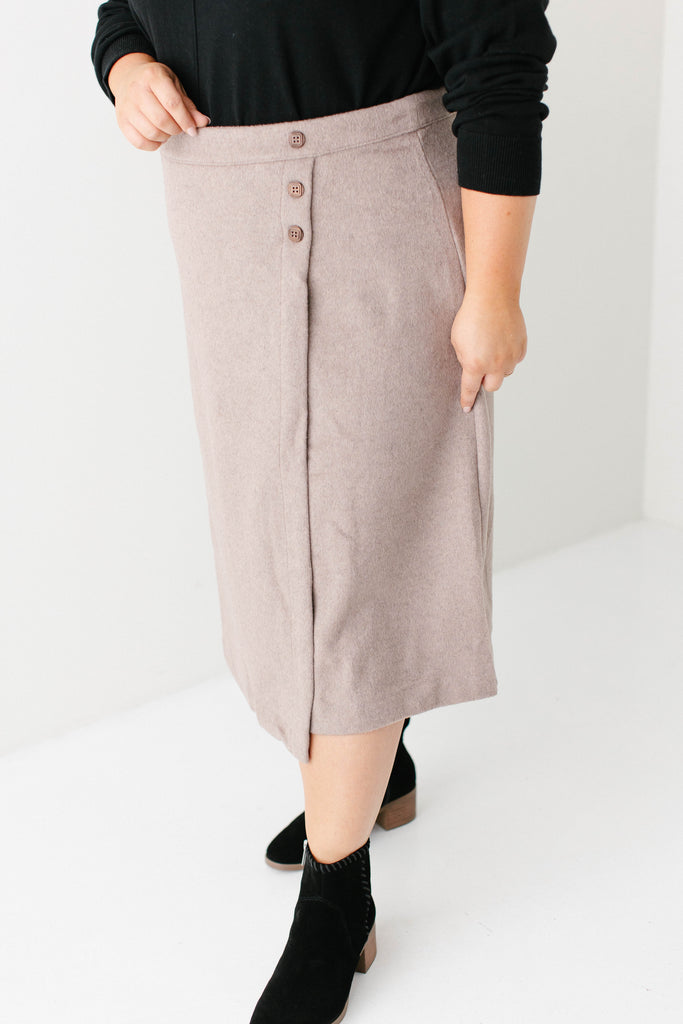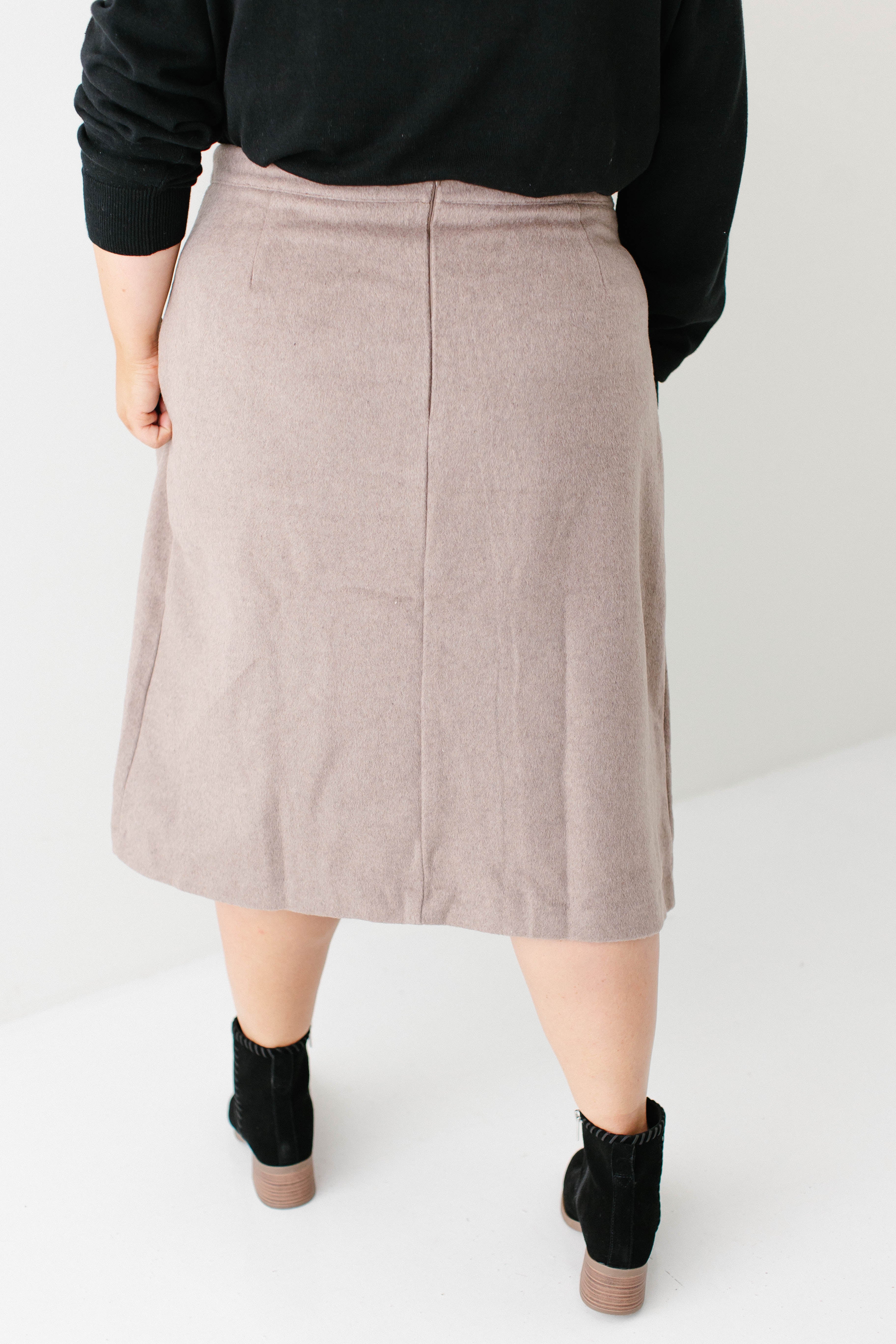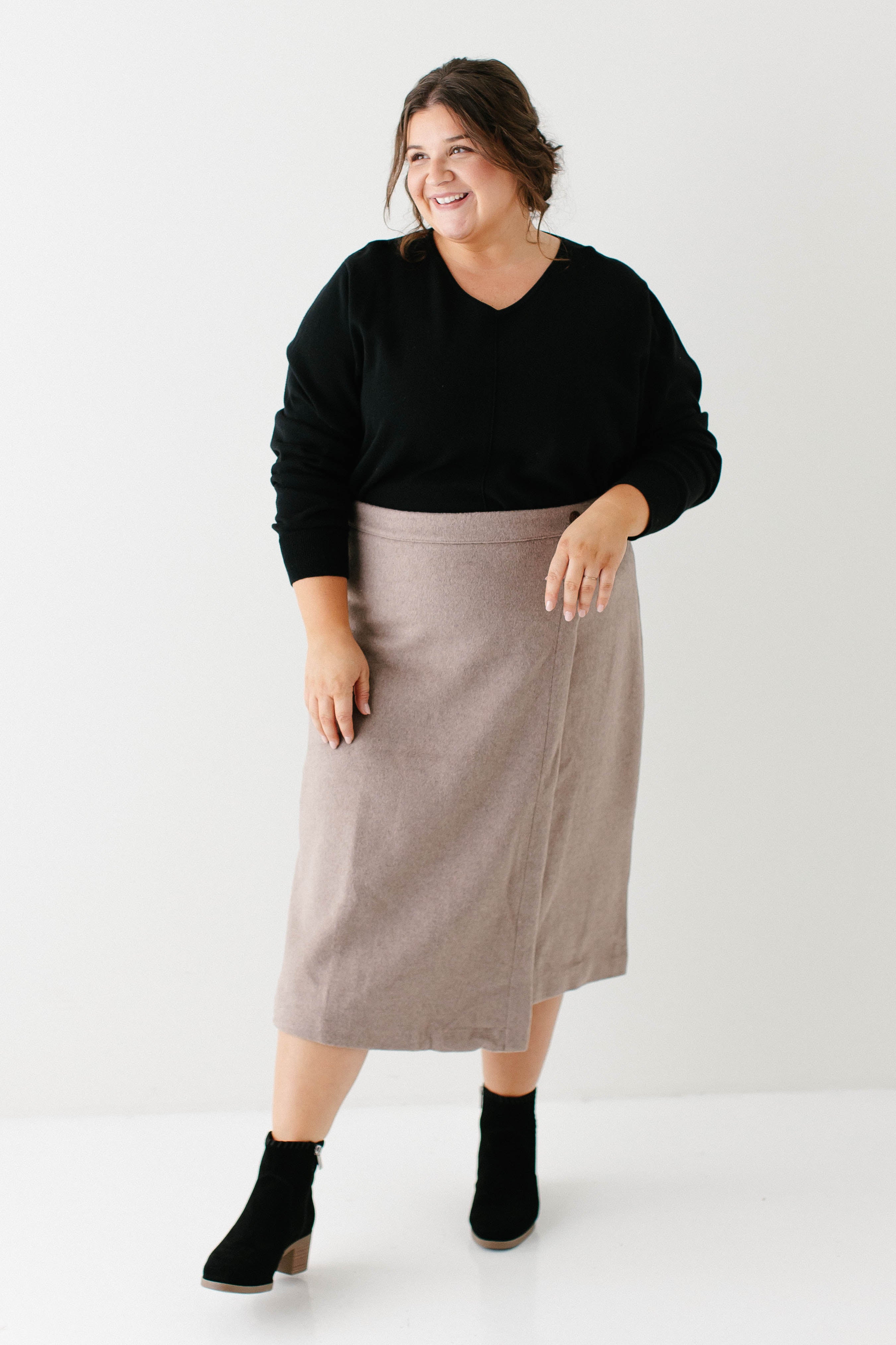 A wool skirt that will stay with you all season! The 'Charlotte' Wool Blend A-line Skirt is made out of a warm wool blend that will keep you cozy through the winter months! Made in a classy faux wrap design with wooden button detail, and a modest midi length you are sure to love. Pair with any neutral turtleneck for your perfect dark academia look. Exclusively designed by us with you in mind.