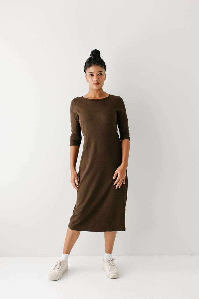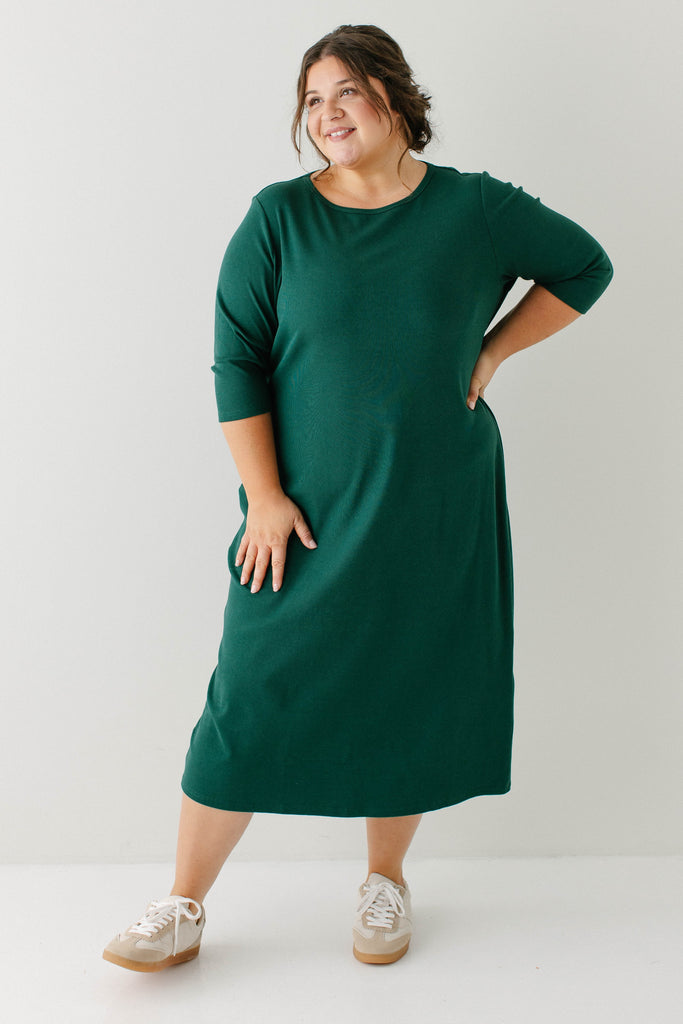 The popular ‘Constance’ dress - back and better than ever! The 'Constance' ¾ Sleeve Ribbed Bamboo Blend Midi Dress now comes in a ¾ length sleeve, modest round neckline, true midi length, and two fun colors: chocolate brown and emerald green. Layer it with your favorite denim jacket and boots for the perfect outfit to go to the pumpkin patch! Exclusively designed by us with you in mind.