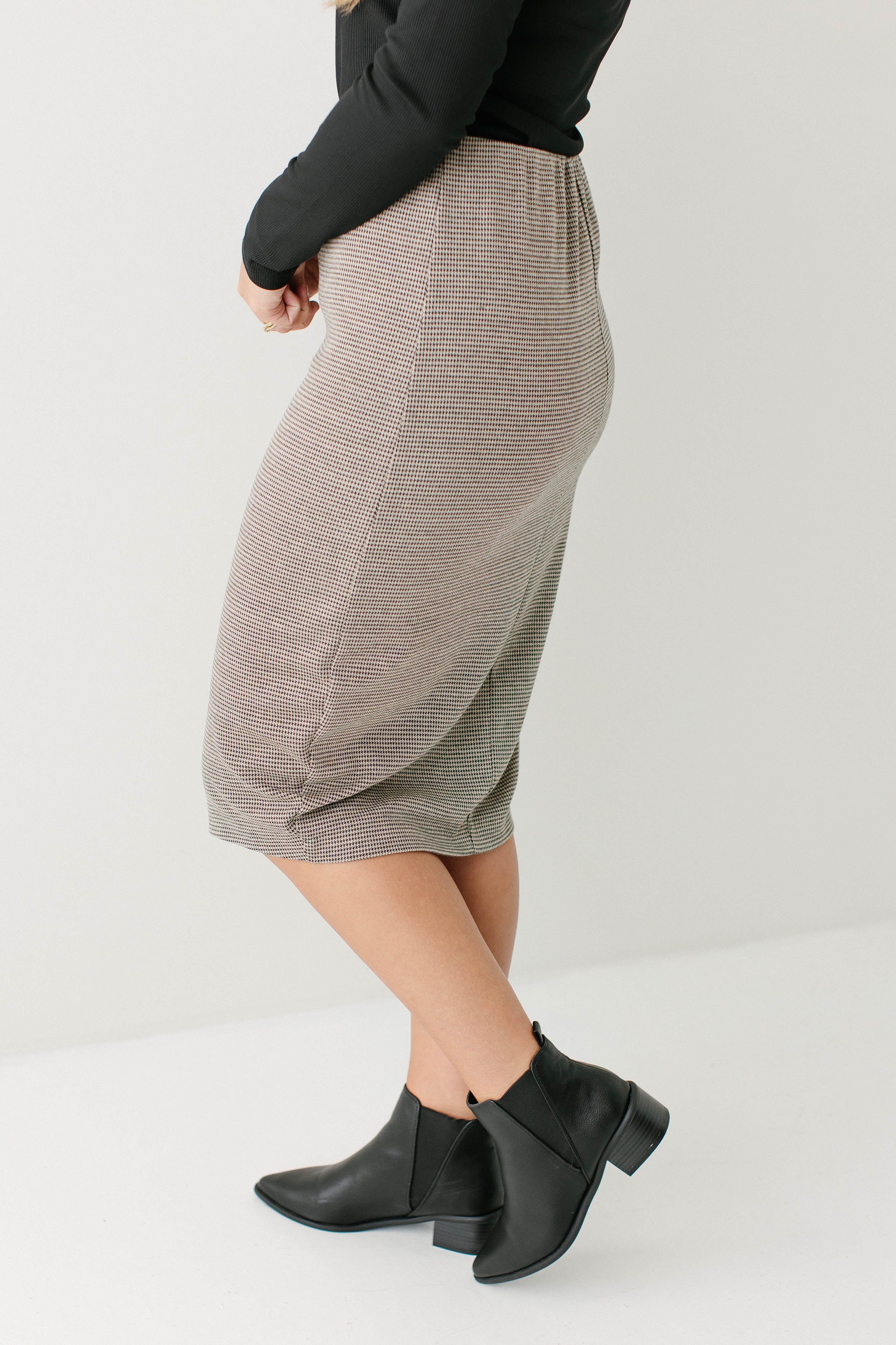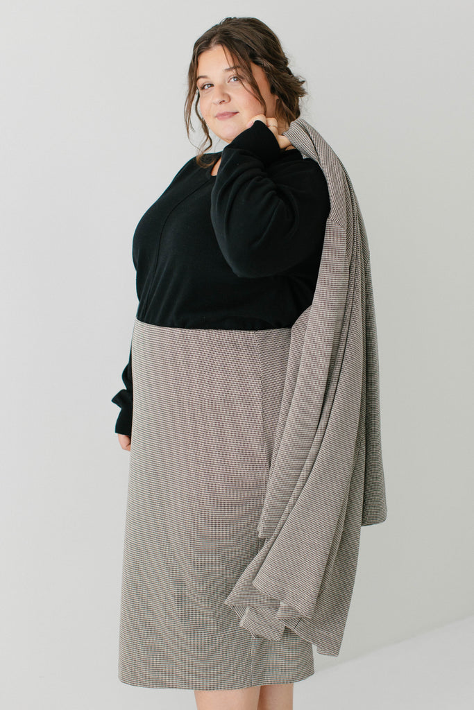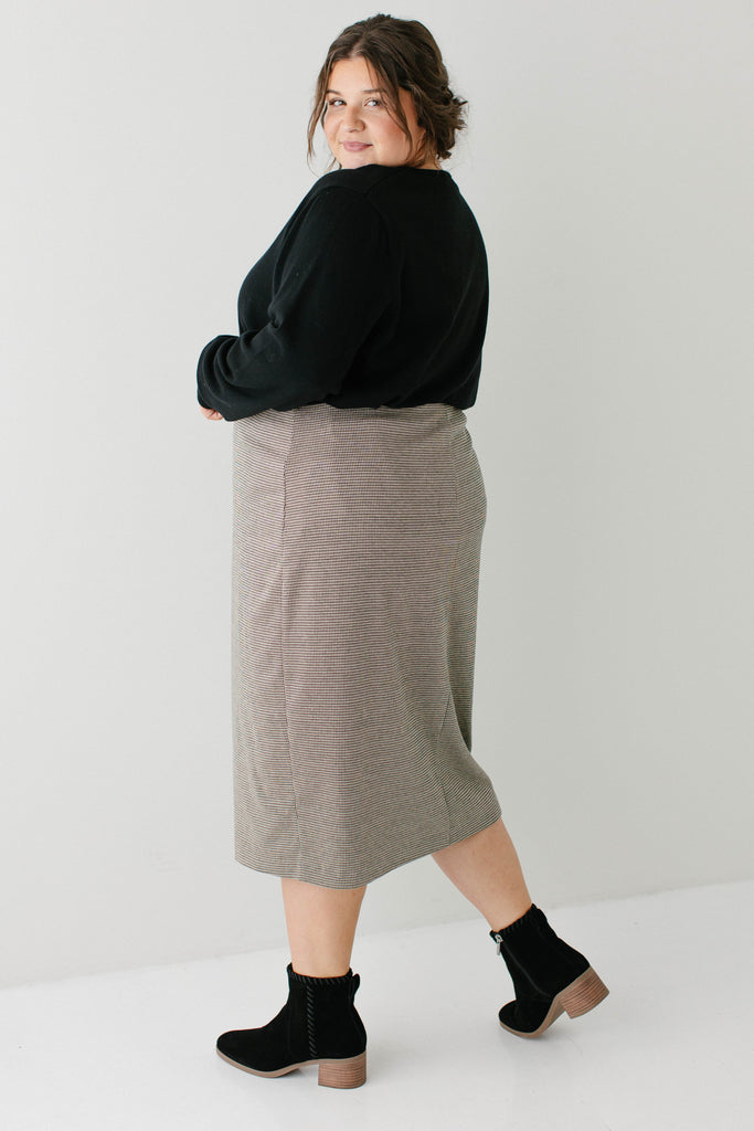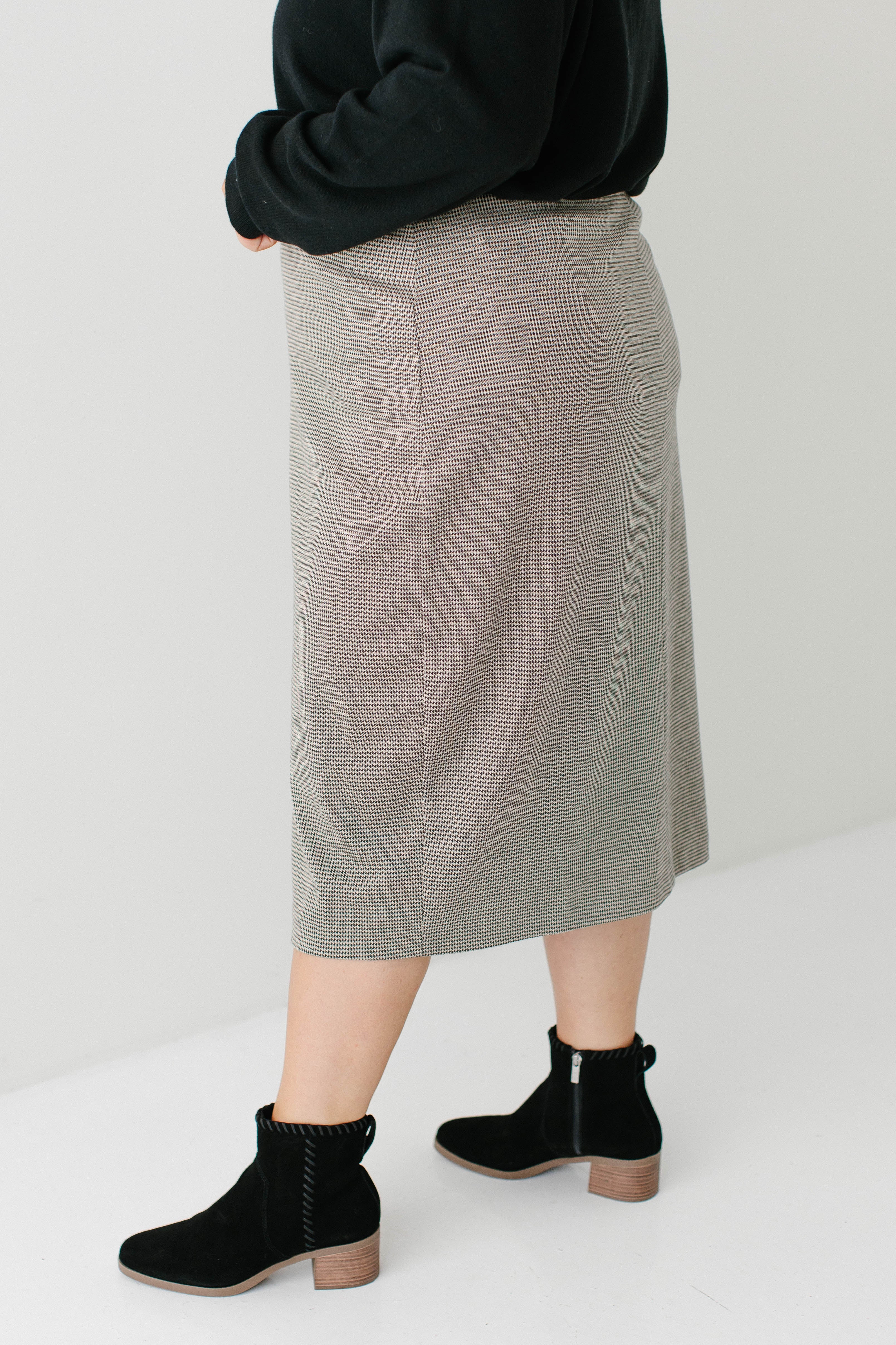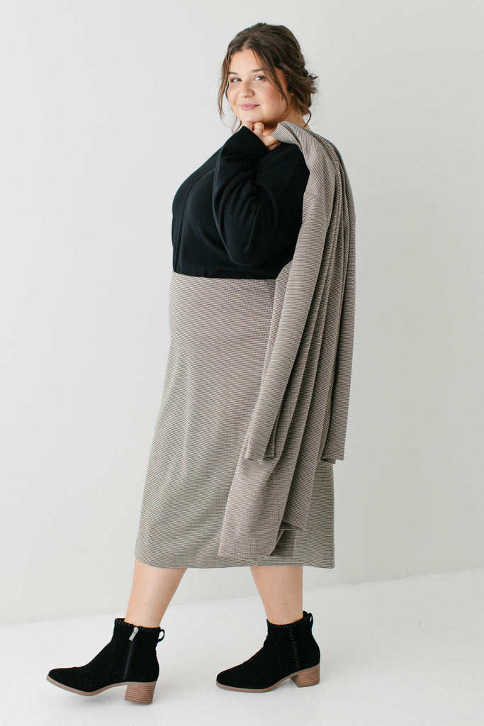 Houndstooth skirts + colder weather: one of our all-time favorite fashion trends! The 'Corryn' Pencil Skirt is an easy choice for the office, college campus, or Sunday morning. Compliment the hints of black and tan in the houndstooth print with a chic mock neck sweater in any of those tones. When the temperatures drop add a warm layer with leggings and ankle boots! Exclusively designed by us for you!