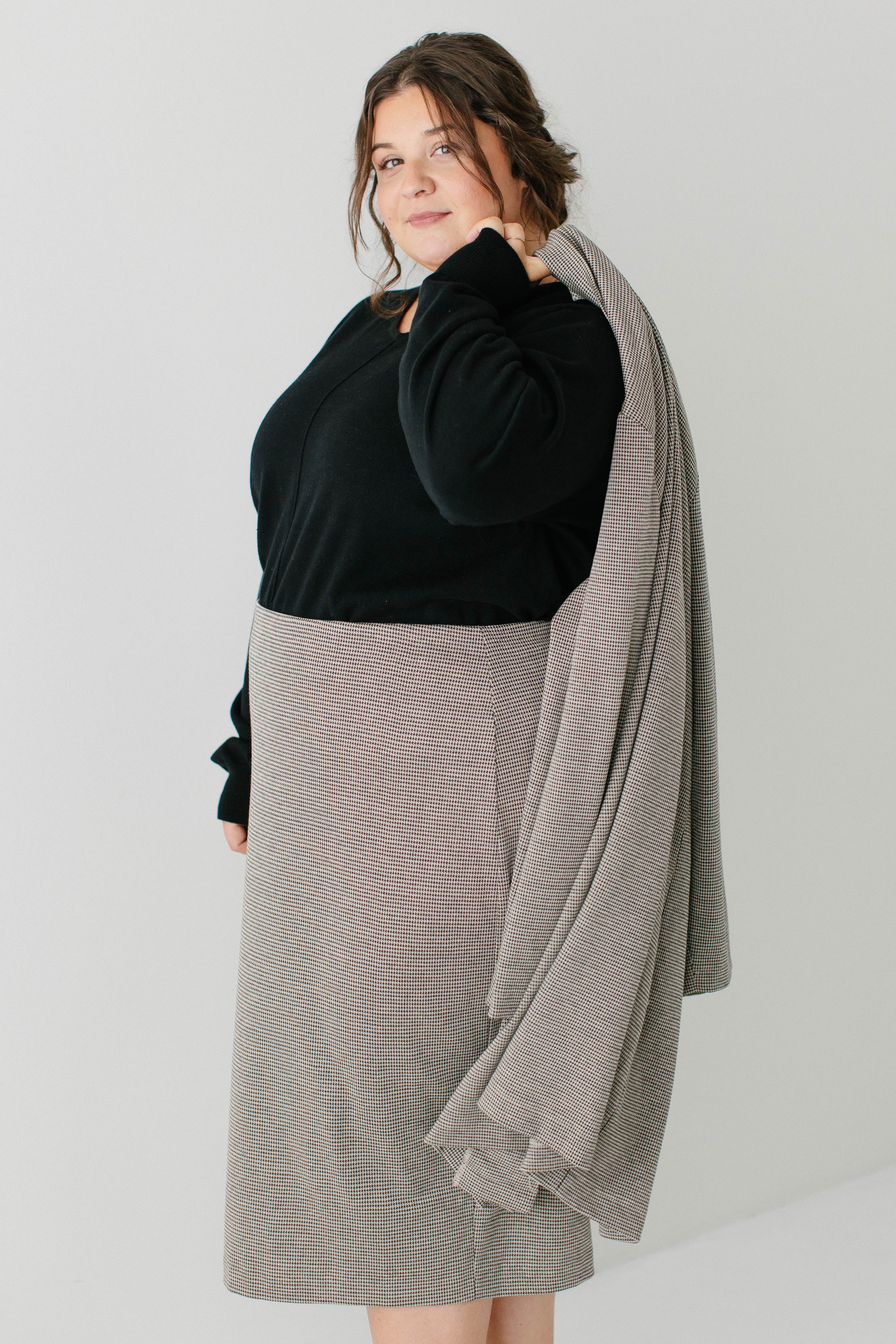 Model wearing the 'Zuri' Ribbed Turtleneck in Black with the 'Corryn' Houndstooth Pencil Midi Skirt