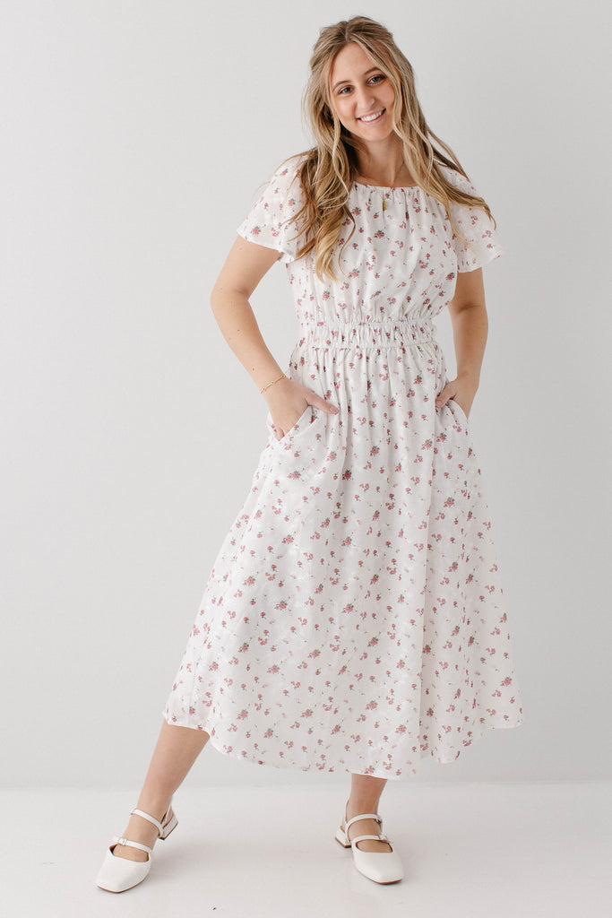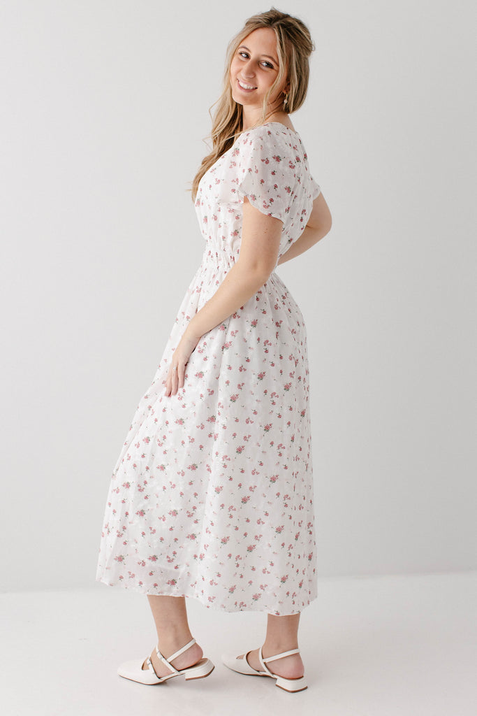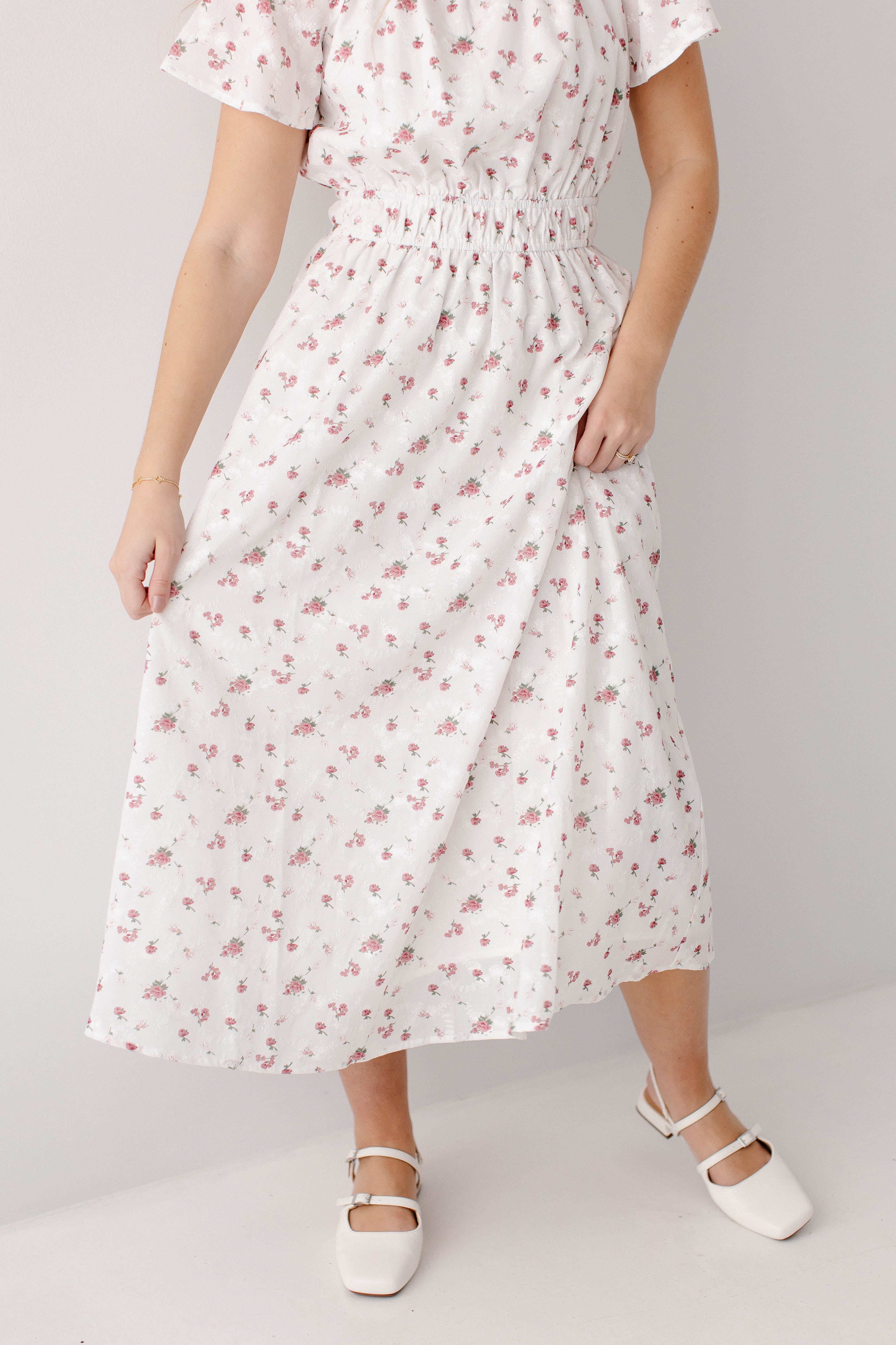 The popular ‘Cynthia’ dress is back! Featuring the same modest elastic neckline, flutter sleeves, double elastic waist, and midi length you all love, now in the cutest floral embroidered print perfect for Valentine’s Day, springtime, and beyond! And we designed this dress in girls’ sizes, so now you can match with your mini! Pair the ‘Cynthia’ with your favorite brown leather clutch for the cutest and classiest outfit. Exclusively designed by us with you in mind.