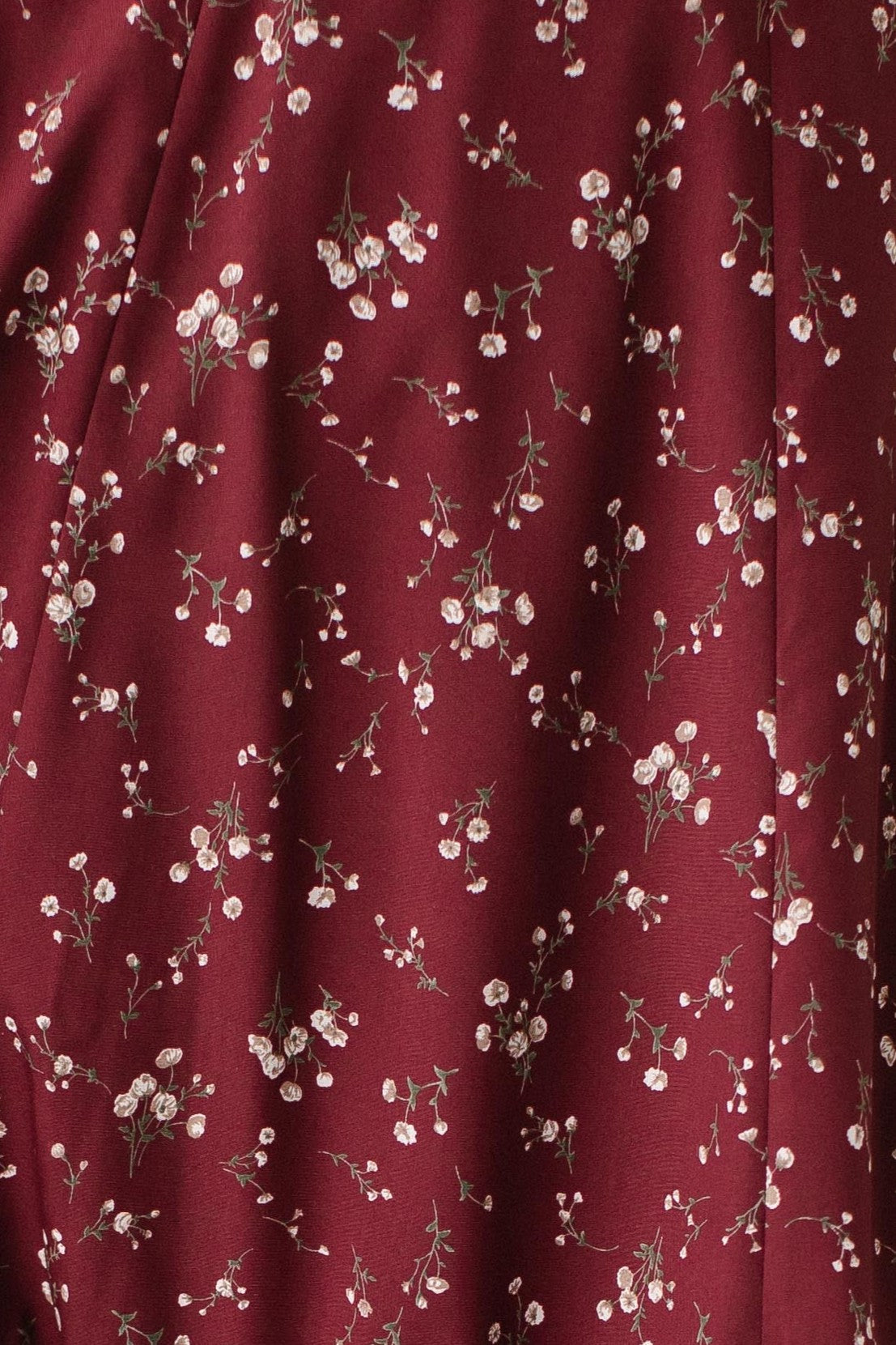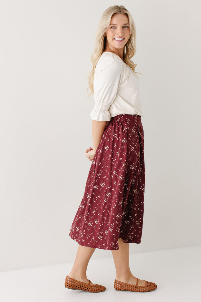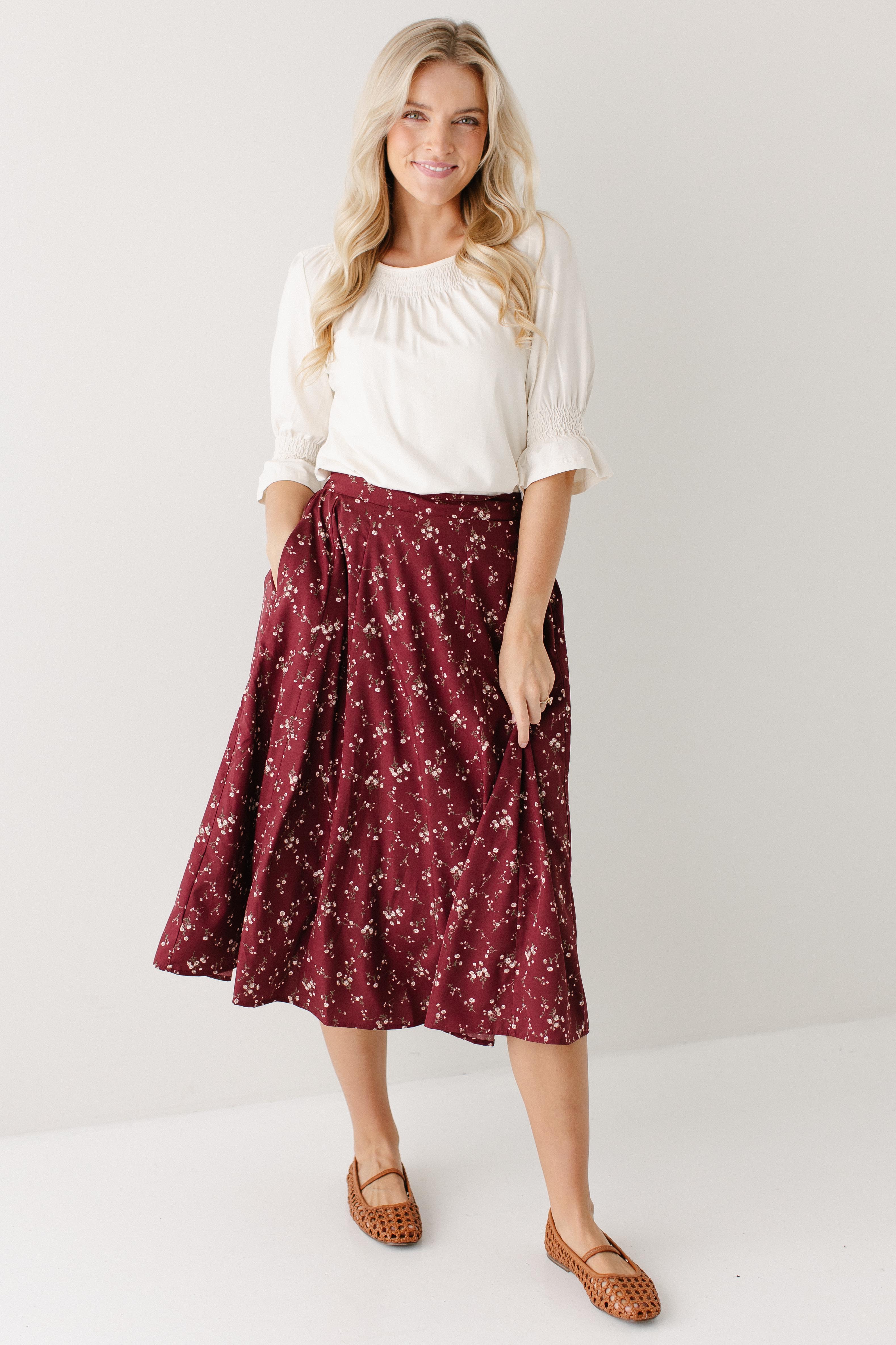 Model wearing the 'Bethany' Luxe Cotton Blend Smocked Detail Top in Cream with the 'Edith' Ditsy Floral A-Line Midi Skirt in Burgundy