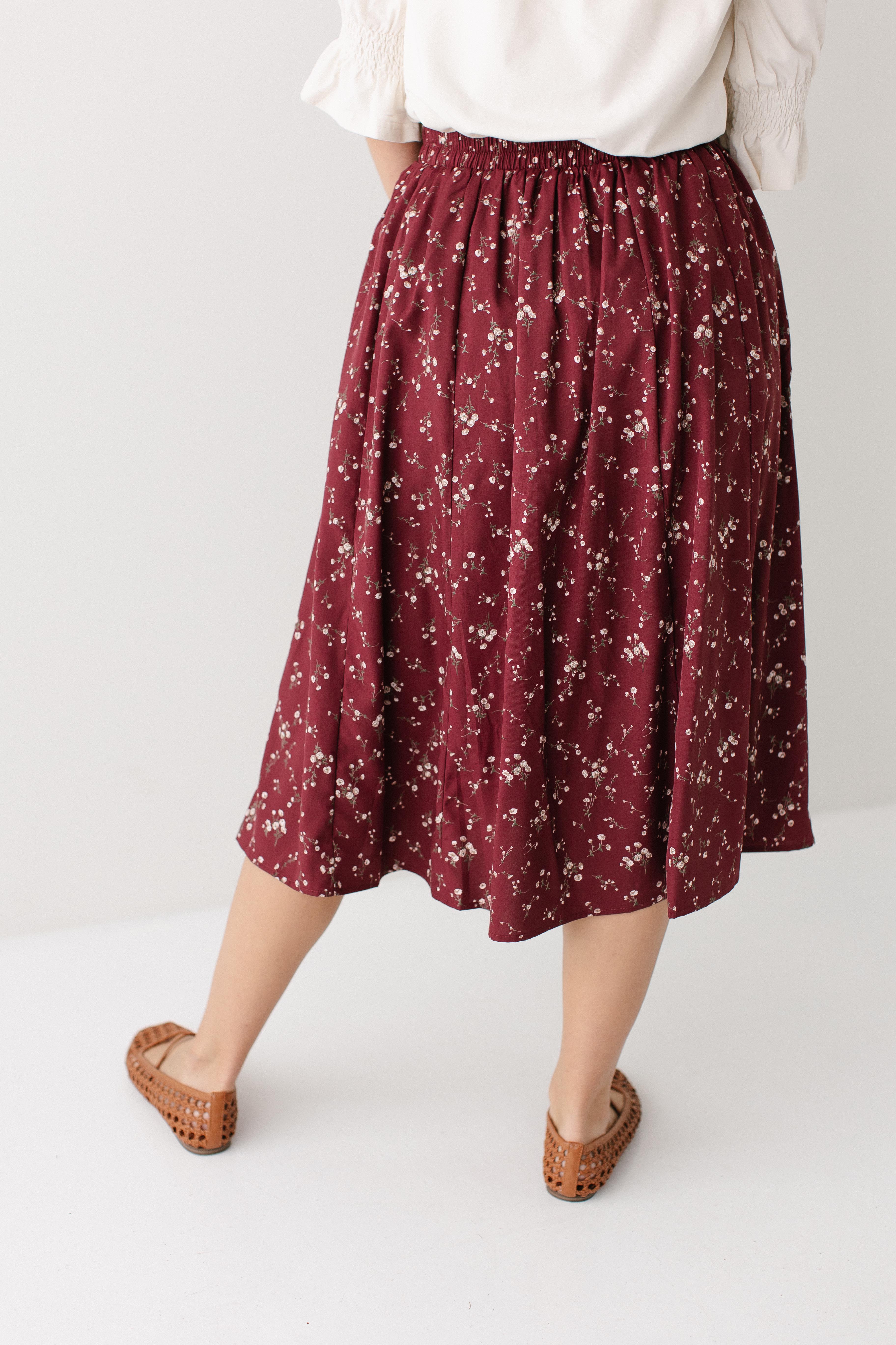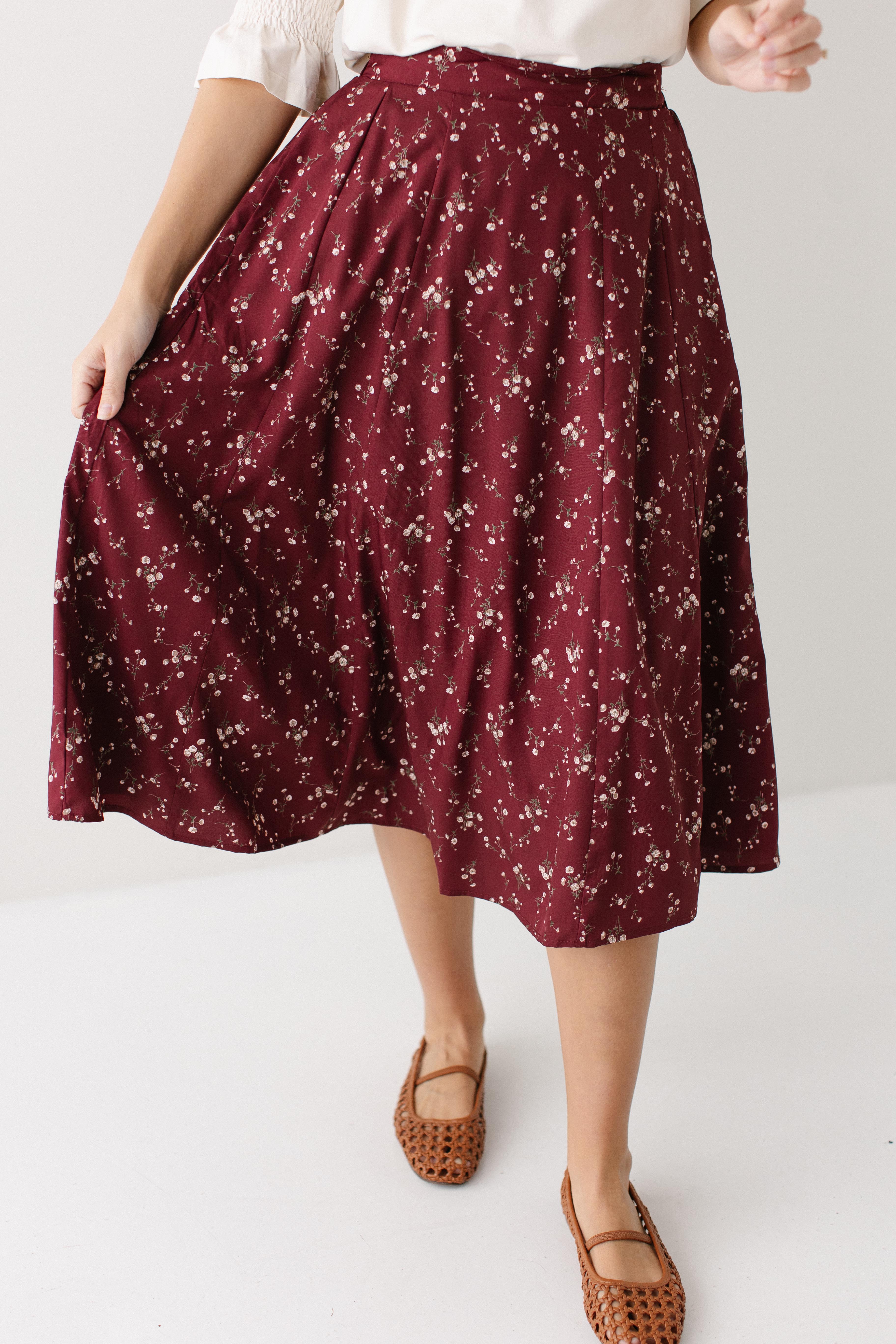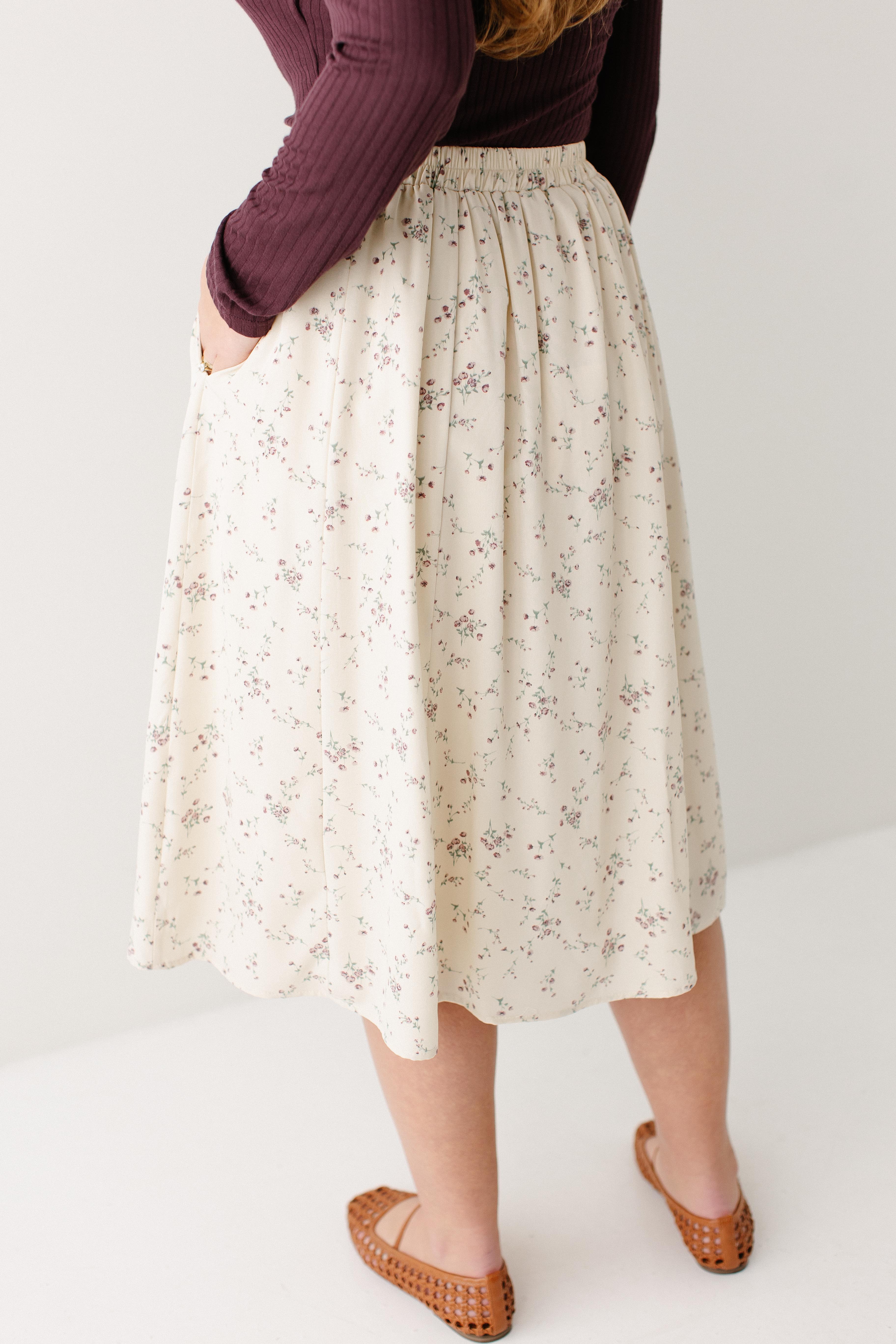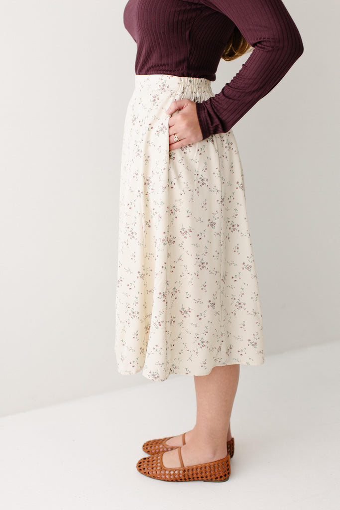 Every woman needs the perfect floral skirt in their wardrobe! The 'Edith' Ditsy Floral A-Line Midi Skirt is the perfect feminine skirt with a delicate floral print, delicate pleating at the waist, ditsy floral print, and flattering A-line silhouette that drapes beautifully. Pair the ‘Edith’ with your favorite neutral top for the perfect Sunday morning church outfit.