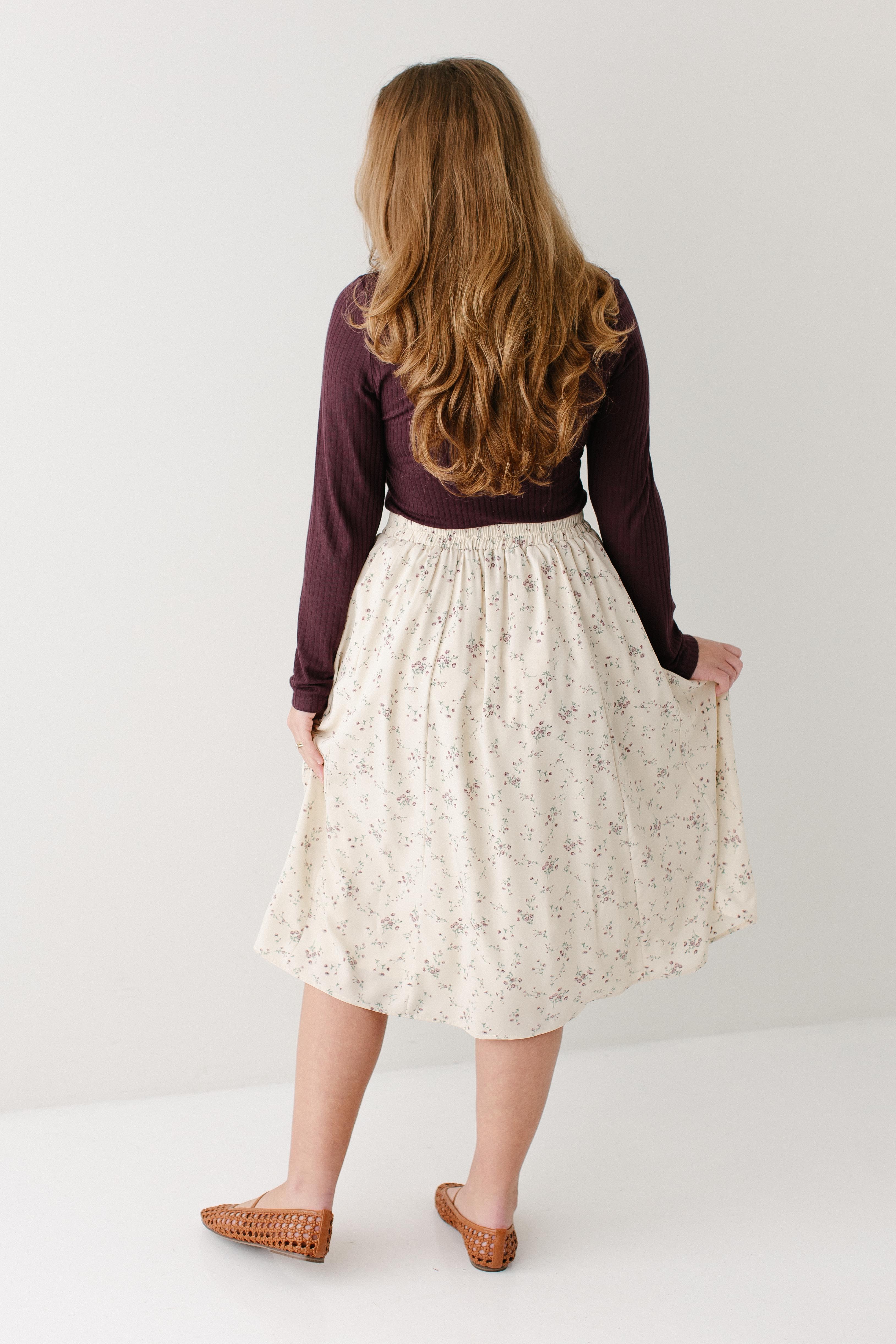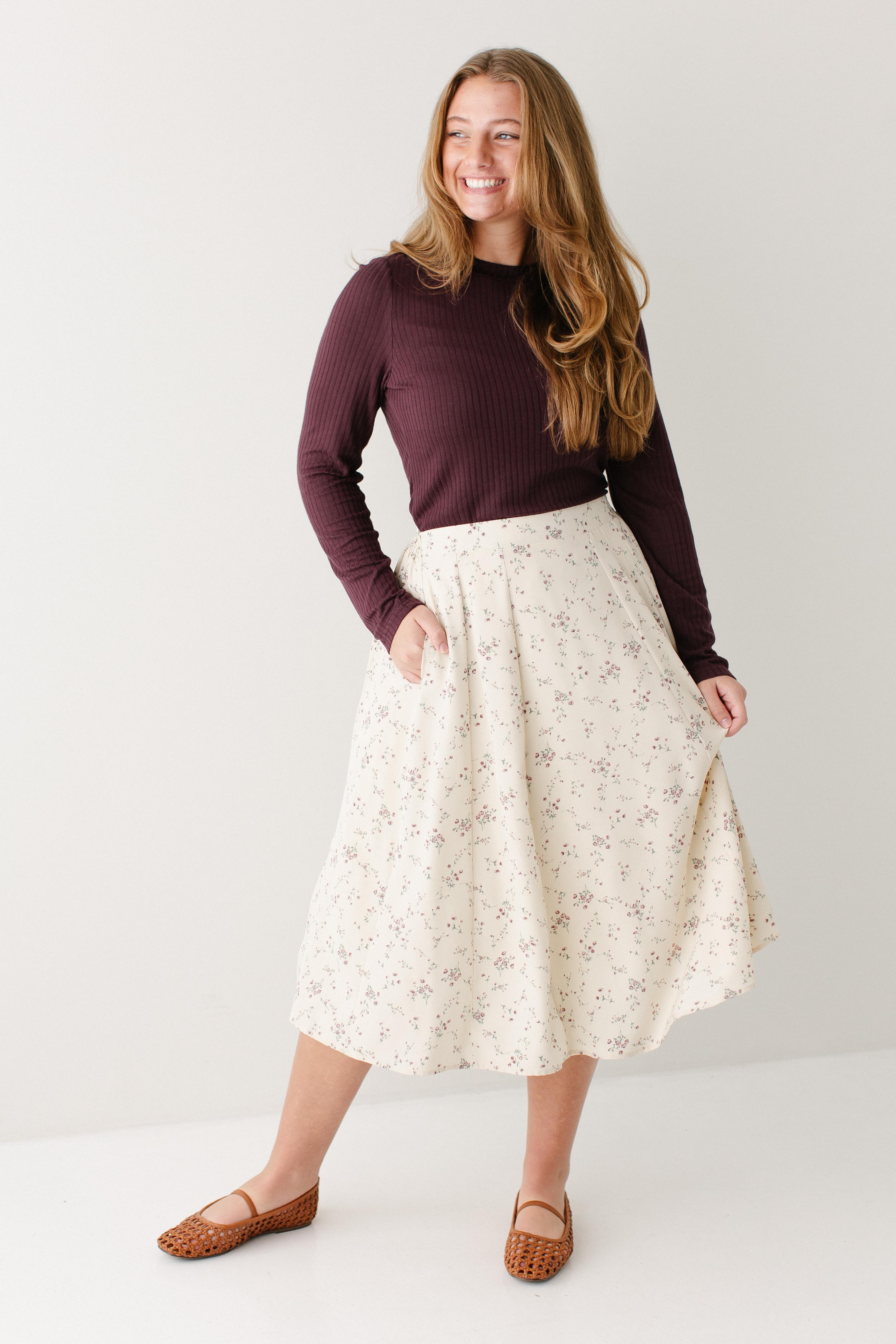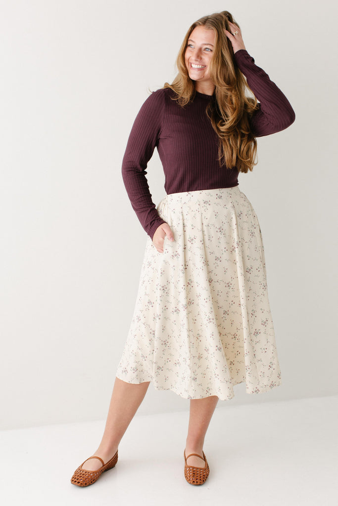 Model wearing the 'Marilyn' Ribbed Knit Long Sleeve Top with the 'Edith' Ditsy Floral A-Line Midi Skirt in Cream