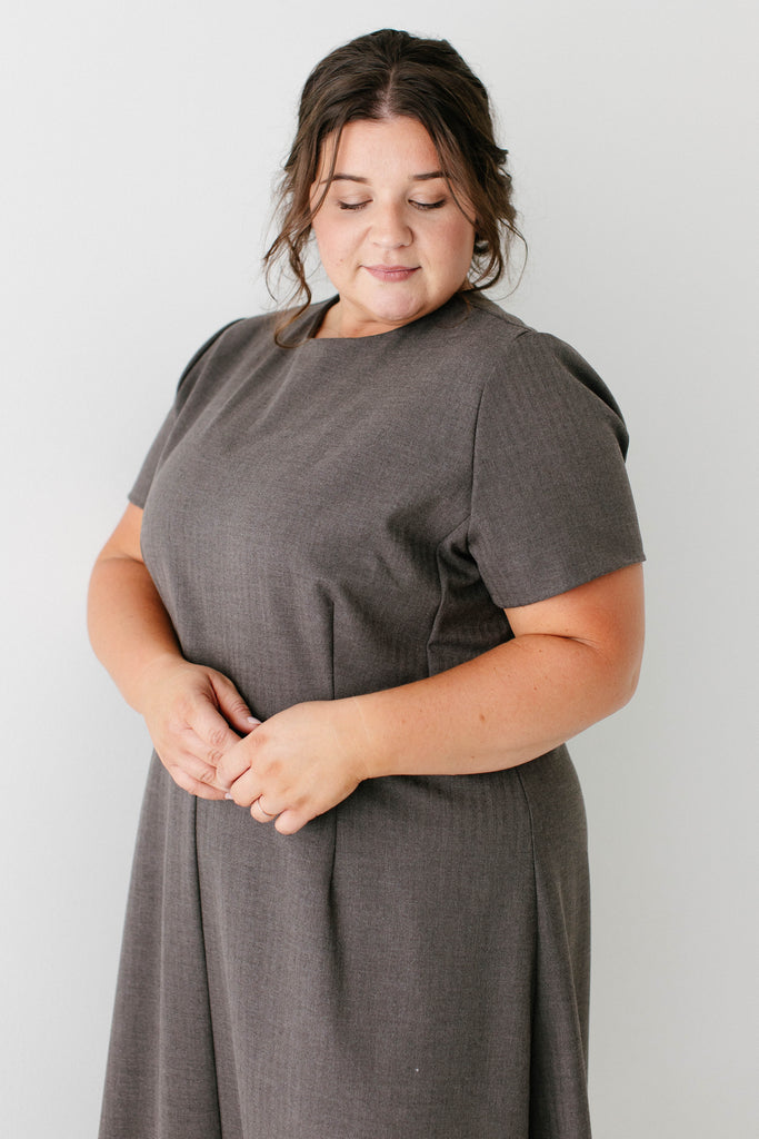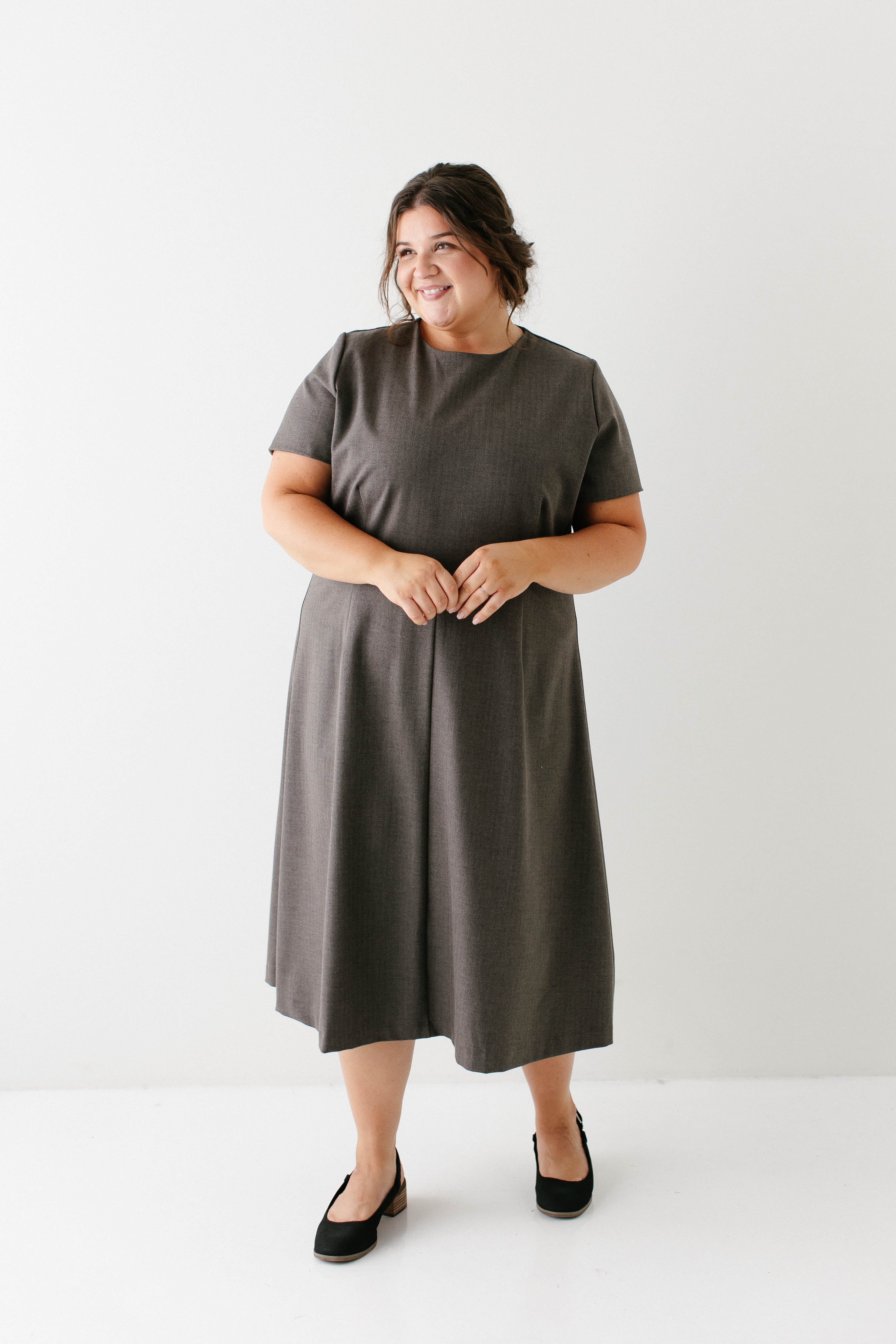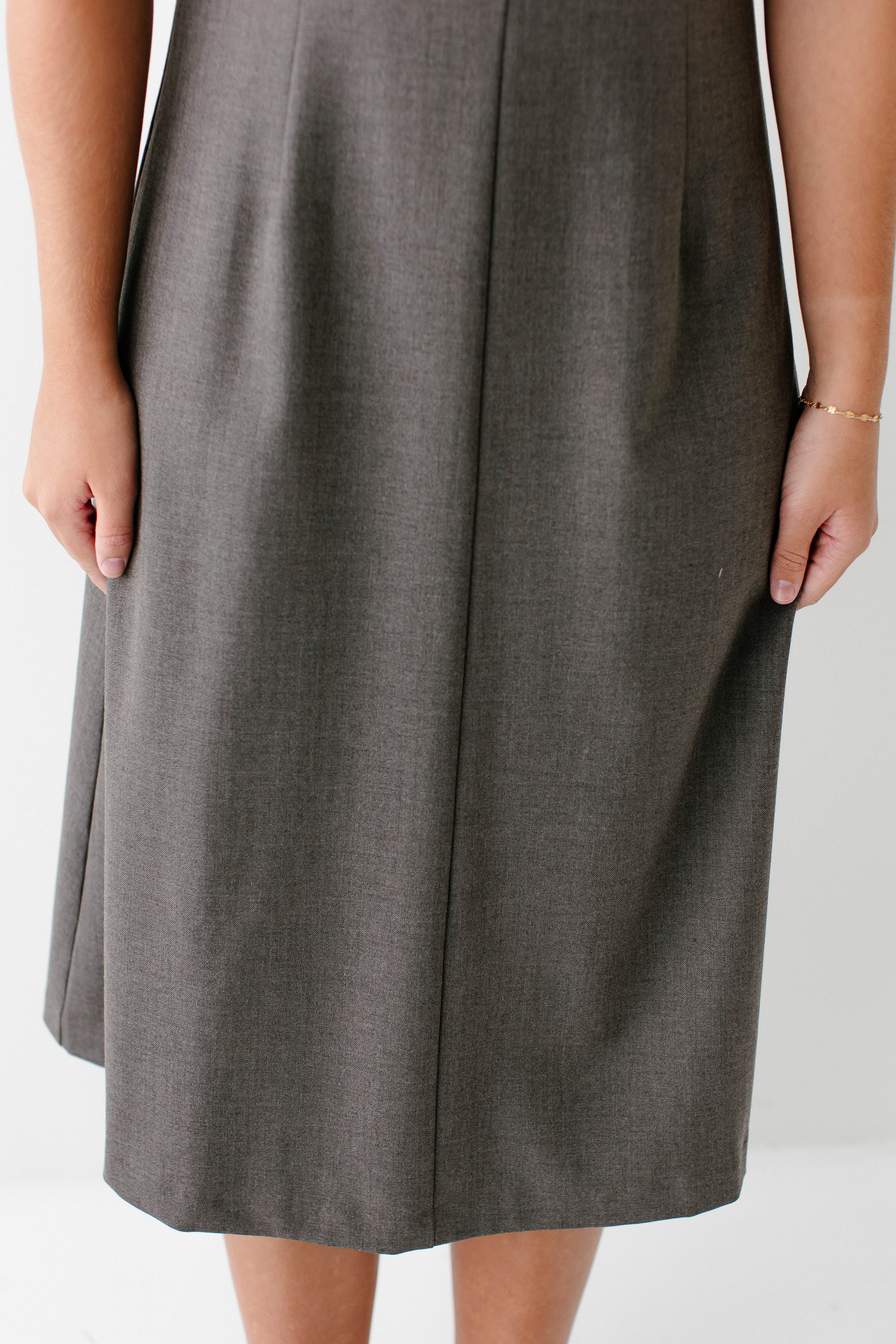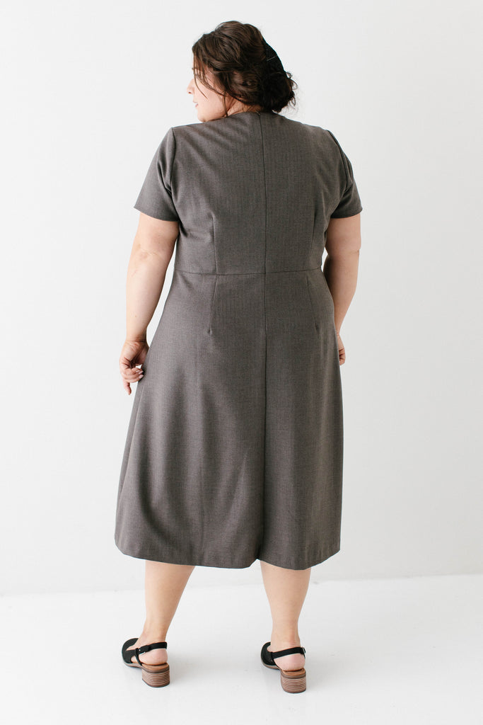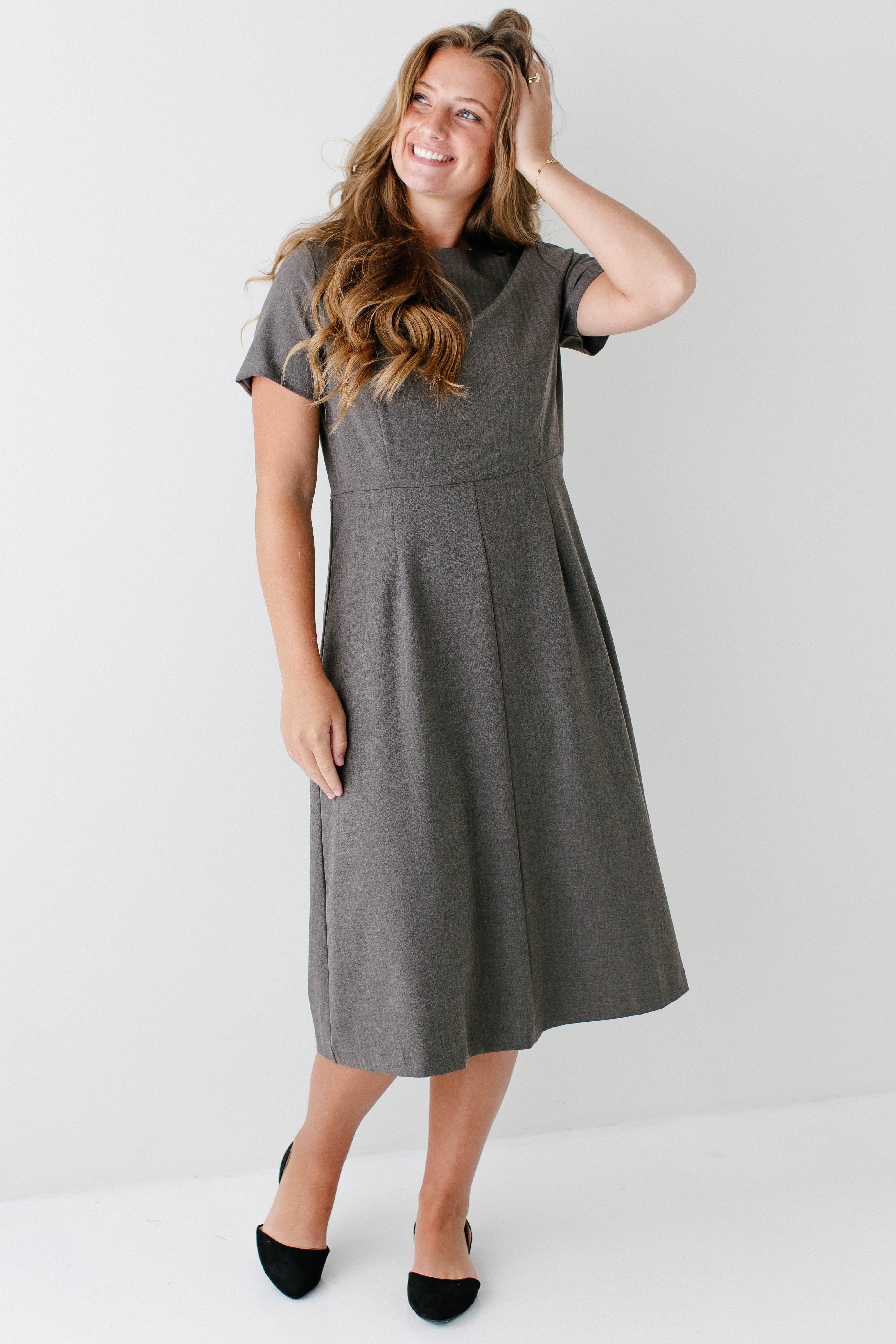 Sweet details and a classic silhouette meet in the 'Eleanor' Classic Herringbone Midi Dress! This piece has a tailored cut, simple sleeves, a modest A-line skirt, and feminine lines. The 'Eleanor' comes in a dark taupe herringbone fabric and is fully lined! This is a staple piece that can be worn anytime of the year and can be styled in endless ways. Wear it with boots and a blazer for the office, all on its own with loafers for church, or with heels for a wedding or party! Exclusively designed by us with you in mind.