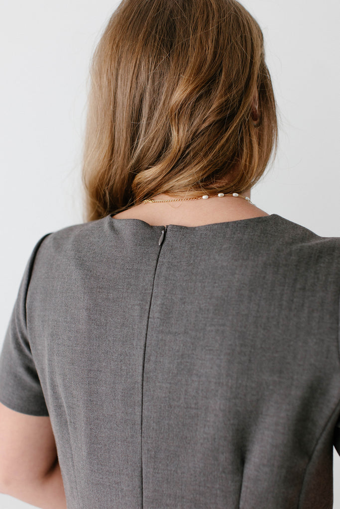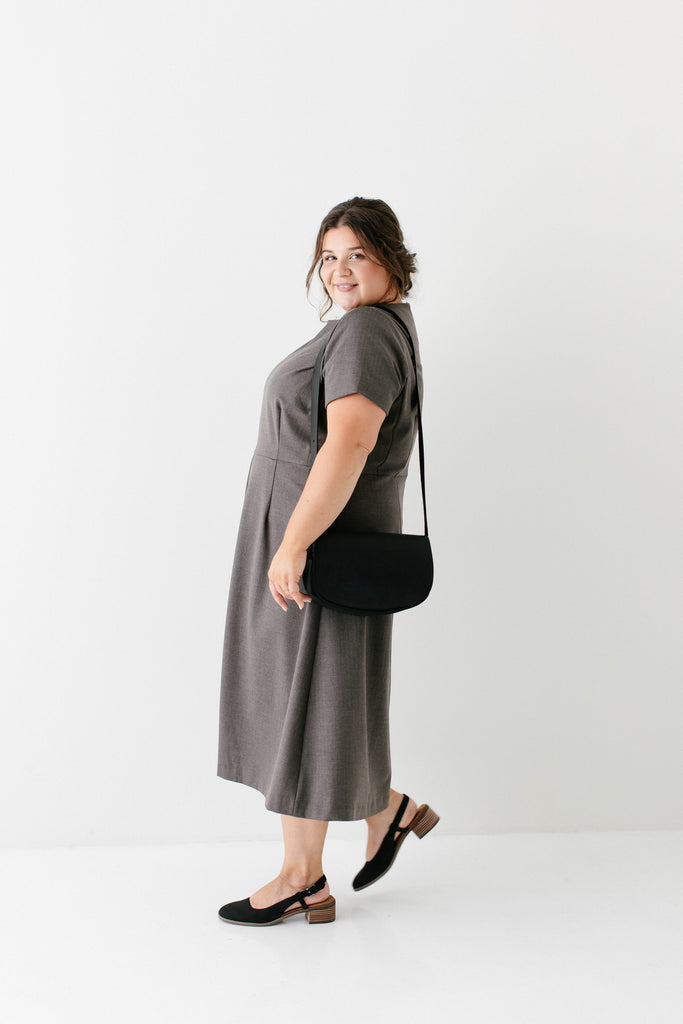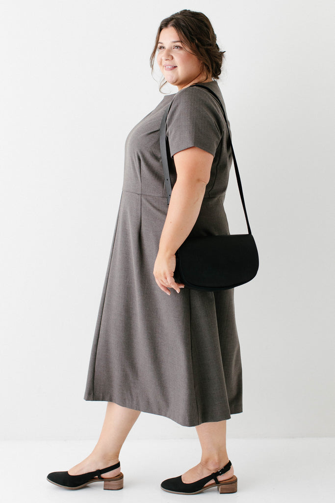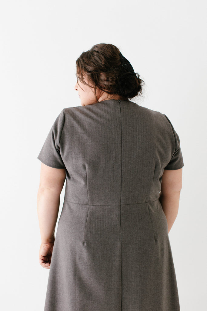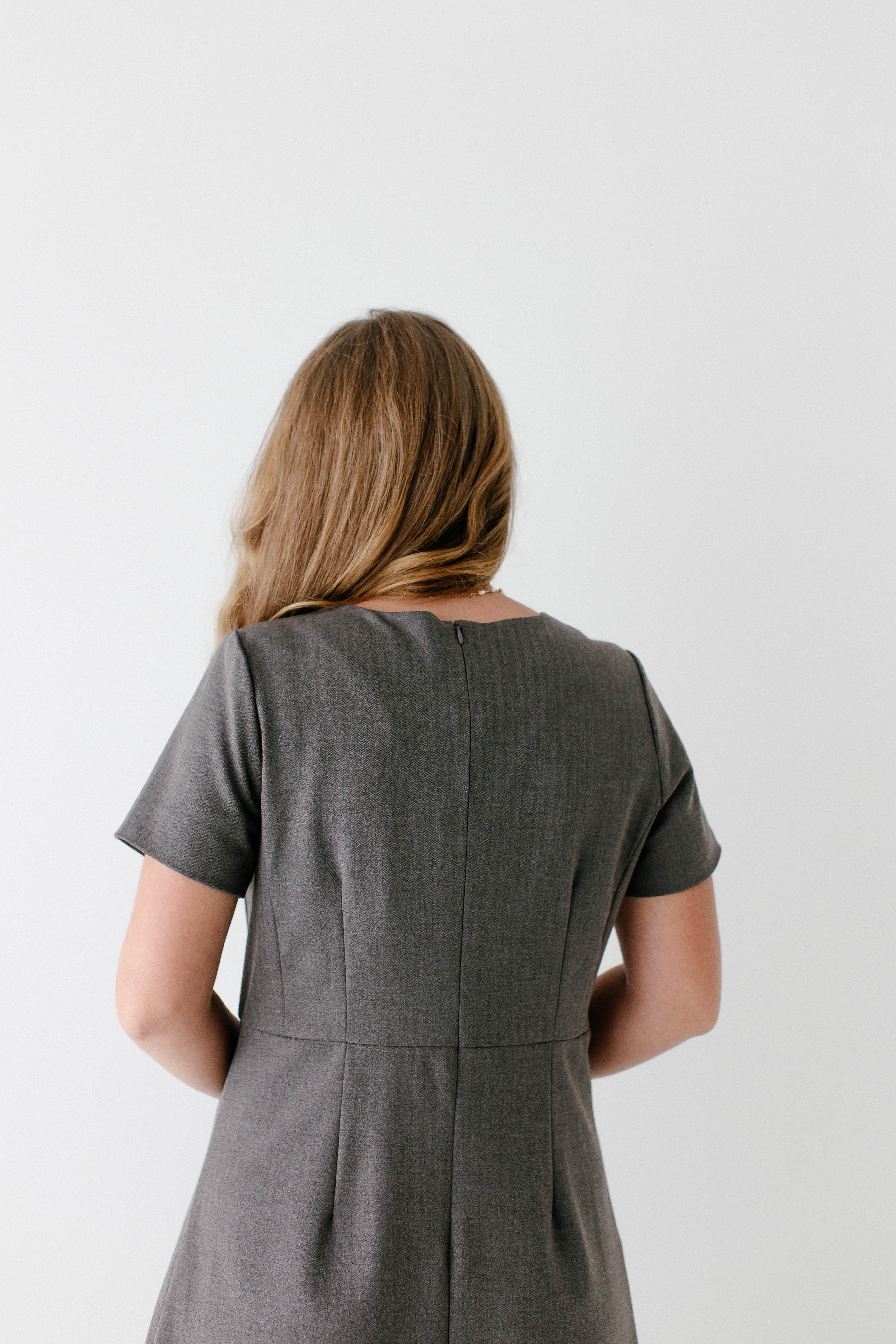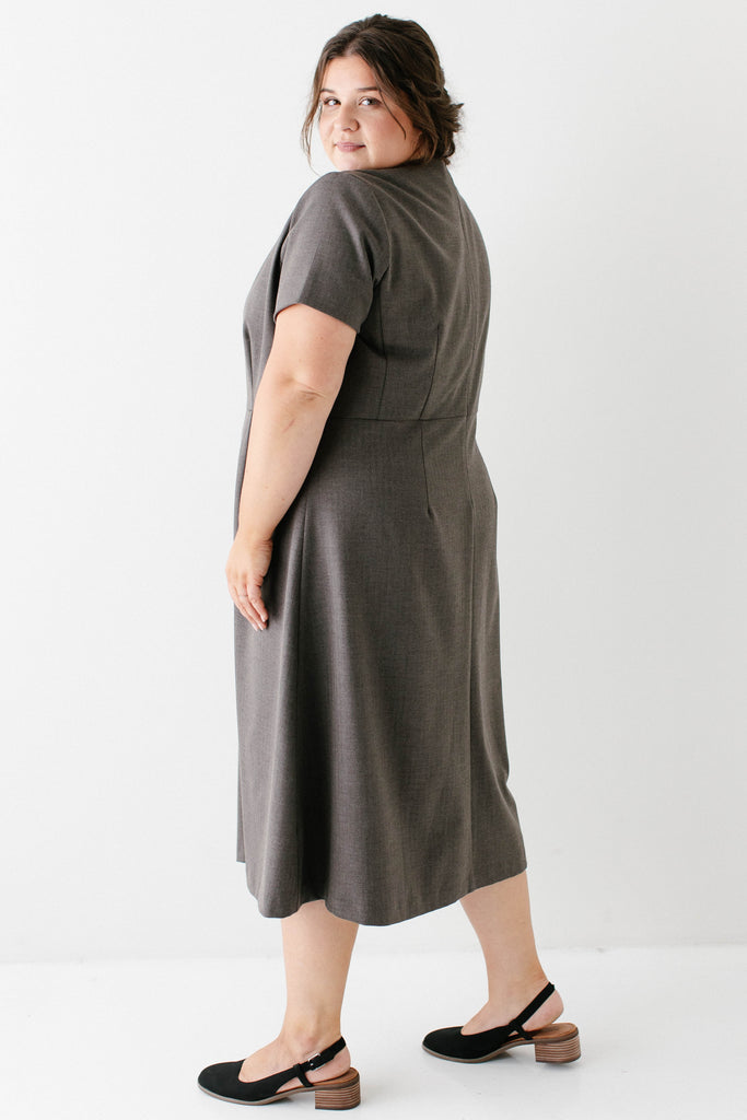 Sweet details and a classic silhouette meet in the 'Eleanor' Classic Herringbone Midi Dress! This piece has a tailored cut, simple sleeves, a modest A-line skirt, and feminine lines. The 'Eleanor' comes in a dark taupe herringbone fabric and is fully lined! This is a staple piece that can be worn anytime of the year and can be styled in endless ways. Wear it with boots and a blazer for the office, all on its own with loafers for church, or with heels for a wedding or party! Exclusively designed by us with you in mind.