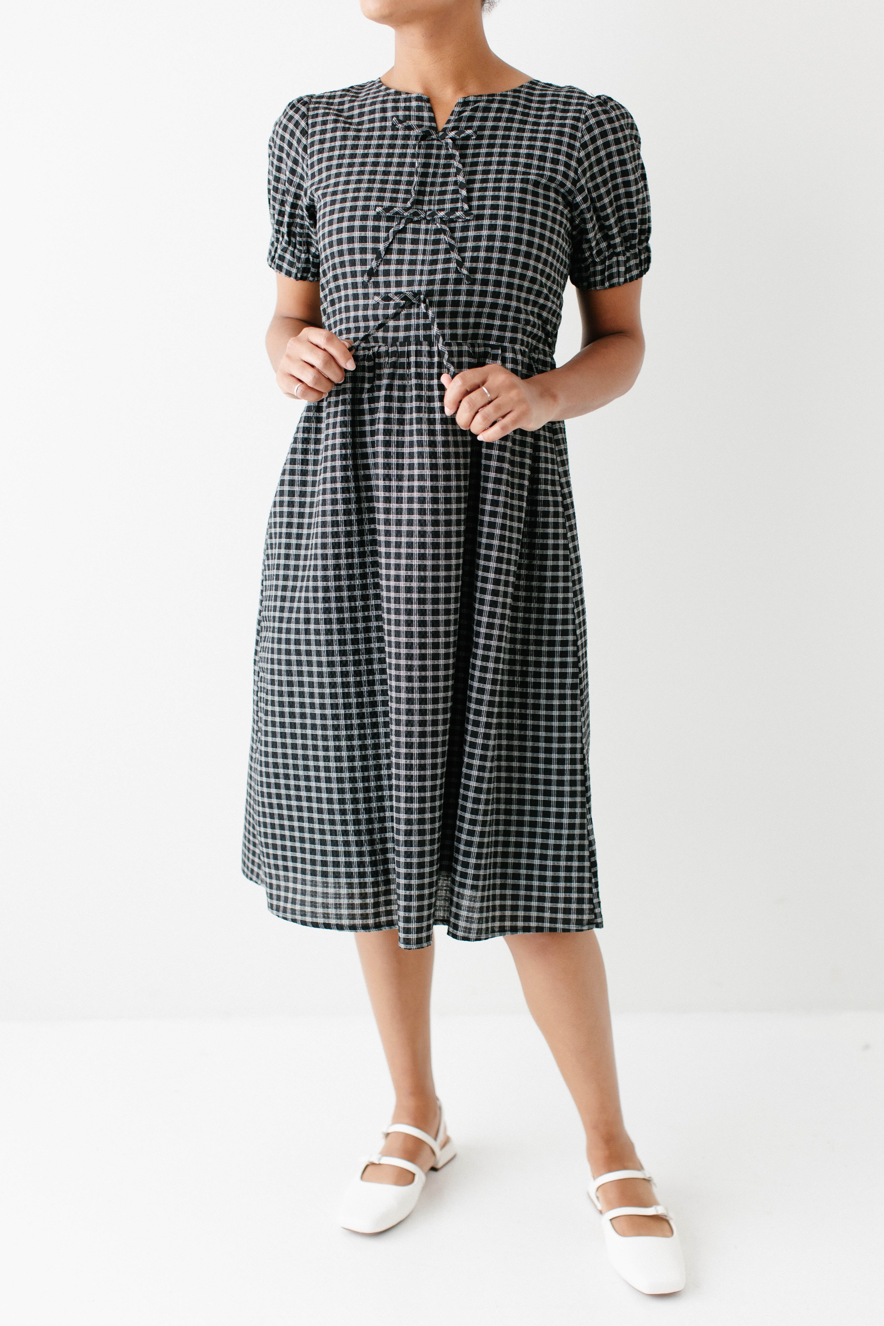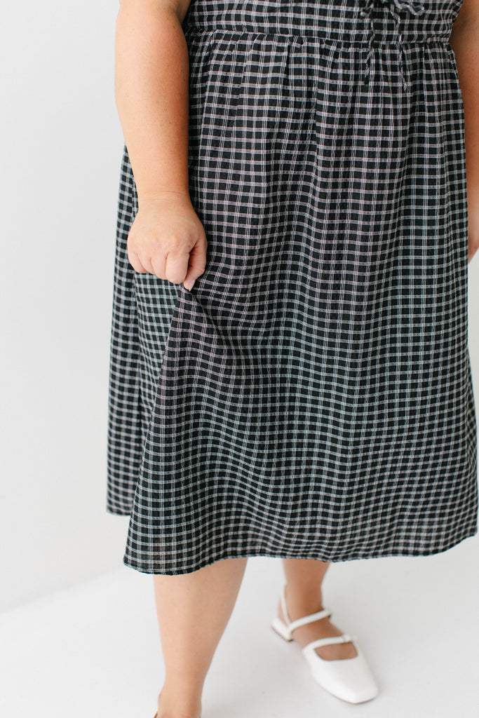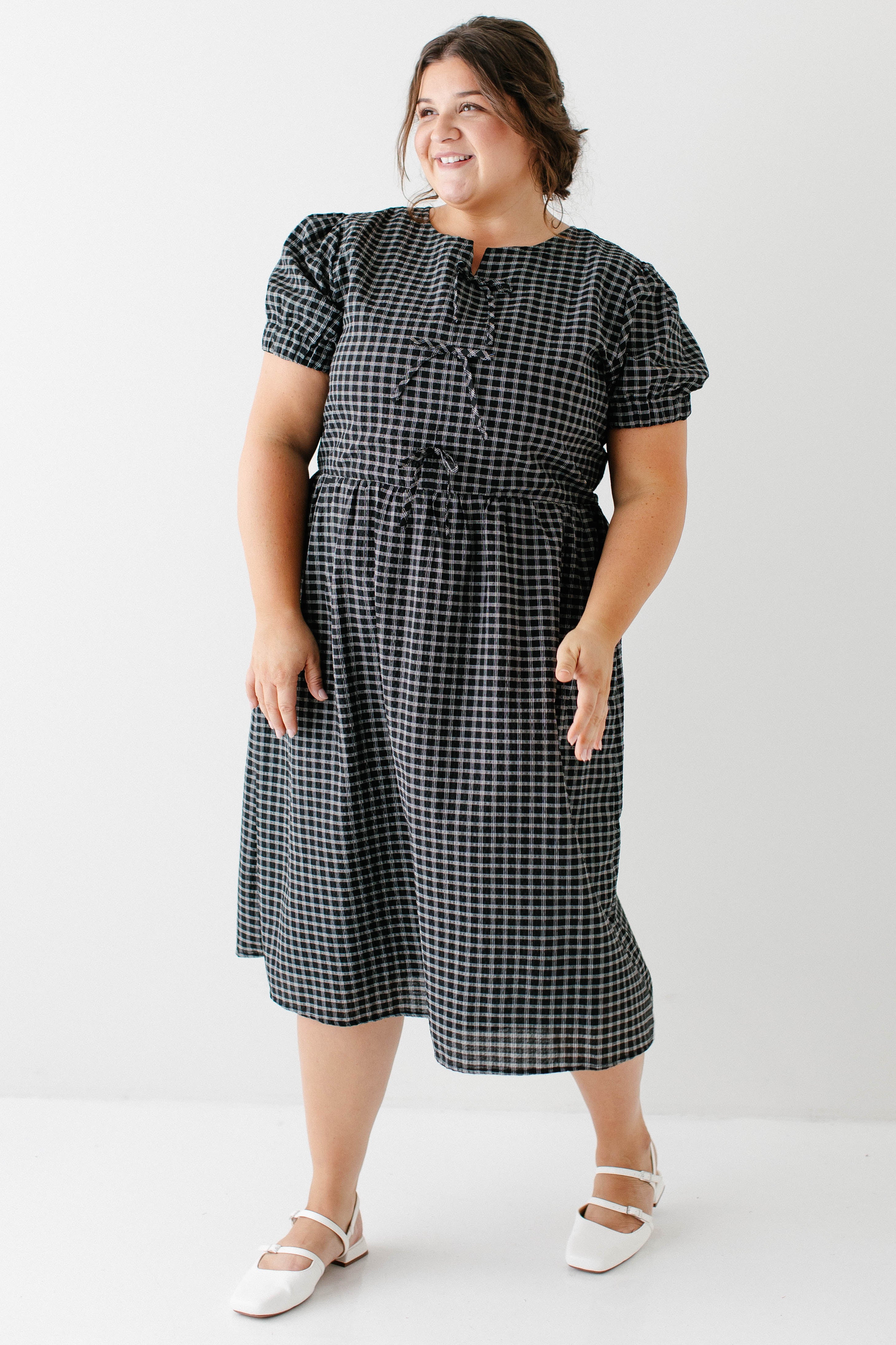 The sweetest dress, the 'Ellie' Bow Front Plaid Midi Dress will become your new favorite piece that effortlessly combines comfort and style. This dress is designed to keep you comfortable and chic all day long. The white plaid pattern on a black background and bow details add a playful touch. Pair with boots for a simple and modest daytime look, and we designed this dress in girls' sizes so you can match with your little girl! Exclusively designed by us with you in mind.