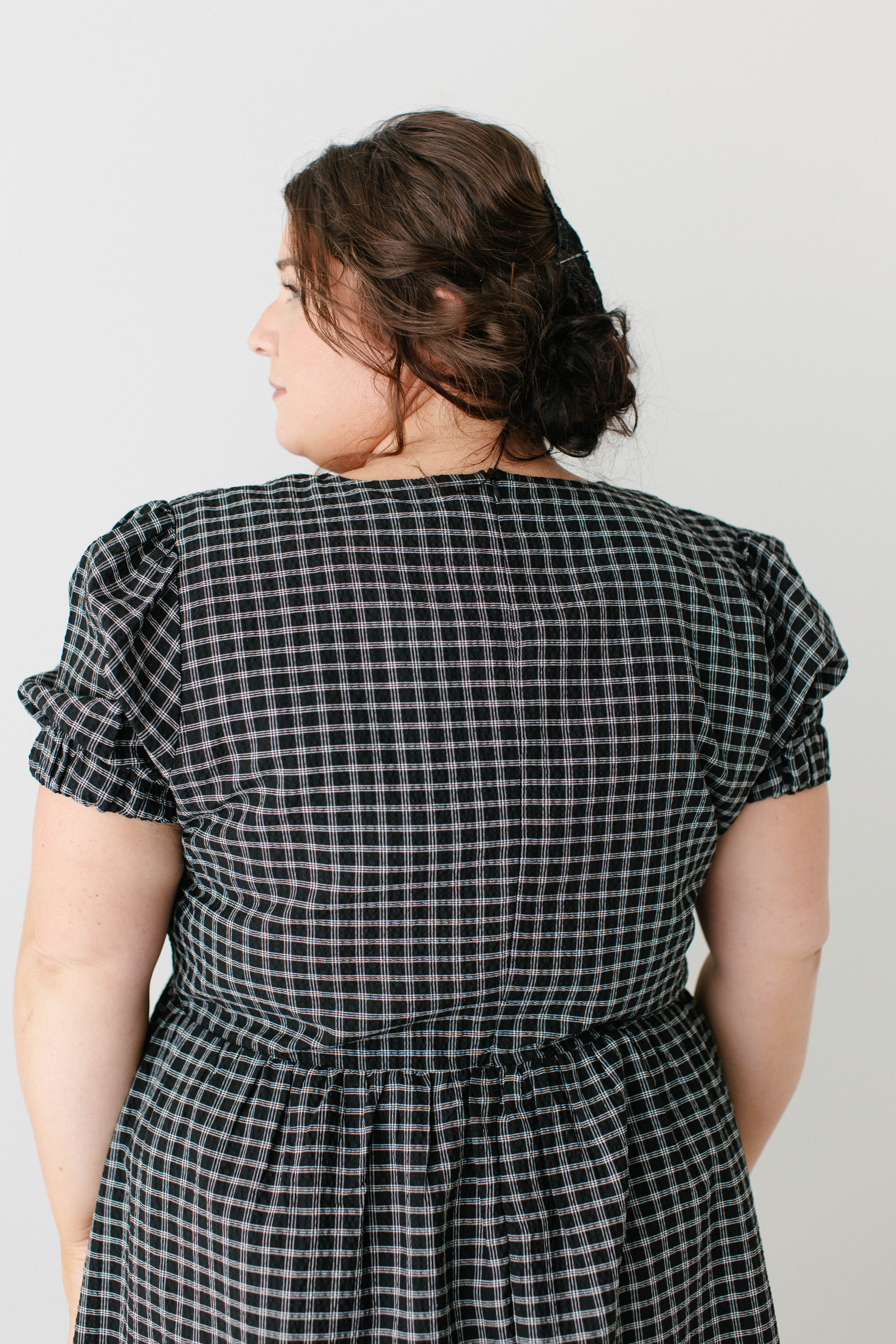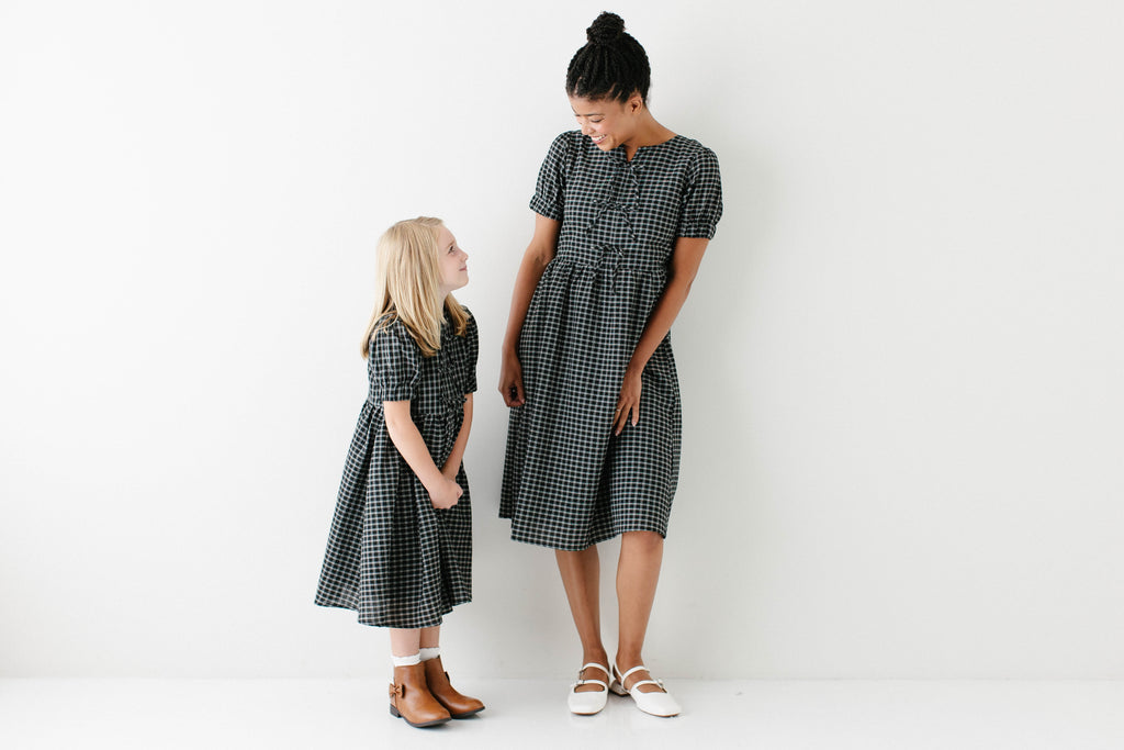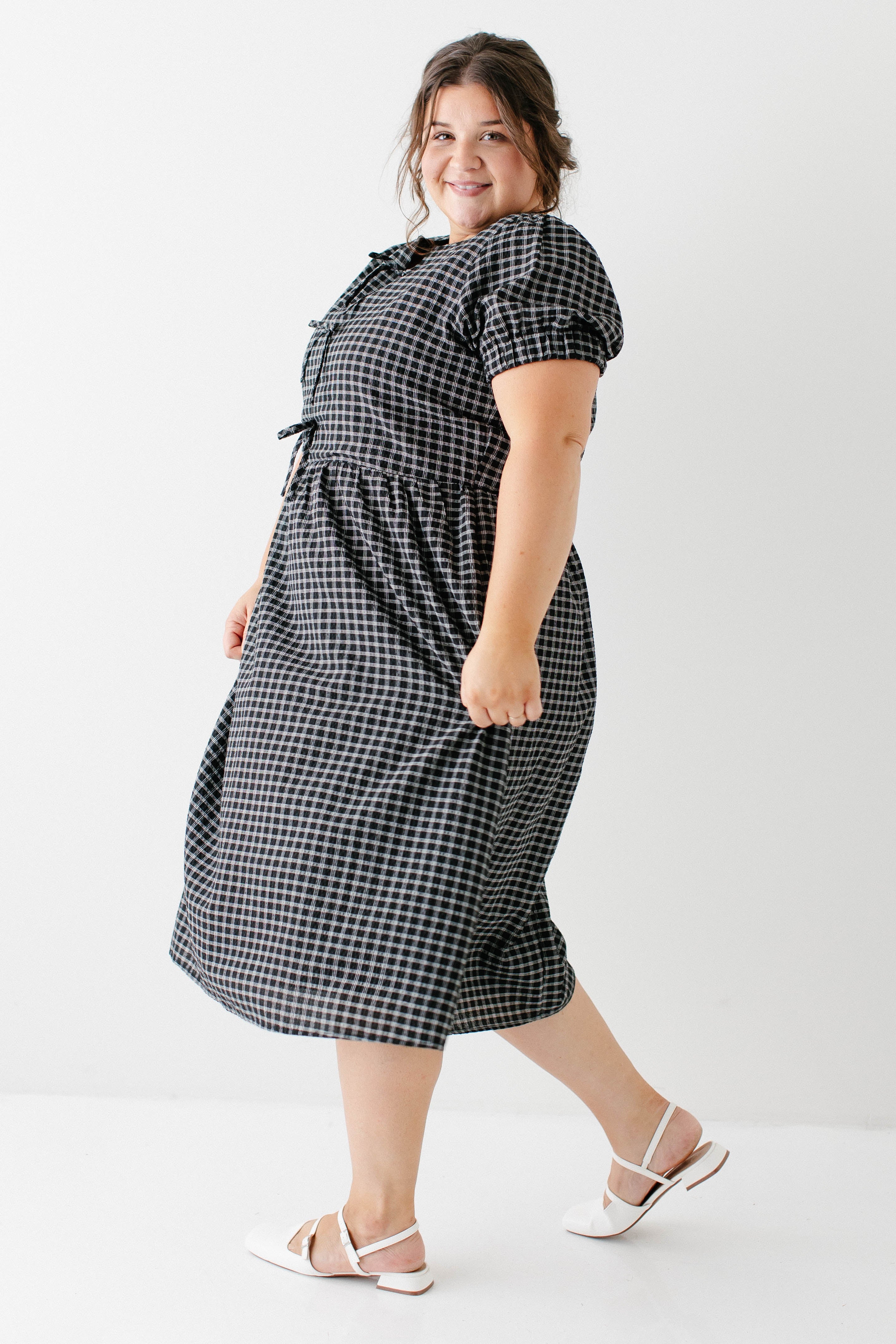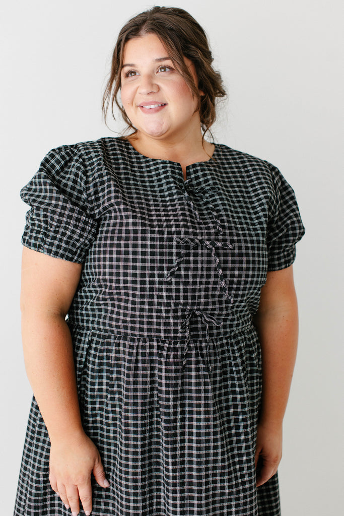 The sweetest dress, the 'Ellie' Bow Front Plaid Midi Dress will become your new favorite piece that effortlessly combines comfort and style. This dress is designed to keep you comfortable and chic all day long. The white plaid pattern on a black background and bow details add a playful touch. Pair with boots for a simple and modest daytime look, and we designed this dress in girls' sizes so you can match with your little girl! Exclusively designed by us with you in mind.
