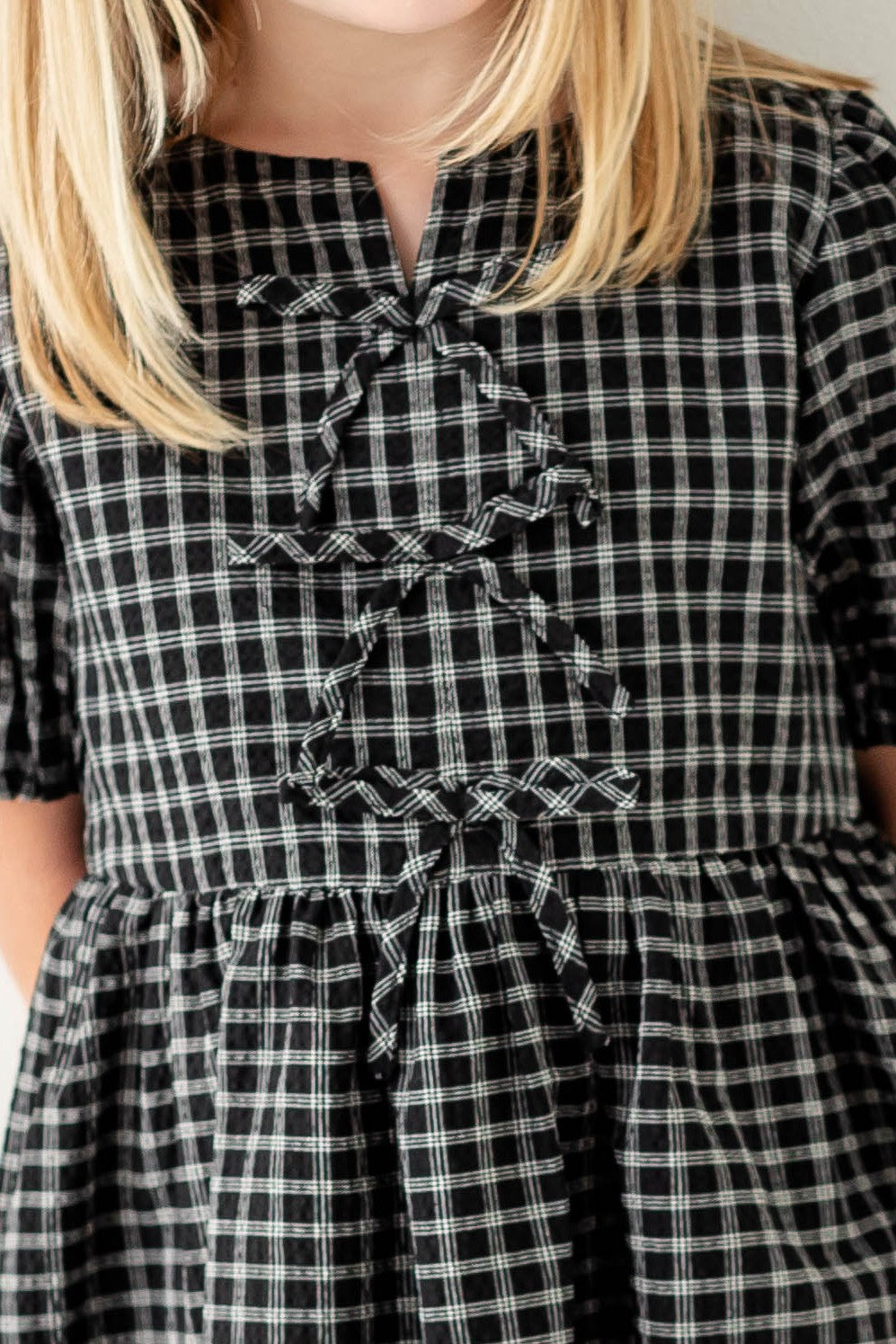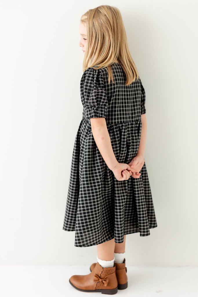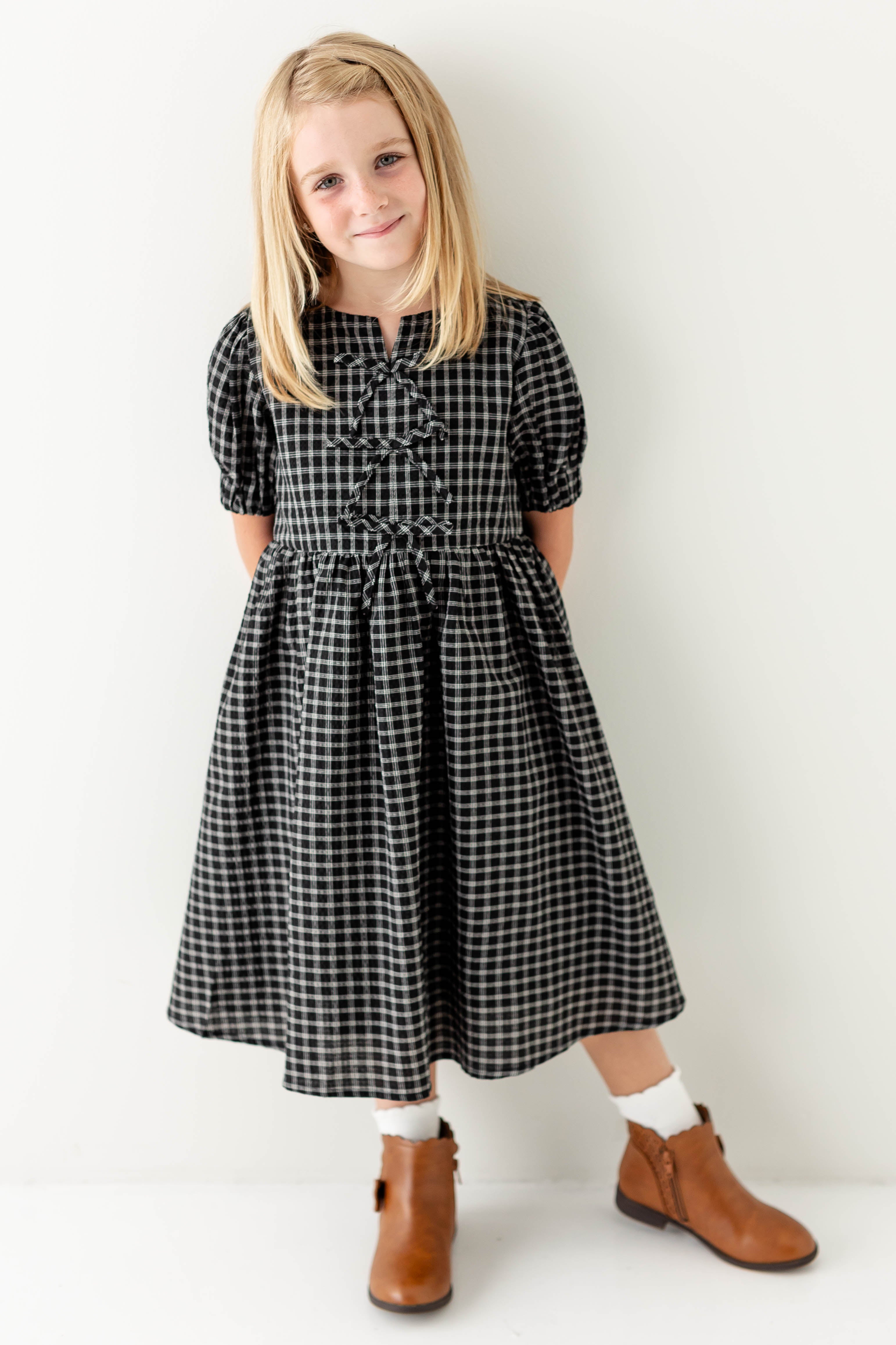 The sweetest dress, the 'Ellie' Girl Bow Front Plaid Midi Dress will become your little girl's new favorite piece that effortlessly combines comfort and style. This dress is designed to keep her cozy and chic all day long, and the modest midi length brings peace of mind. The white plaid pattern on a black background and bow details add a playful touch. Pair with boots for a simple and modest daytime look! Exclusively designed by us with you in mind.