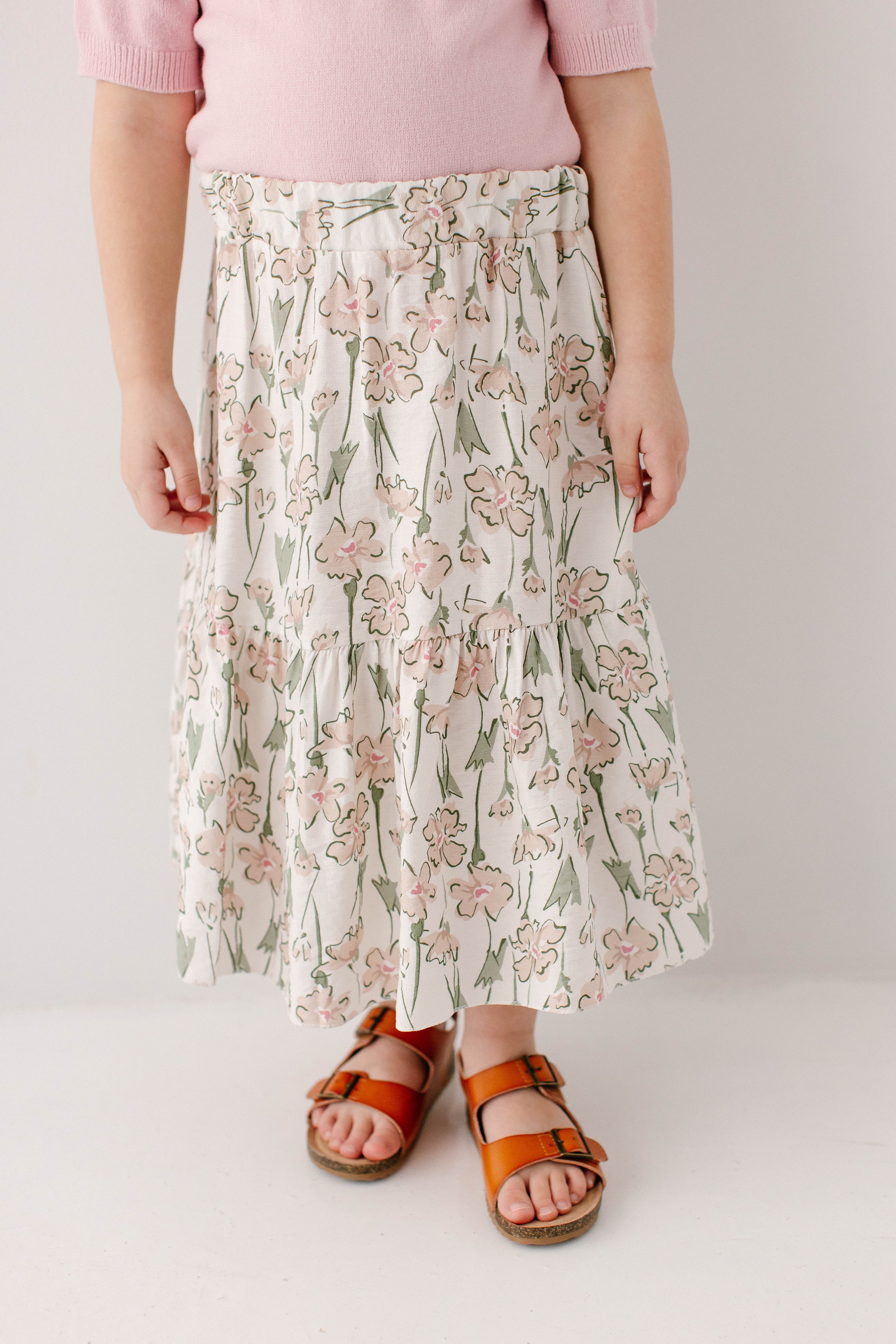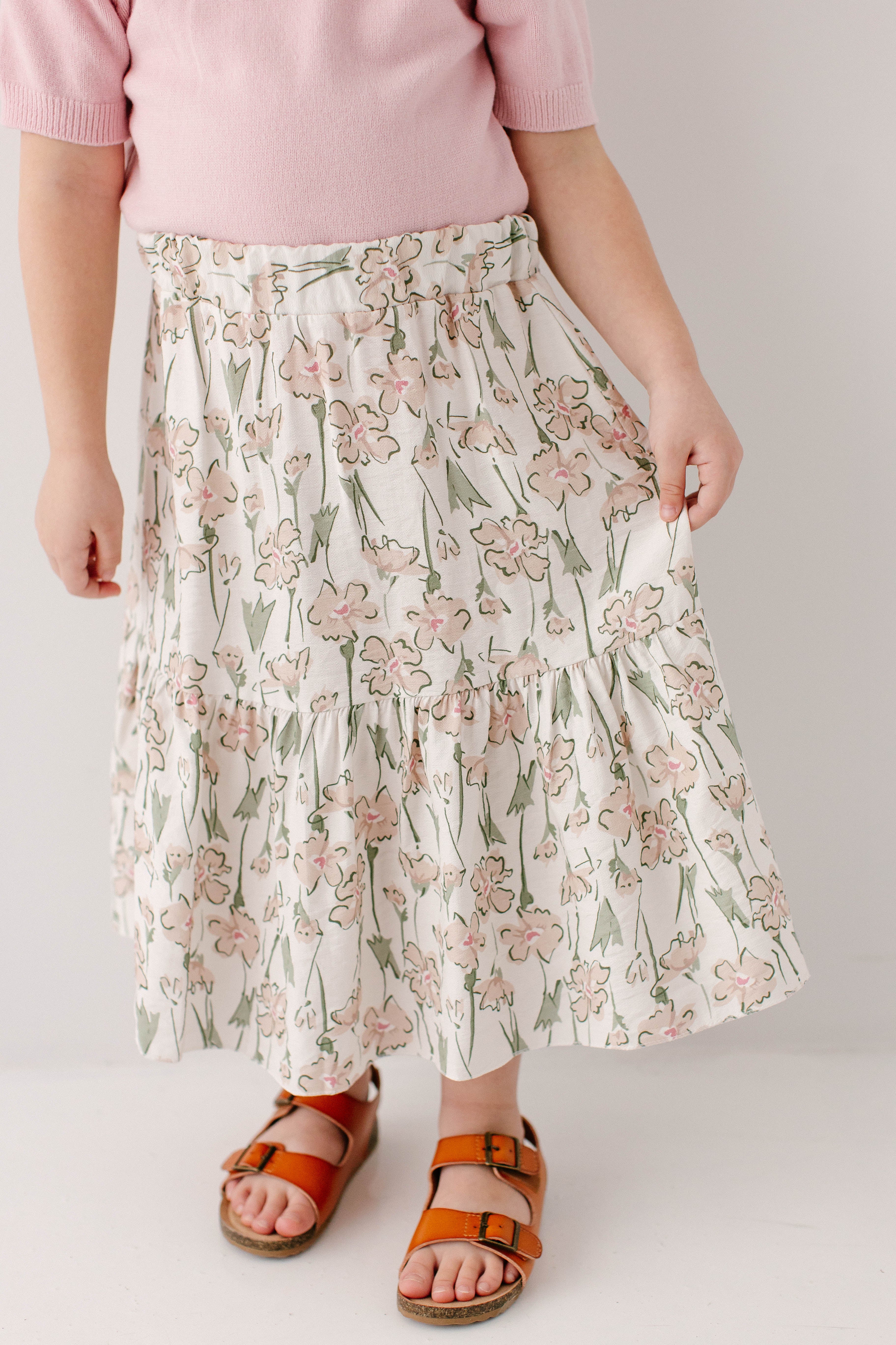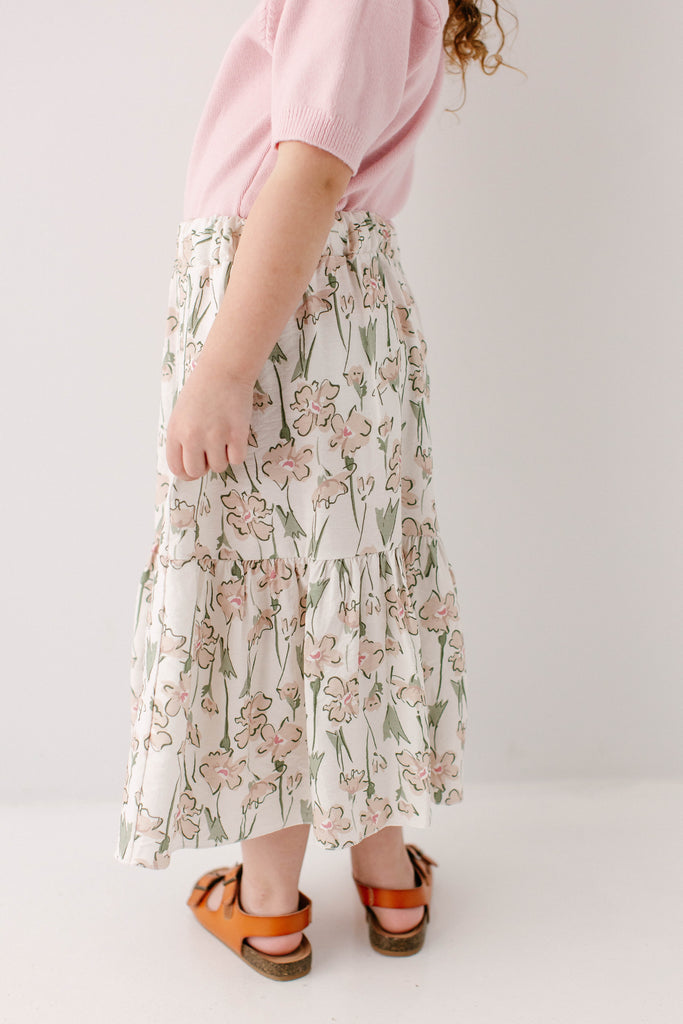 A skirt that your girl loves will always have the sweetest details! The 'Eloise' Girl Floral Print Midi Skirt features an abstract beige, pink, and green floral print, elastic waistband, and twirl-worthy tiered style. Pair with her favorite lightweight sweater for the cutest Sunday morning outfit.