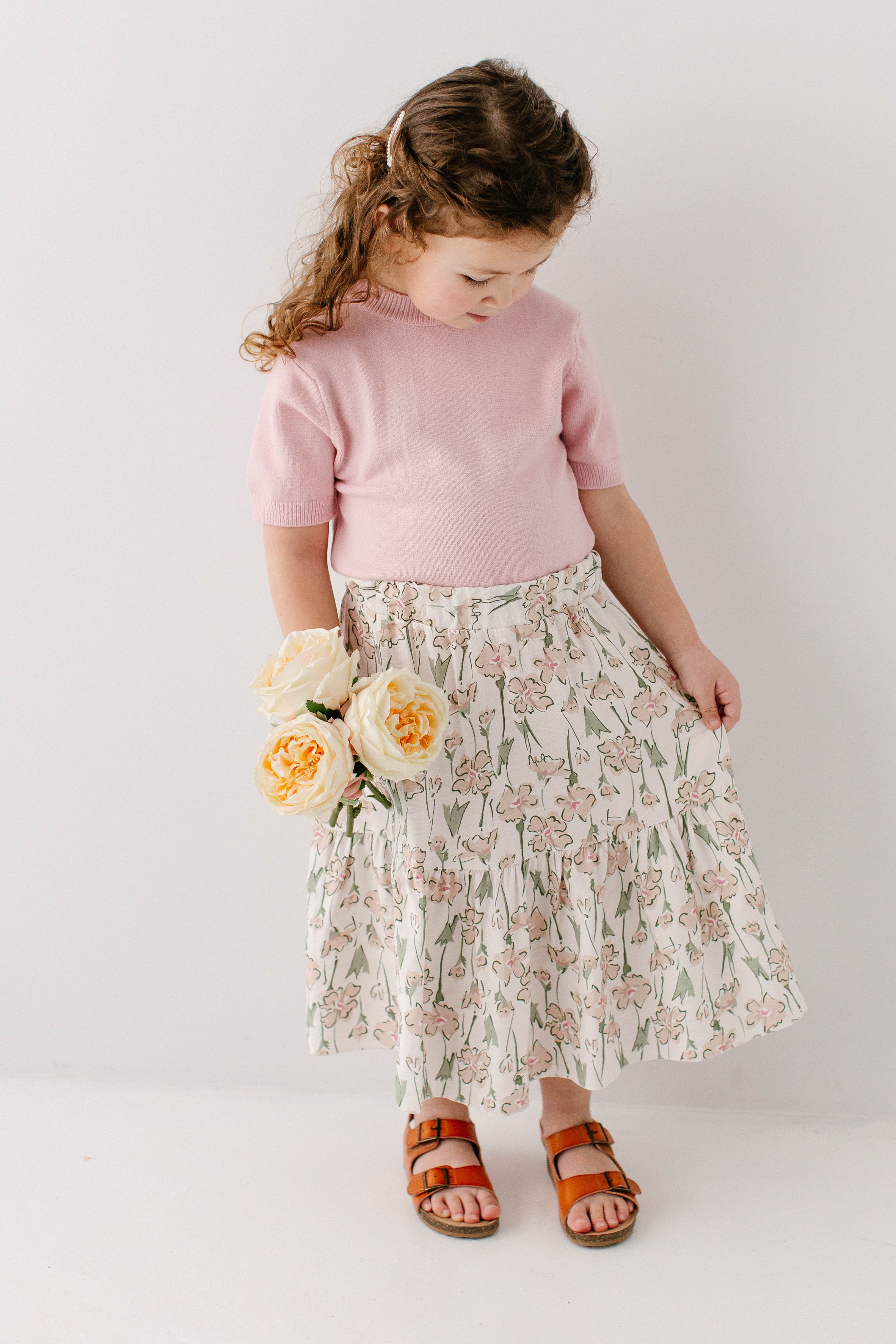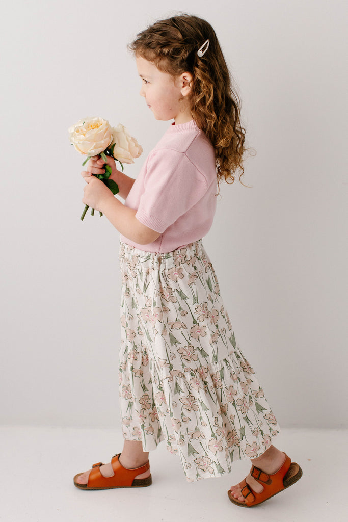 Model wearing the 'Adore' Girl Short Sleeve Sweater Top with the 'Eloise' Girl Floral Print Midi Skirt