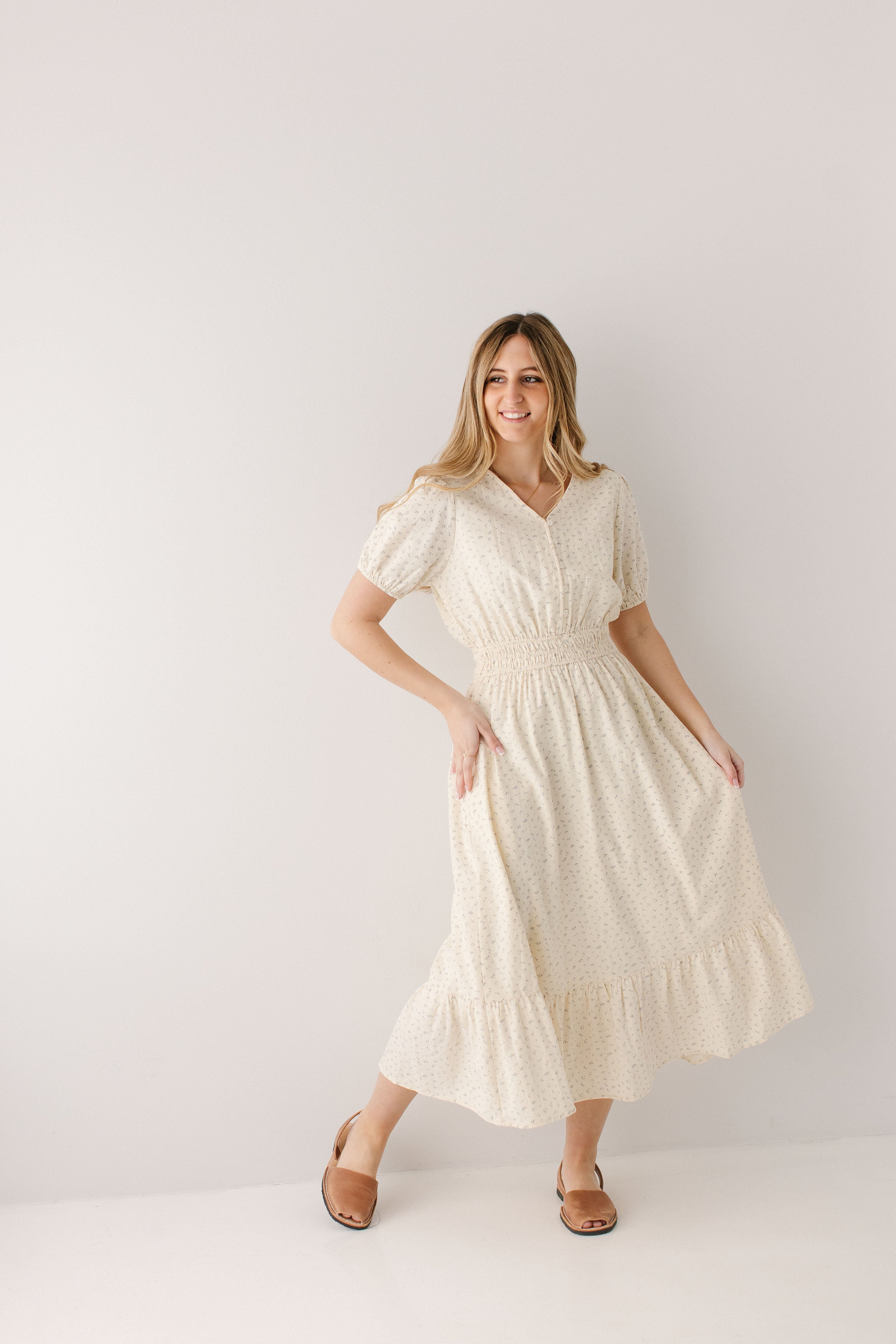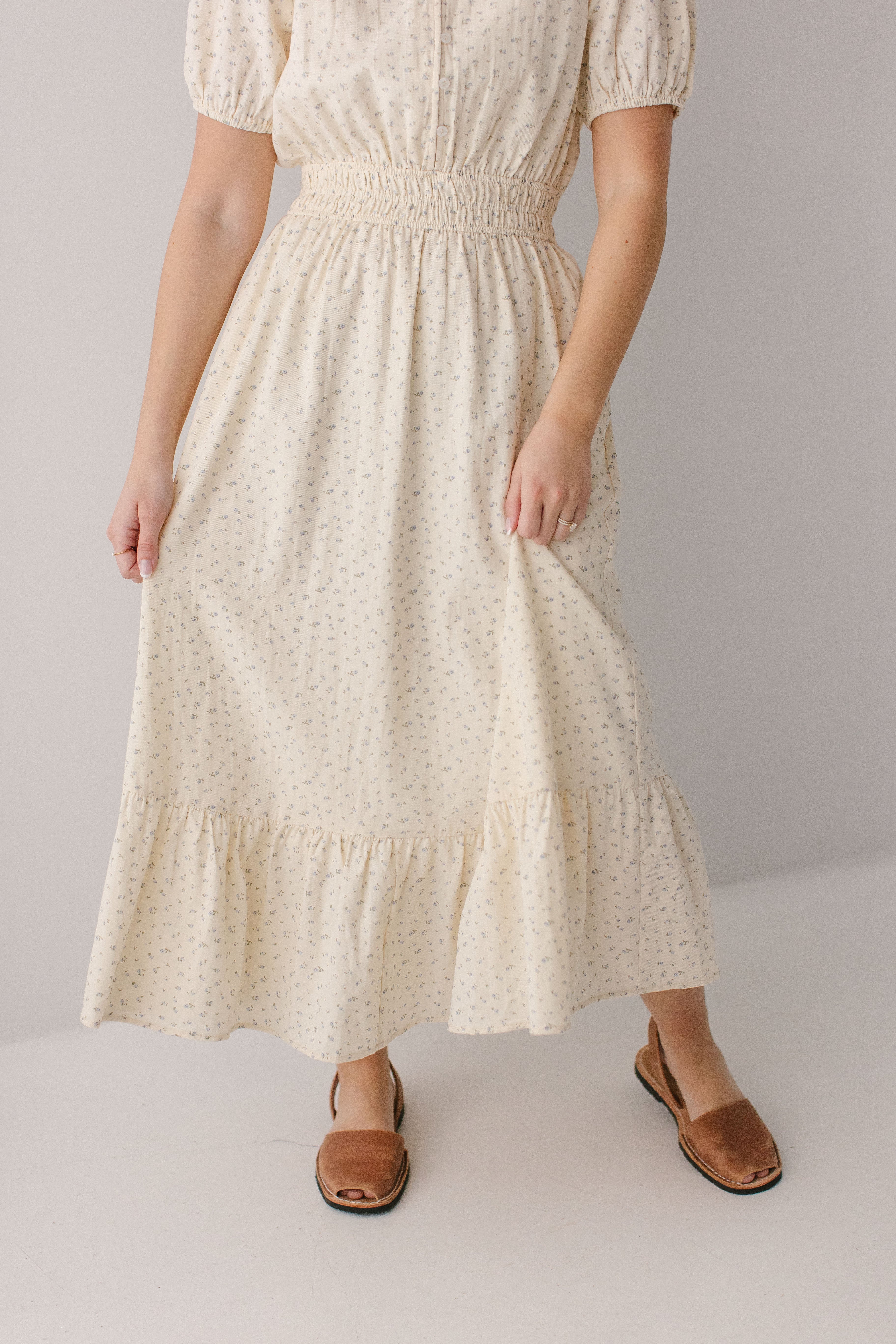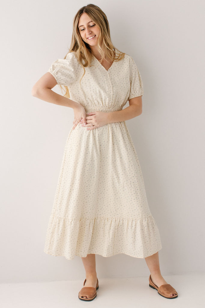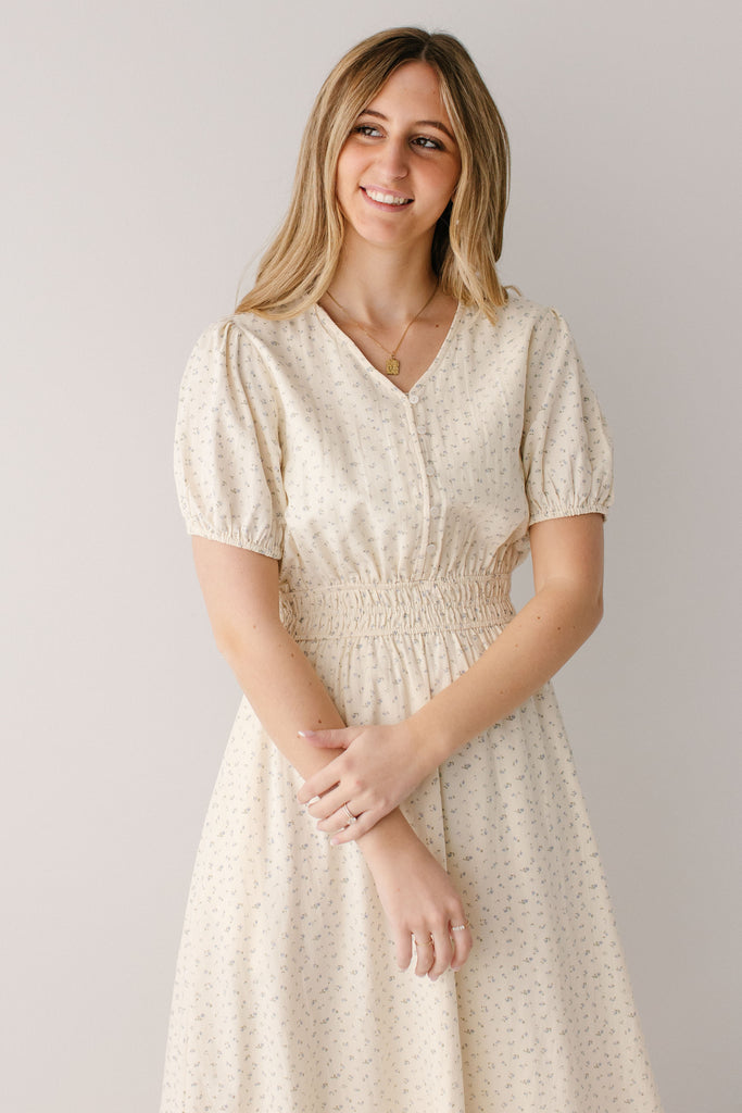 With its dainty floral print, high V-neckline, functional buttons on the bodice, triple elastic waistband, ruffle hem, and full lining, what’s not to love about the 'Elsie' Blue Ditsy Floral Midi Dress? Add this dress to your spring rotation and pair with some chunky heels and a hair bow for the cutest outfit to go on a sunset picnic.