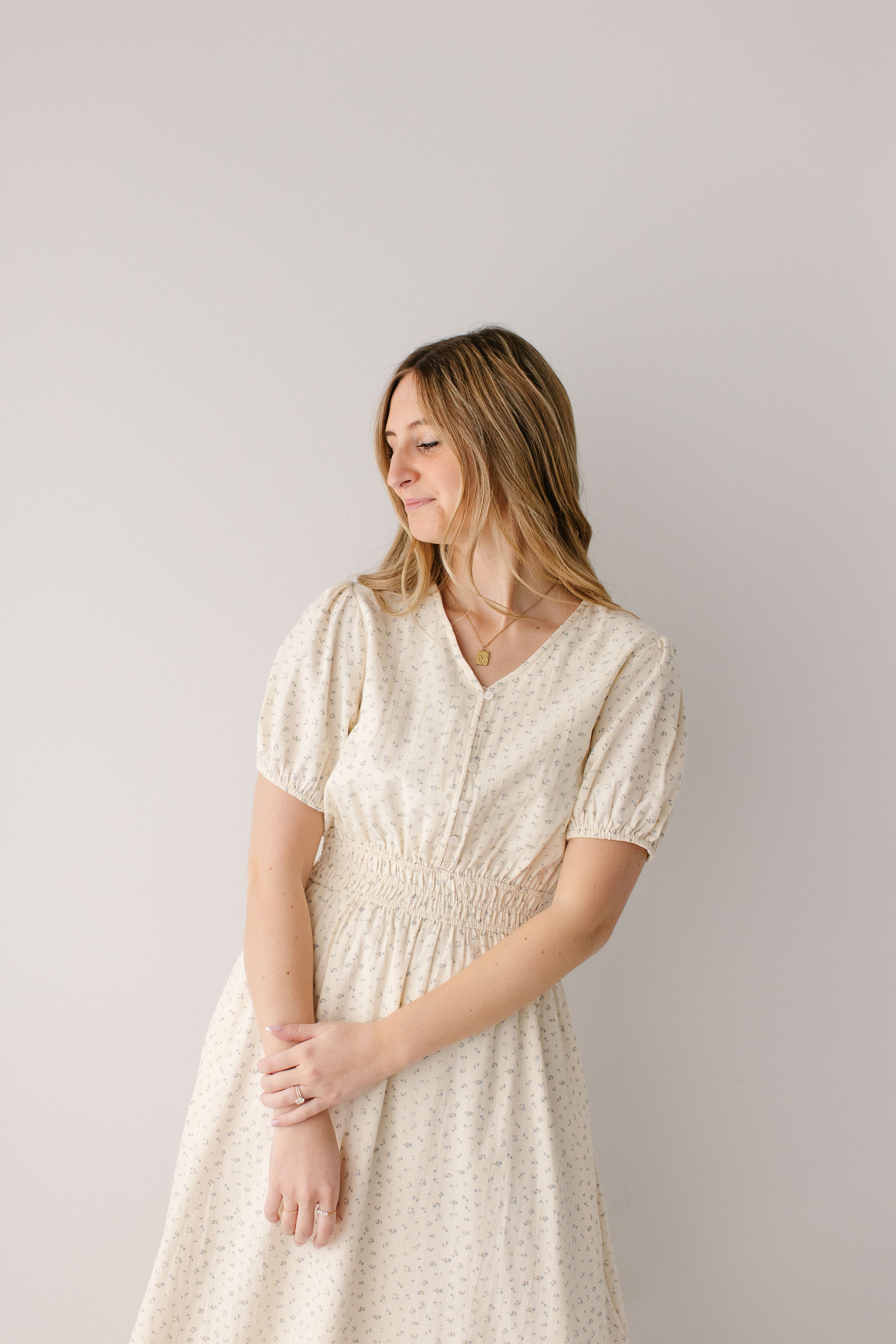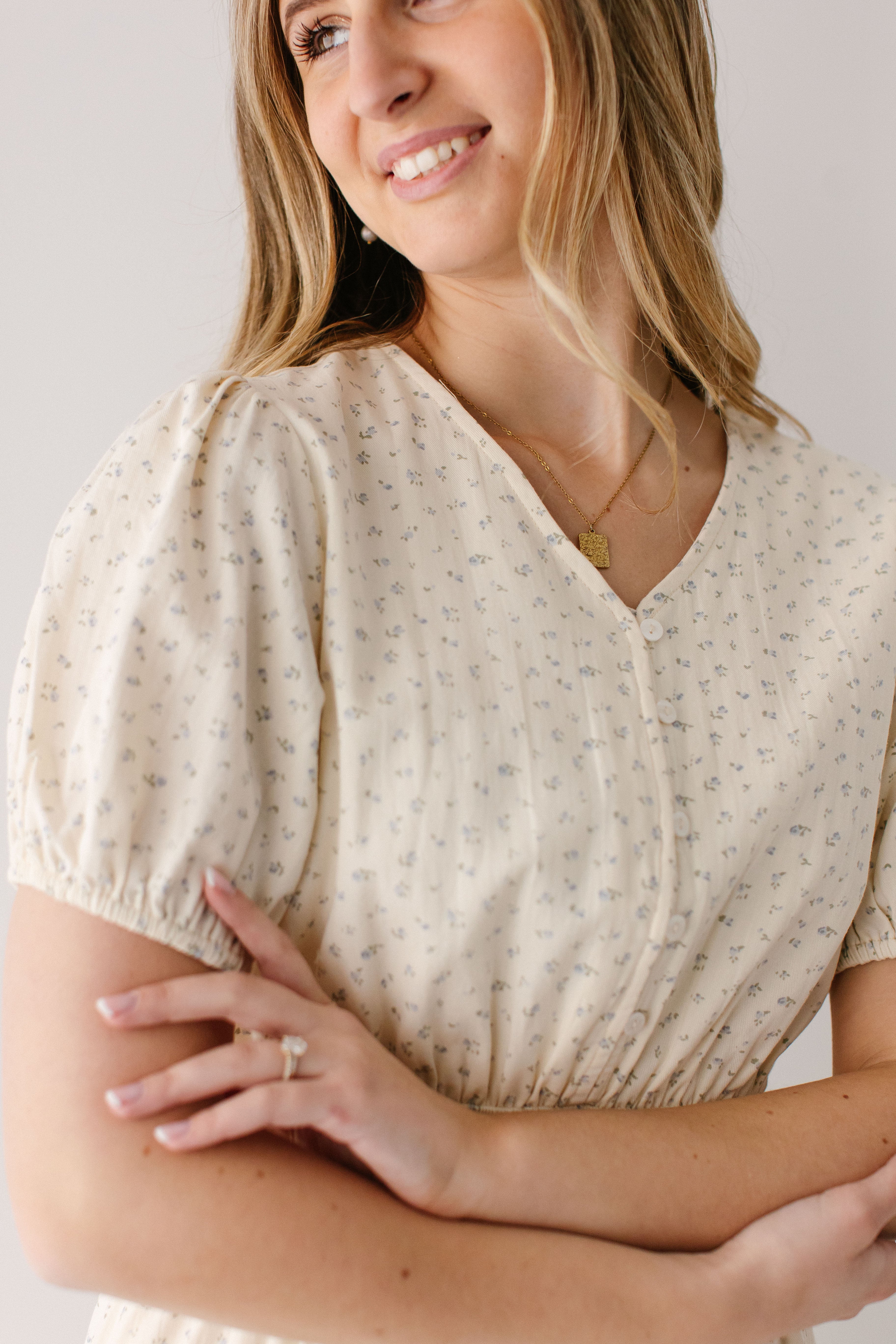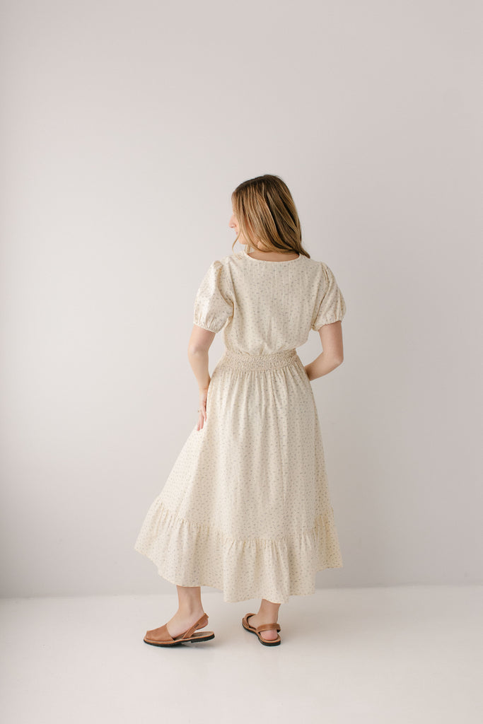 With its dainty floral print, high V-neckline, functional buttons on the bodice, triple elastic waistband, ruffle hem, and full lining, what’s not to love about the 'Elsie' Blue Ditsy Floral Midi Dress? Add this dress to your spring rotation and pair with some chunky heels and a hair bow for the cutest outfit to go on a sunset picnic.