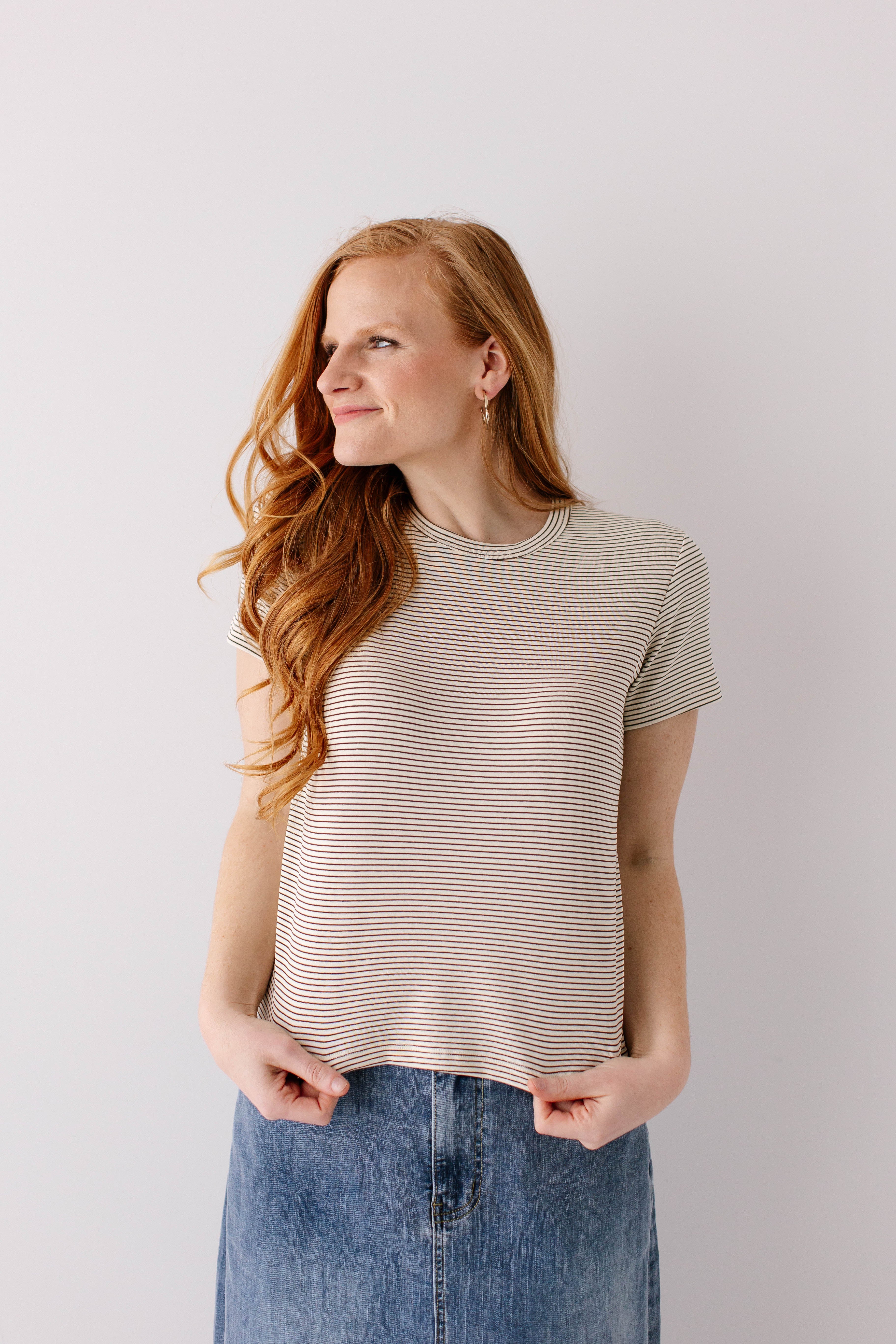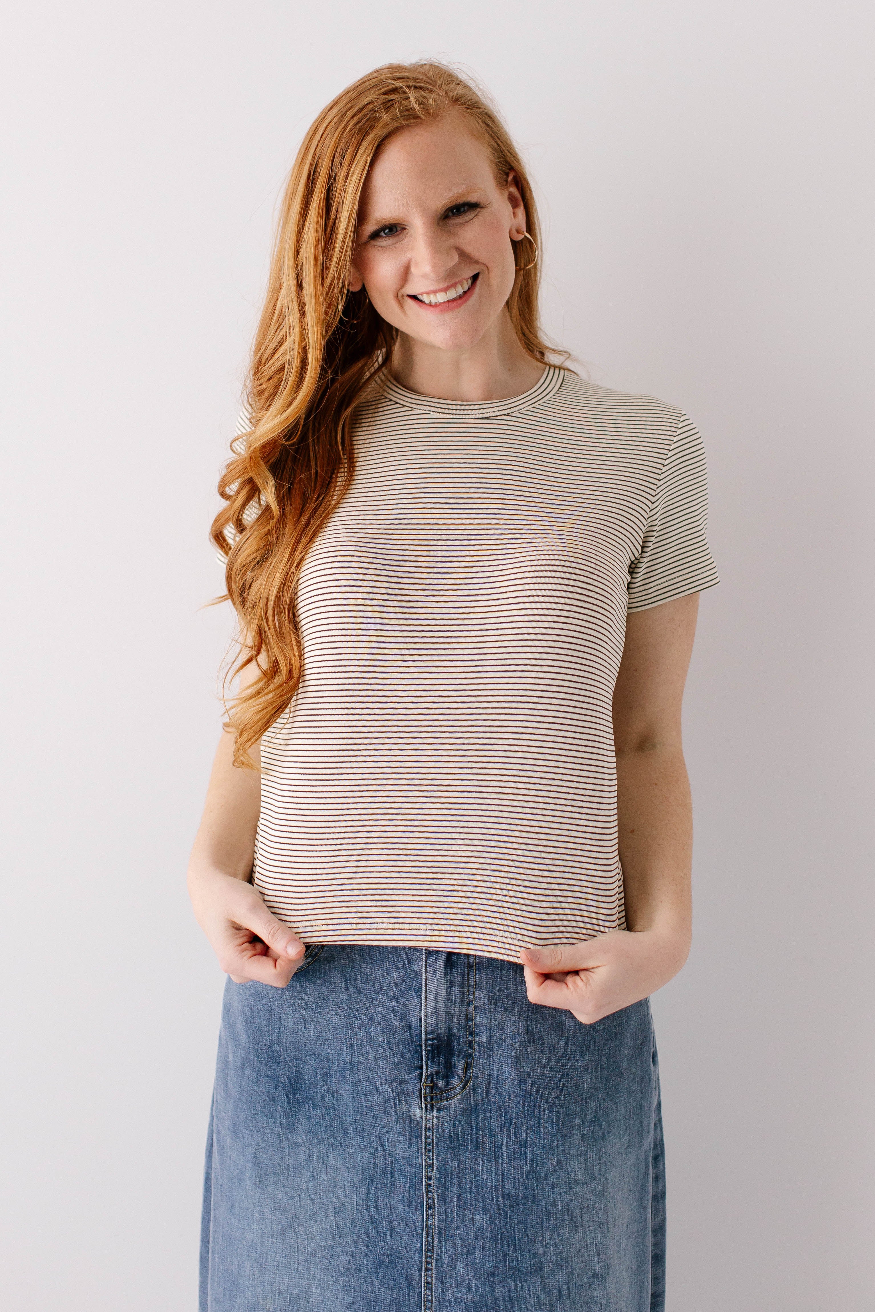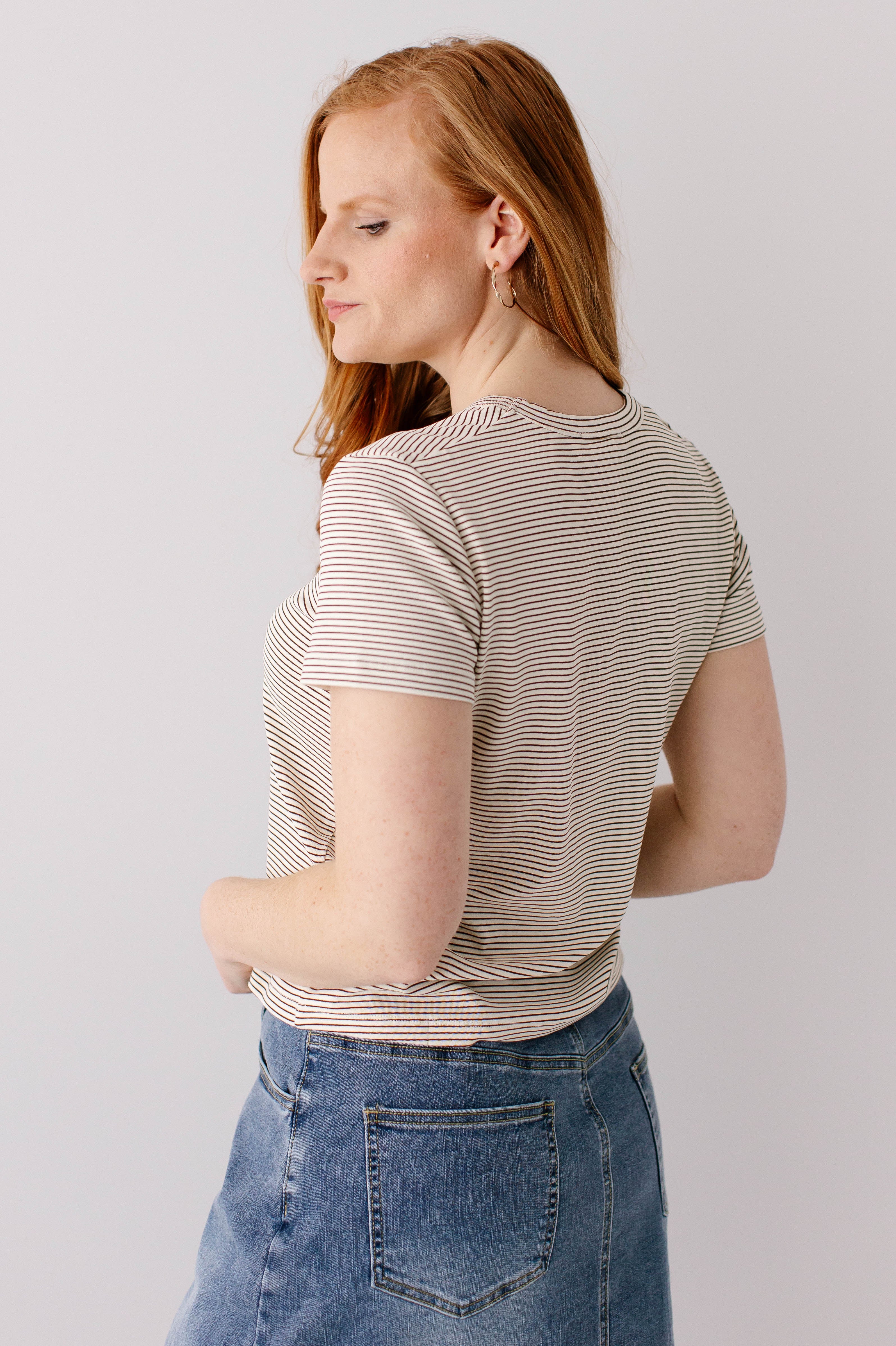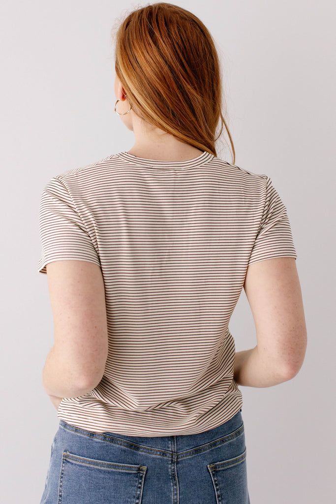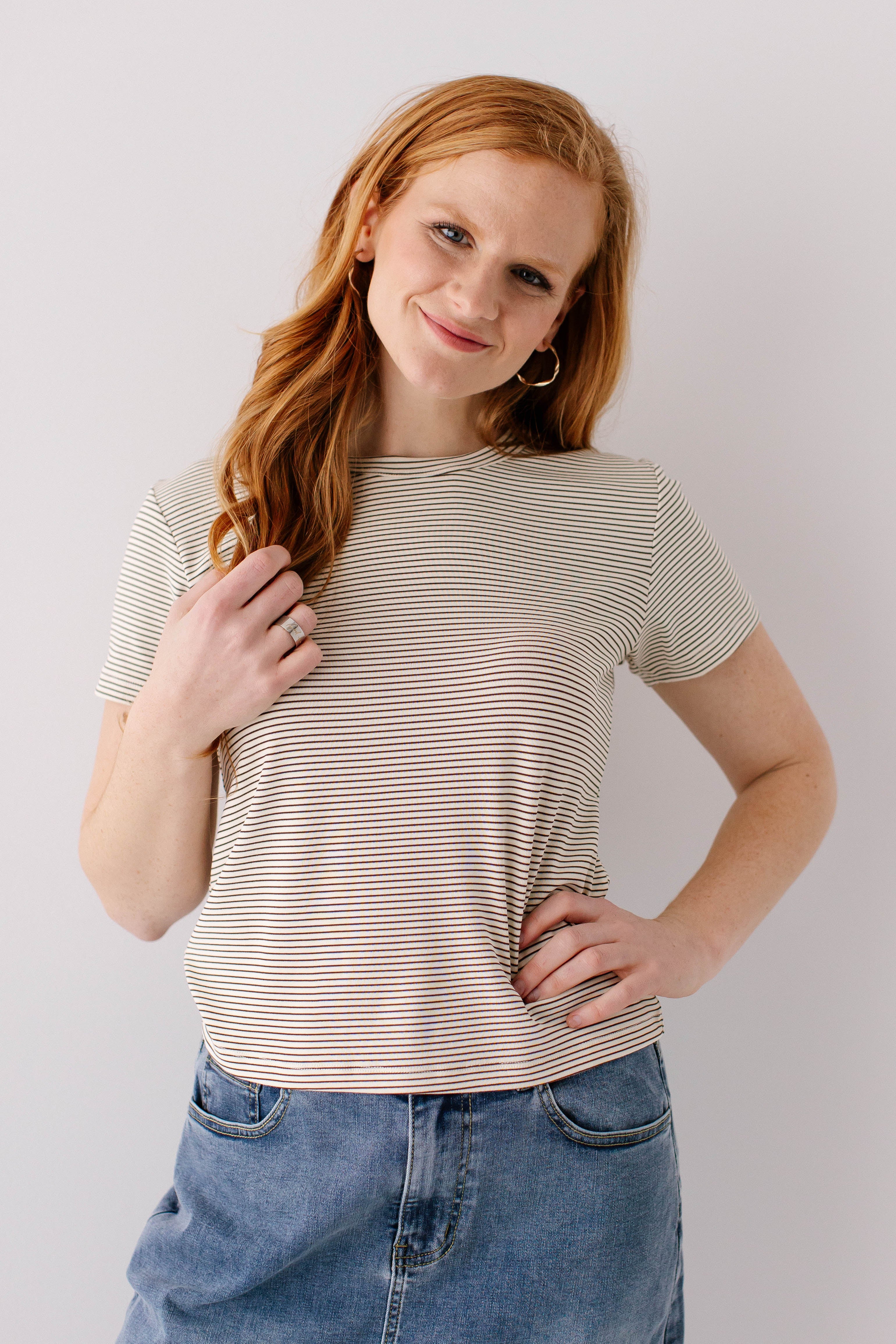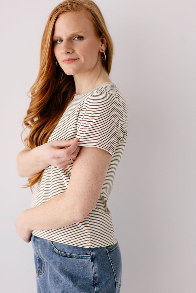 The best pieces are the perfect elevated everyday essentials. The 'Erik' Pinstripe Top is designed in a fitted style featuring a deep brown pinstripe. This top is made from a high quality, soft knit fabric that pairs so well with denim or an A-line style skirt. Wear the ‘Erik’ the next time you run errands.
