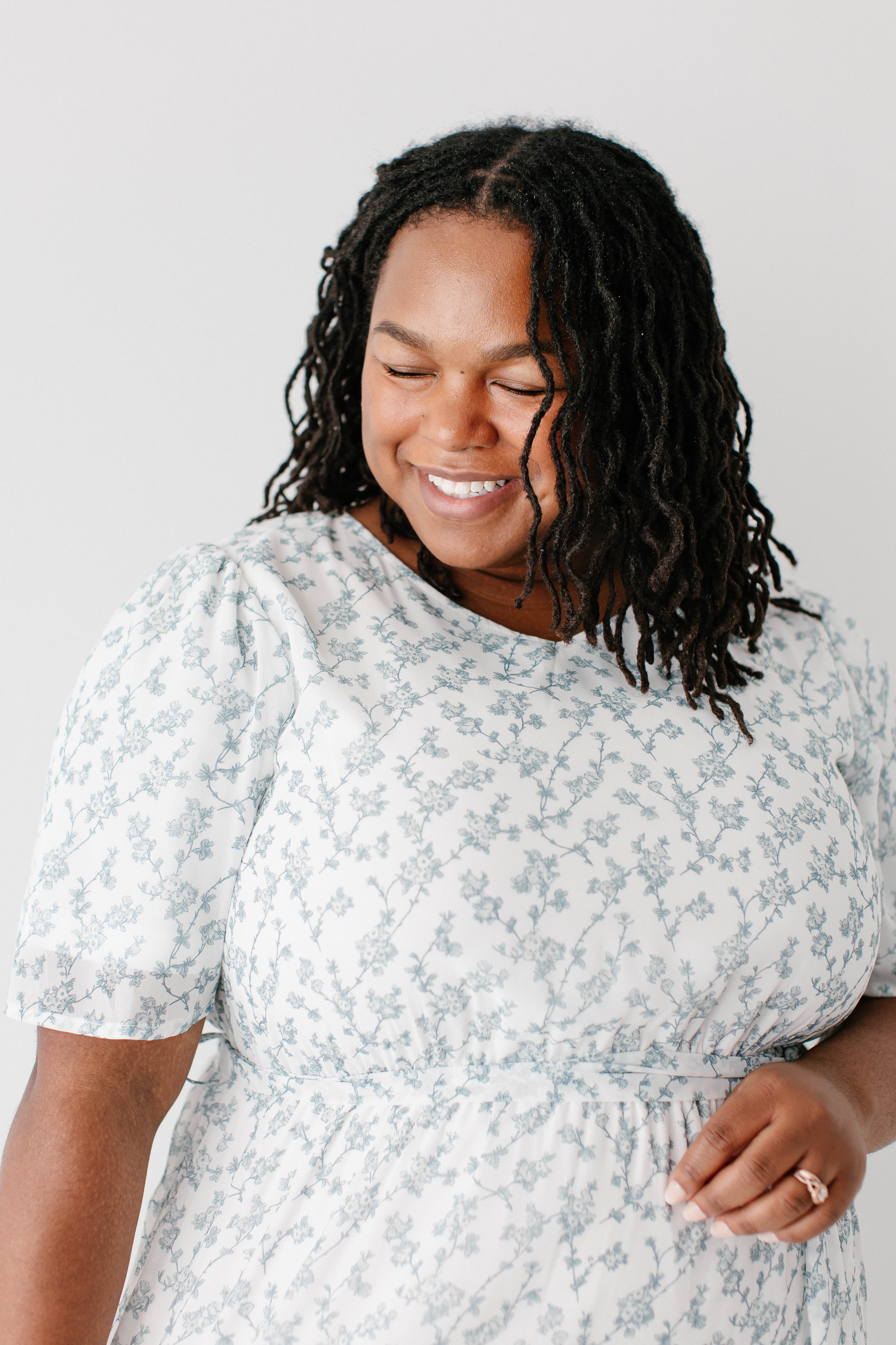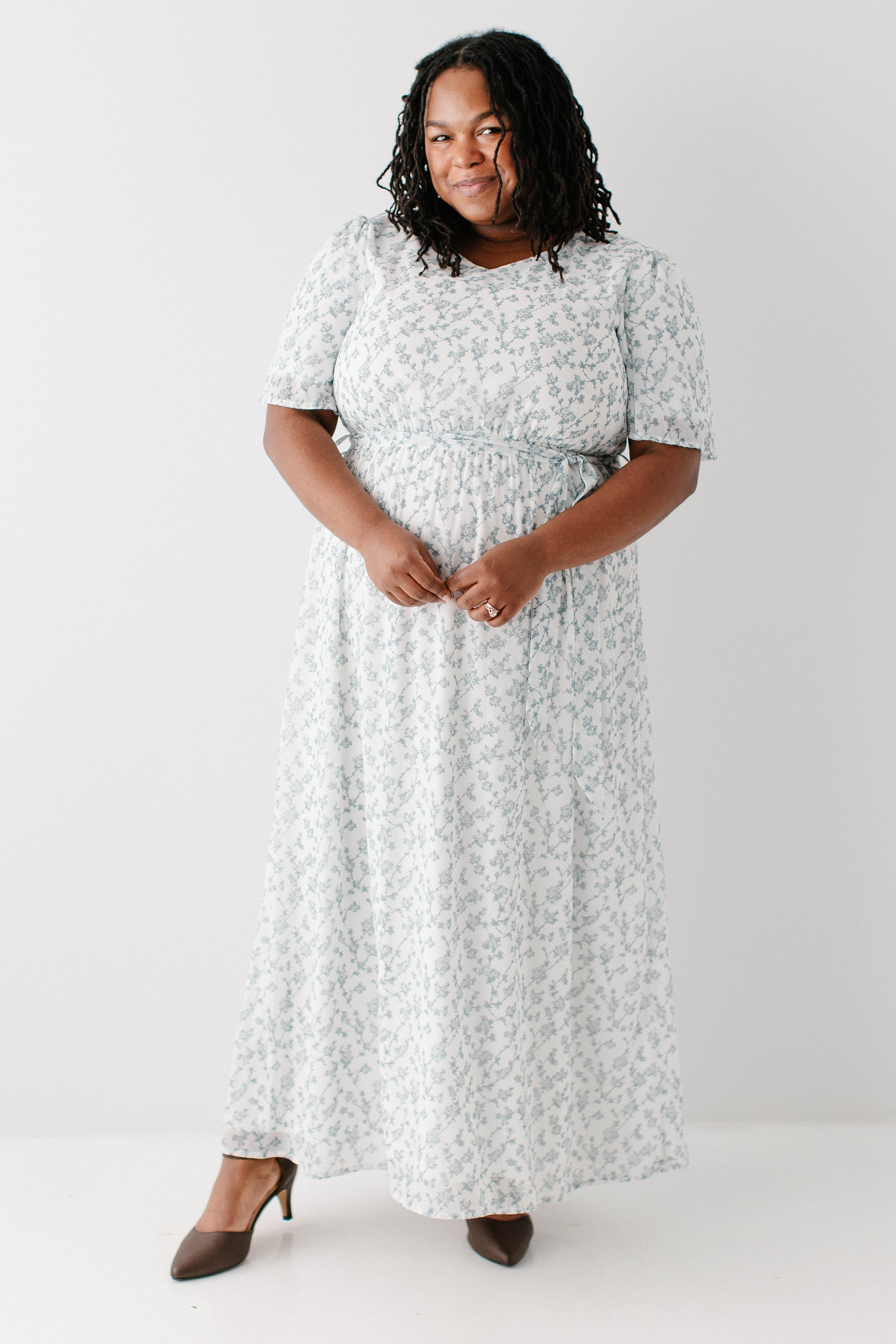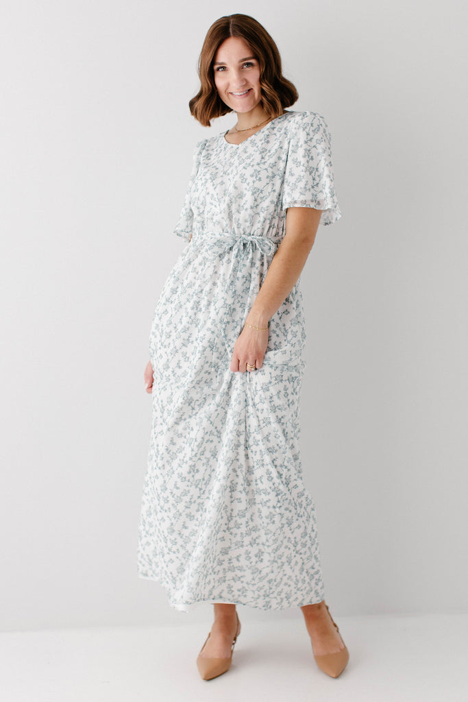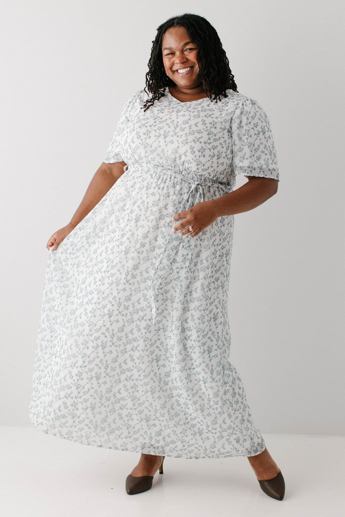 Our bestselling design that will soon become your favorite elegant staple! The 'Esther' Floral Print Maxi Dress is back in the same elegant design, but in a stunning white color and sage floral design that is so beautiful! The 'Esther' is fully lined and features an elastic waistband + a tie! The small V-neck is modest and so feminine. We created the same dress in girl sizes, so you both can wear it! Perfect for a mama and me look, or family pictures. Exclusively designed by us with you in mind!